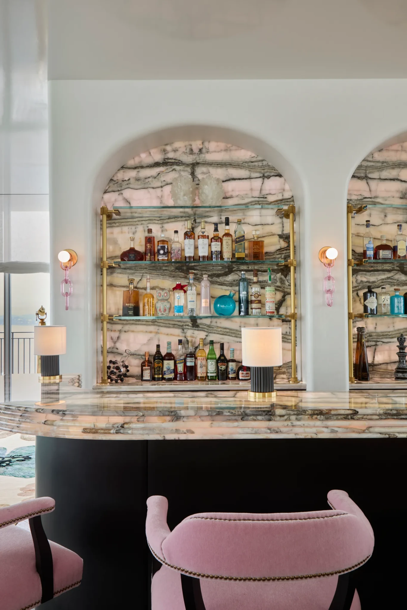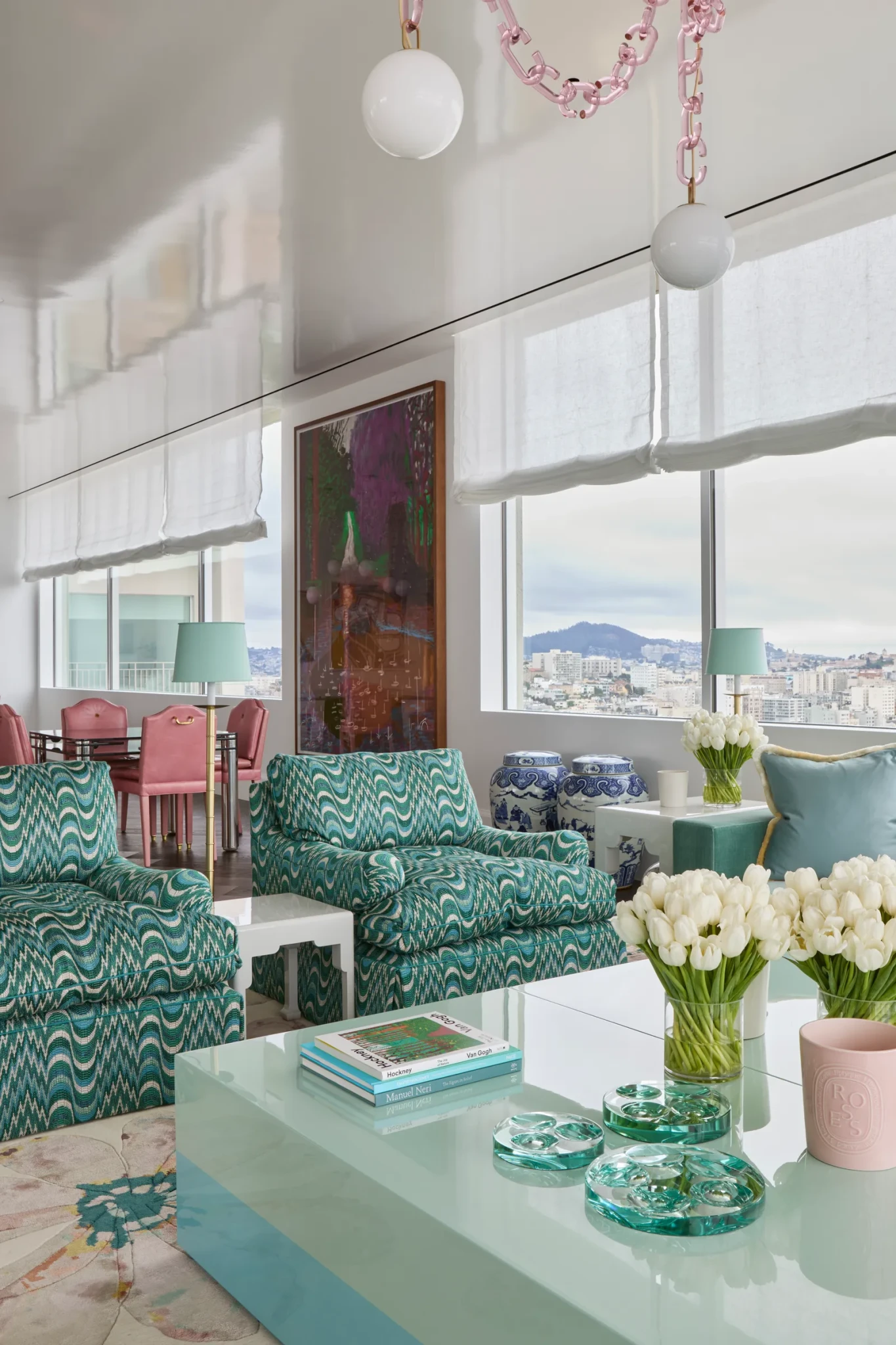 Το σαλόνι υποδέχεται τους καλεσμένους του με ένα εντυπωσιακό μπαρ από ροζ ονυχίτη με κρυφό φωτισμό και μια disco ball. Μπροστά του στέκονται ροζ βελούδινα σκαμπό και δύο πολυθρόνες από το Hotel Costes στο Παρίσι, με βελούδινες τιγρέ ταπετσαρίες δημιουργώντας μια υπέροχη αντίθεση. Η χρωματική παλέτα του υπόλοιπου καθιστικού είναι εμπνευσμένη από τη θάλασσα του San Francisco, ενώ τον χώρο συμπληρώνουν ιδιαίτερα αντικείμενα όπως ένας βελούδινος καναπές, πολυθρόνες από τη συλλογή «The Warborough Collection» κι ένα χαλί Anemone σε ειδικό χρώμα από τη "The Rug Company". Σε ένα επιπλέον και πιο casual καθιστικό ο καναπές είναι Sedilla.