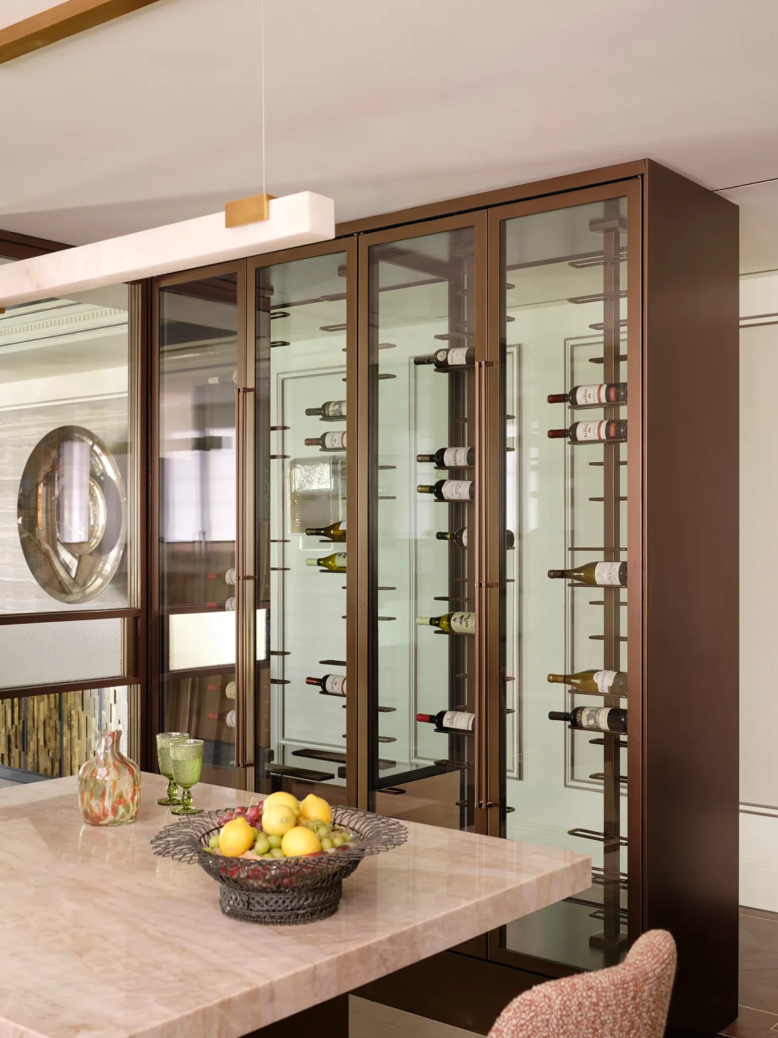 Ιδιαίτερο ενδιαφέρον παρουσιάζει η ενσωματωμένη κάβα κρασιών, η οποία λειτουργεί όχι μόνο ως αποθηκευτικός χώρος αλλά και ως εντυπωσιακό αρχιτεκτονικό στοιχείο. Ορατή από διαφορετικές πλευρές, δημιουργεί την αίσθηση ενός περάσματος που συνδέει τους χώρους, ενισχύοντας τη συνοχή και τη θεατρικότητα της κατοικίας. Παράλληλα, η ύπαρξή της υποδηλώνει τη σημασία που δίνεται στη φιλοξενία και στη συλλογική εμπειρία.