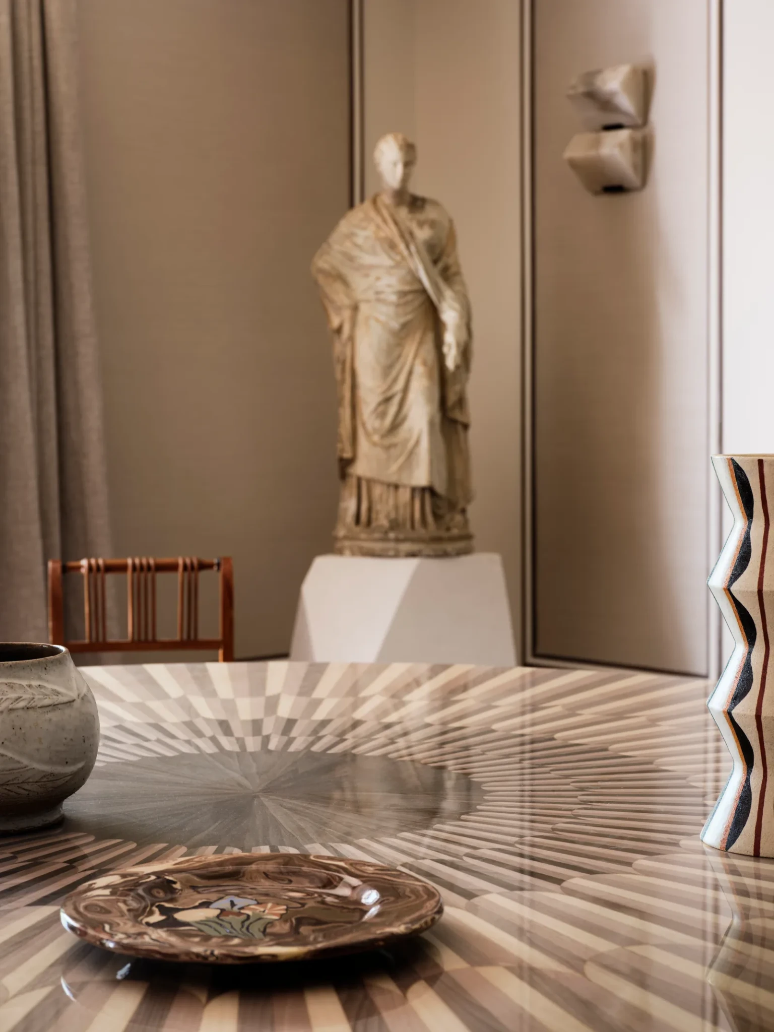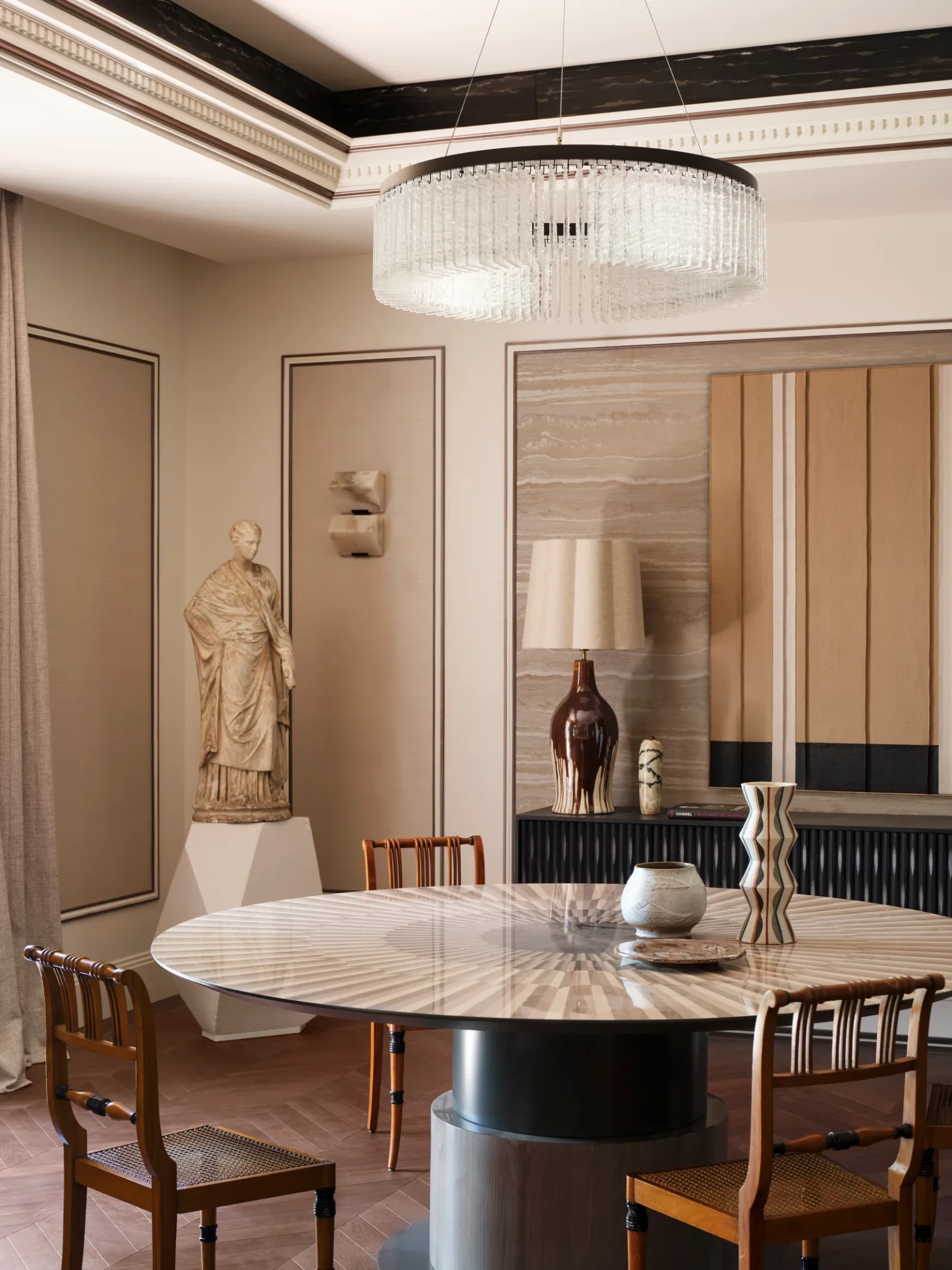 Ο σχεδιασμός του διαμερίσματος αναπτύσσεται ως μια ενιαία καλλιτεχνική αφήγηση, όπου κάθε δωμάτιο αντιμετωπίζεται ως αυτόνομο έργο τέχνης. Οι επιρροές αντλούνται από την κοσμοπολίτικη ενέργεια της Μαδρίτης και την εκλεπτυσμένη δεξιοτεχνία της γαλλικής διακοσμητικής παράδοσης, δημιουργώντας έναν διάλογο ανάμεσα στο παρελθόν και το παρόν. Το αποτέλεσμα είναι μια σύνθεση που δεν αντιγράφει, αλλά επαναπροσδιορίζει την έννοια της κλασικής κομψότητας με σύγχρονους όρους.