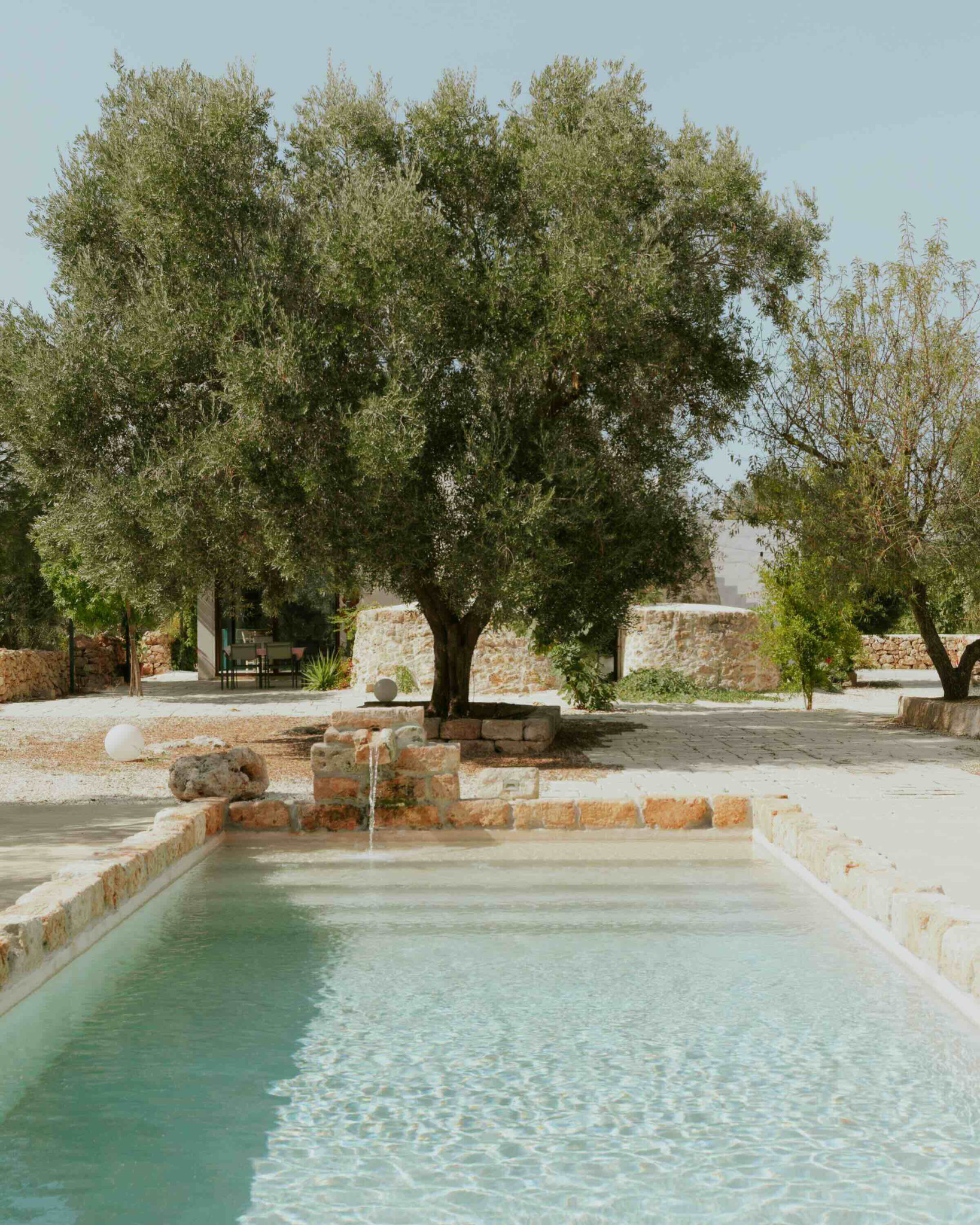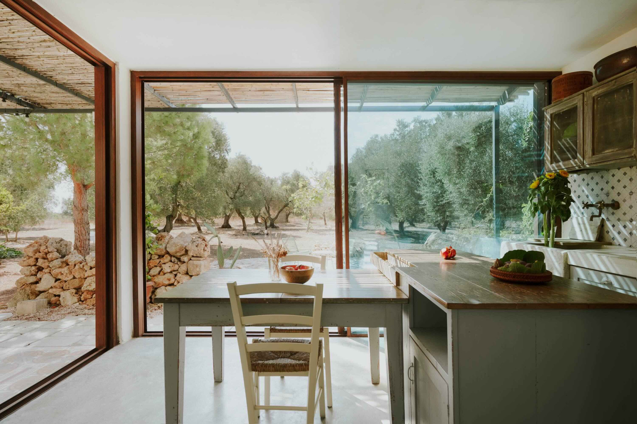 Τα δύο κτίσματα συνδέονται μέσω μιας σκεπαστής βεράντας, η οποία λειτουργεί ως φυσική προέκταση των εσωτερικών χώρων προς το ύπαιθρο. Εκεί, ανάμεσα στα δέντρα και τη σκιά τους, οι επισκέπτες μπορούν να απολαύσουν μπάνιο στην πισίνα και άφθονο χώρο για χαλάρωση, ανάγνωση ή απλή παρατήρηση της φύσης.