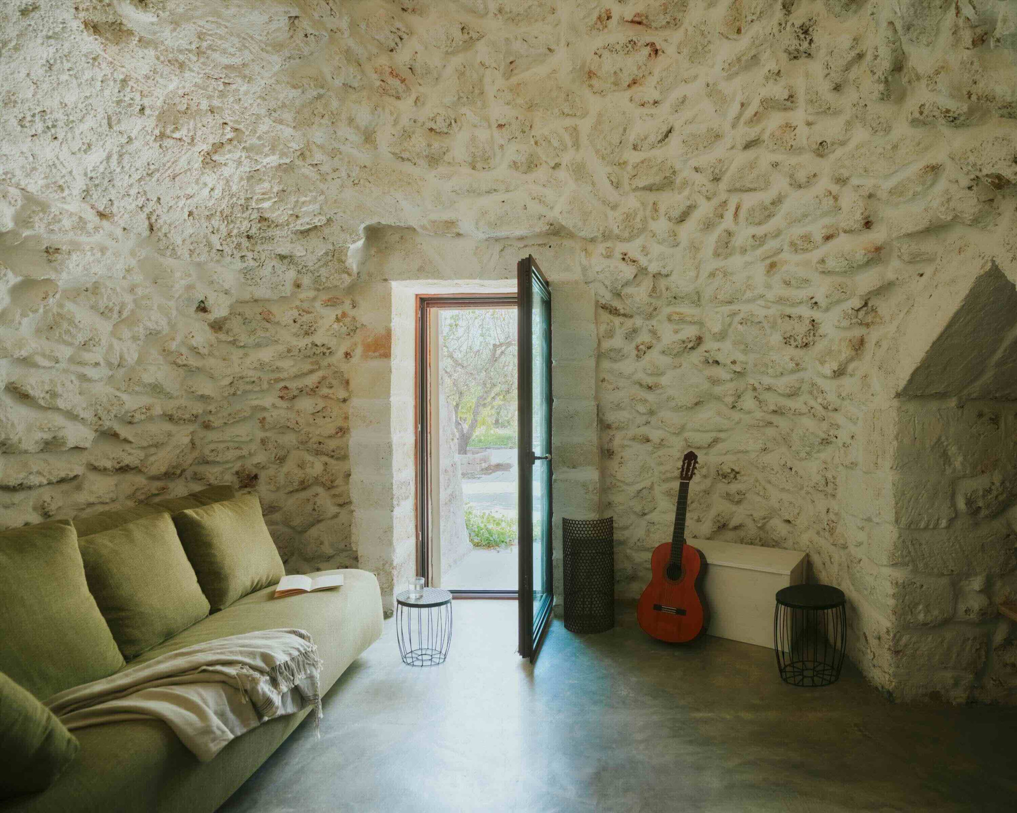 Ενώ το εξωτερικό του συγκροτήματος διατηρεί μια λιτή και καθαρόγραμμη αισθητική, το εσωτερικό αποκαλύπτει πλούσια αρχιτεκτονικά στοιχεία: επιβλητικές θολωτές οροφές, αυθεντικές δομές και ενδιαφέρουσες μεταβάσεις μεταξύ υλικών που αφηγούνται την ιστορία της κατασκευής. Ο σχεδιασμός αποφεύγει επιδεικτικές παρεμβάσεις, επιλέγοντας μια διακριτική σύνθεση λιτότητας, αυθεντικότητας και σύγχρονης άνεσης.