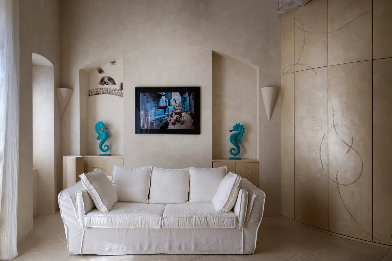 Οι καμπύλες και οι απαλές γραμμές που διατρέχουν το διαμέρισμα αποφεύγουν την αυστηρή γεωμετρία, δίνοντας μια αίσθηση κίνησης και ροής. Οι τοίχοι, σαν να έχουν διαμορφωθεί από τα στοιχεία της φύσης, αποπνέουν ζεστασιά και φυσικότητα, ενώ το χειροποίητο φινίρισμα αναδεικνύει τη μοναδικότητα του κάθε στοιχείου. Η δόμηση με γνώμονα την αρμονία και την αίσθηση της συνέχειας καθιστά τον χώρο ζωντανό και φιλόξενο, μια πραγματική όαση ηρεμίας μέσα στο πολύβουο τοπίο.