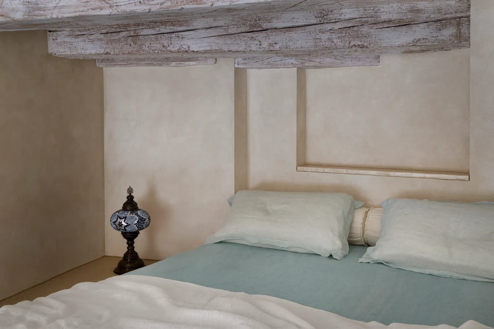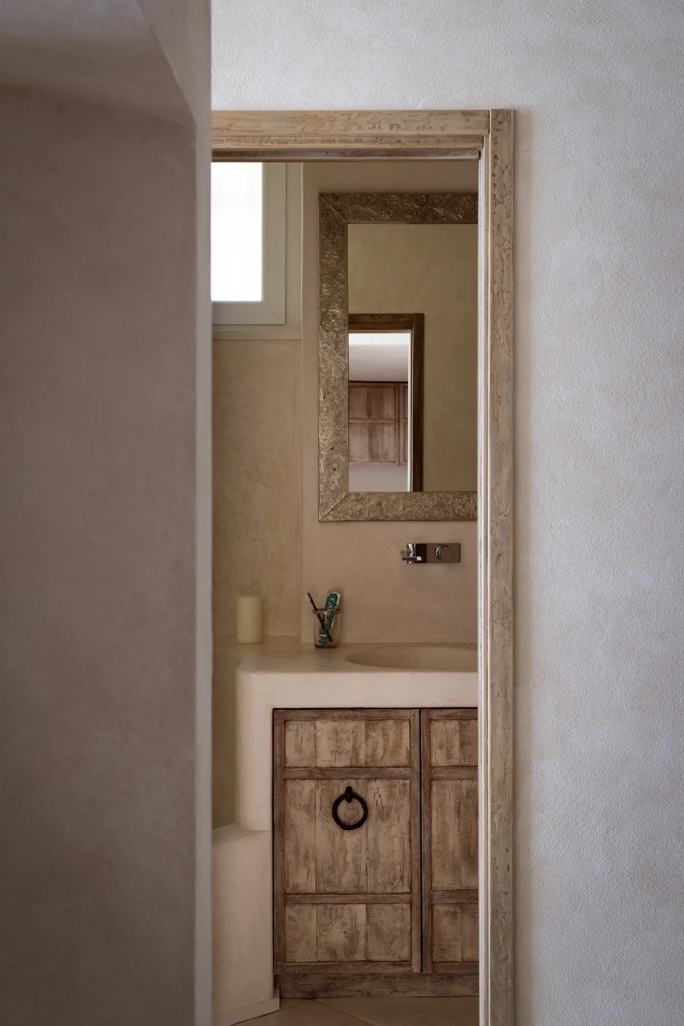 Το κυρίως μπάνιο εντυπωσιάζει με την μασίφ μπανιέρα, η οποία είναι επενδυμένη με το παραδοσιακό μαροκινό Tadelakt, χαρίζοντας μια εξωτική πινελιά που αρμονικά συνδυάζεται με το απλό, νησιώτικο ύφος του χώρου. Το δεύτερο μπάνιο, που προέκυψε από την αναδιαμόρφωση ενός δευτερεύοντος χώρου, μετατράπηκε σε μια ντουζιέρα λαξευμένη μέσα στον βράχο - μια σχεδόν φυσική σπηλιά όπου το νερό γίνεται στοιχείο απόλυτης χαλάρωσης και αναζωογόνησης.