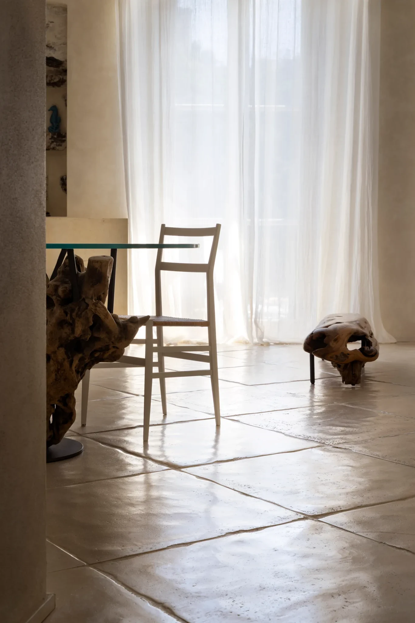Η τραπεζαρία αποτελεί το κέντρο της κοινωνικής ζωής του σπιτιού, με ένα μοναδικό τραπέζι από κορμό ελιάς και γυαλί, αποτέλεσμα της τέχνης των τεχνιτών του Τρέντο. Οι καρέκλες Superleggera της Cassina, εμβληματικό δείγμα ιταλικής σχεδίασης, προσθέτουν μια διακριτική κομψότητα, ενώ τα υφασμάτινα καθίσματα που κατασκευάστηκαν αποκλειστικά από την Villa Italo συνδυάζουν άνεση και στιλ. Κάθε έπιπλο φέρει τη σφραγίδα της μοναδικότητας, συνθέτοντας ένα περιβάλλον φιλόξενο και εκλεπτυσμένο.