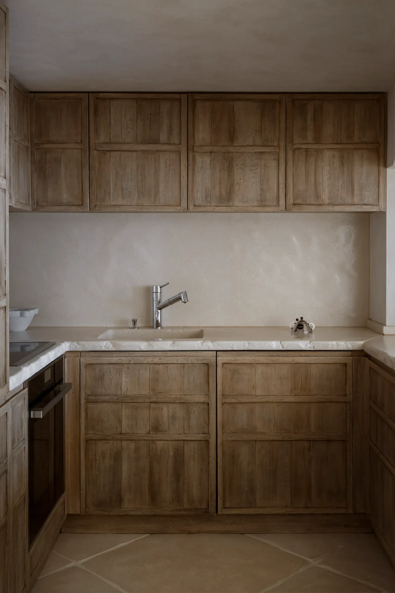 Τα φυσικά υλικά που επιλέχθηκαν είναι η ψυχή του χώρου. Το παλαιωμένο ξύλο και η πελεκημένη πέτρα ενσωματώνουν την παράδοση και την τοπική κουλτούρα, ενώ η υφή τους προσκαλεί σε μια άμεση επαφή με το περιβάλλον. Το πάτωμα, με την απαλή του απόχρωση, θυμίζει την άμμο και δίνει αίσθηση ζεστασιάς και φυσικότητας, ενώ το ίδιο υλικό χρησιμοποιείται με επιδέξιο τρόπο και στις κουζίνες και στα σκαλοπάτια, δημιουργώντας μια ενιαία αισθητική γλώσσα.