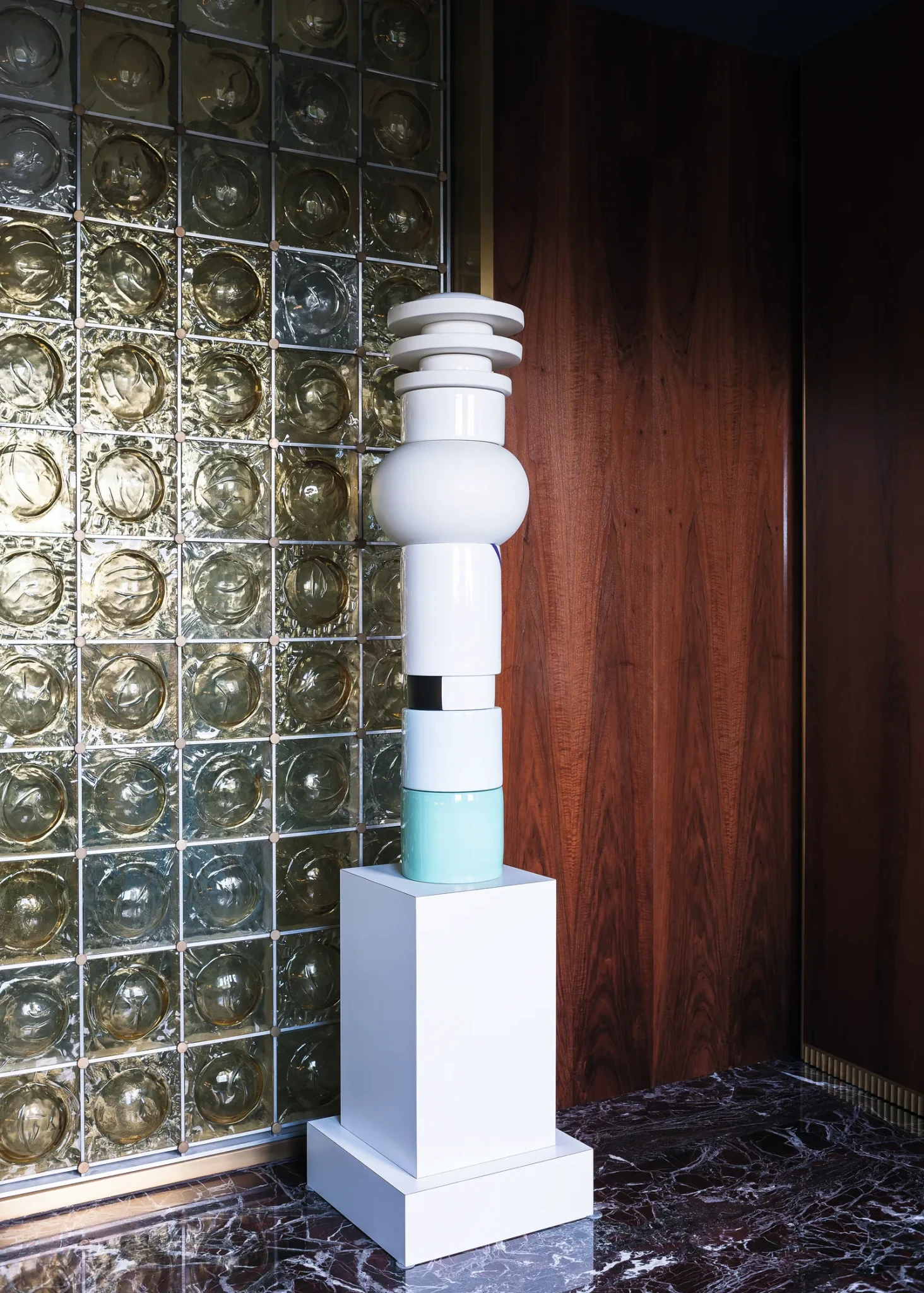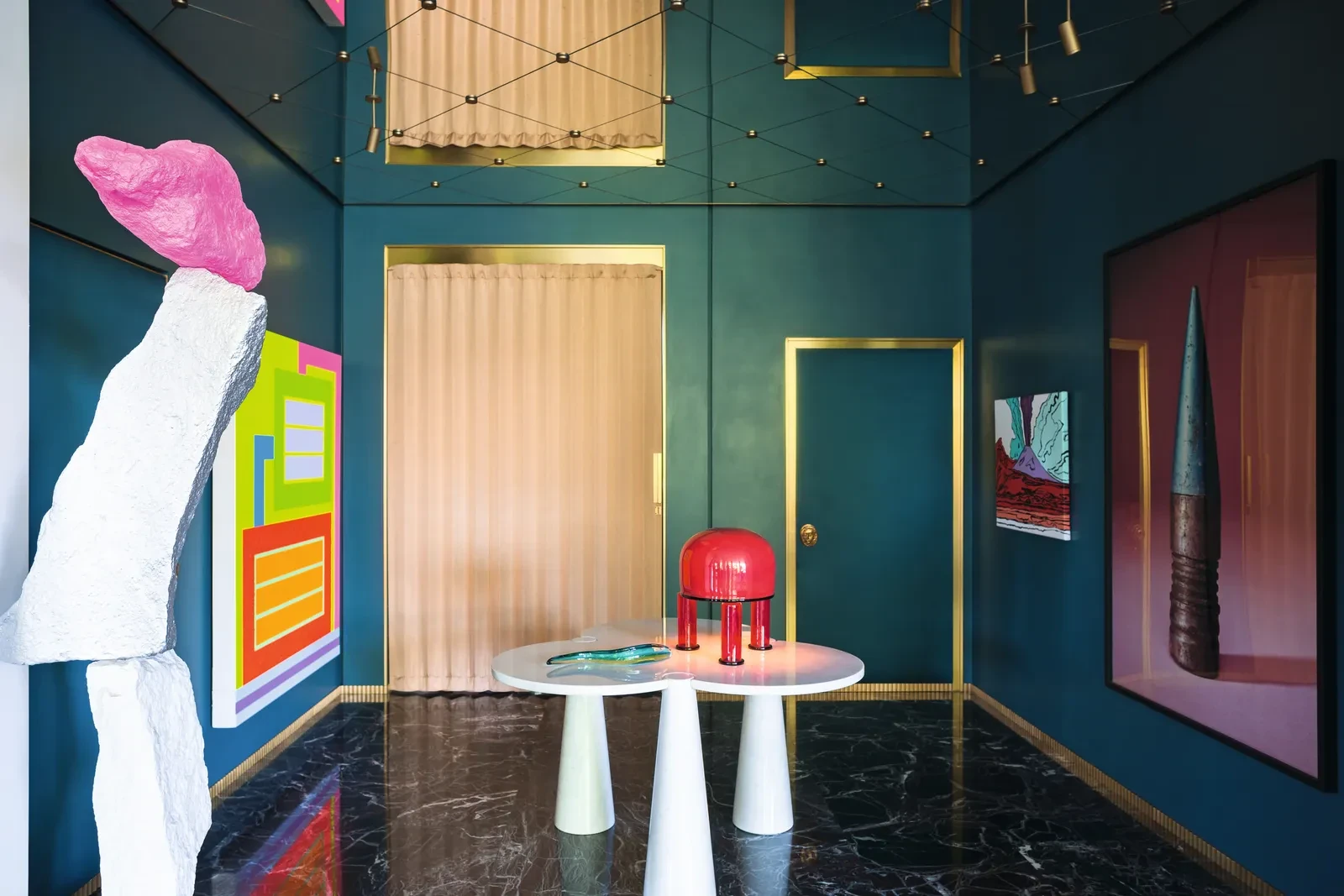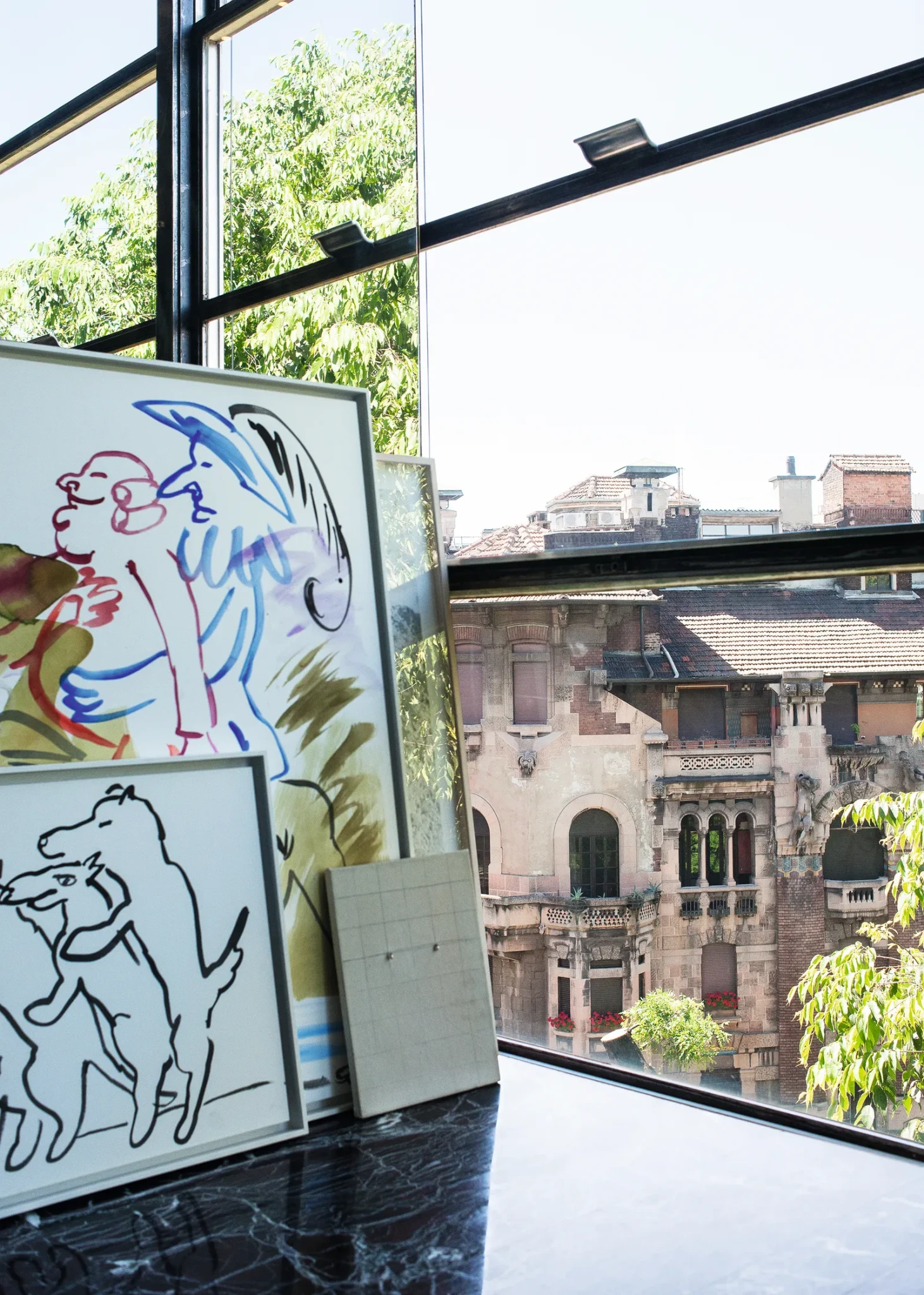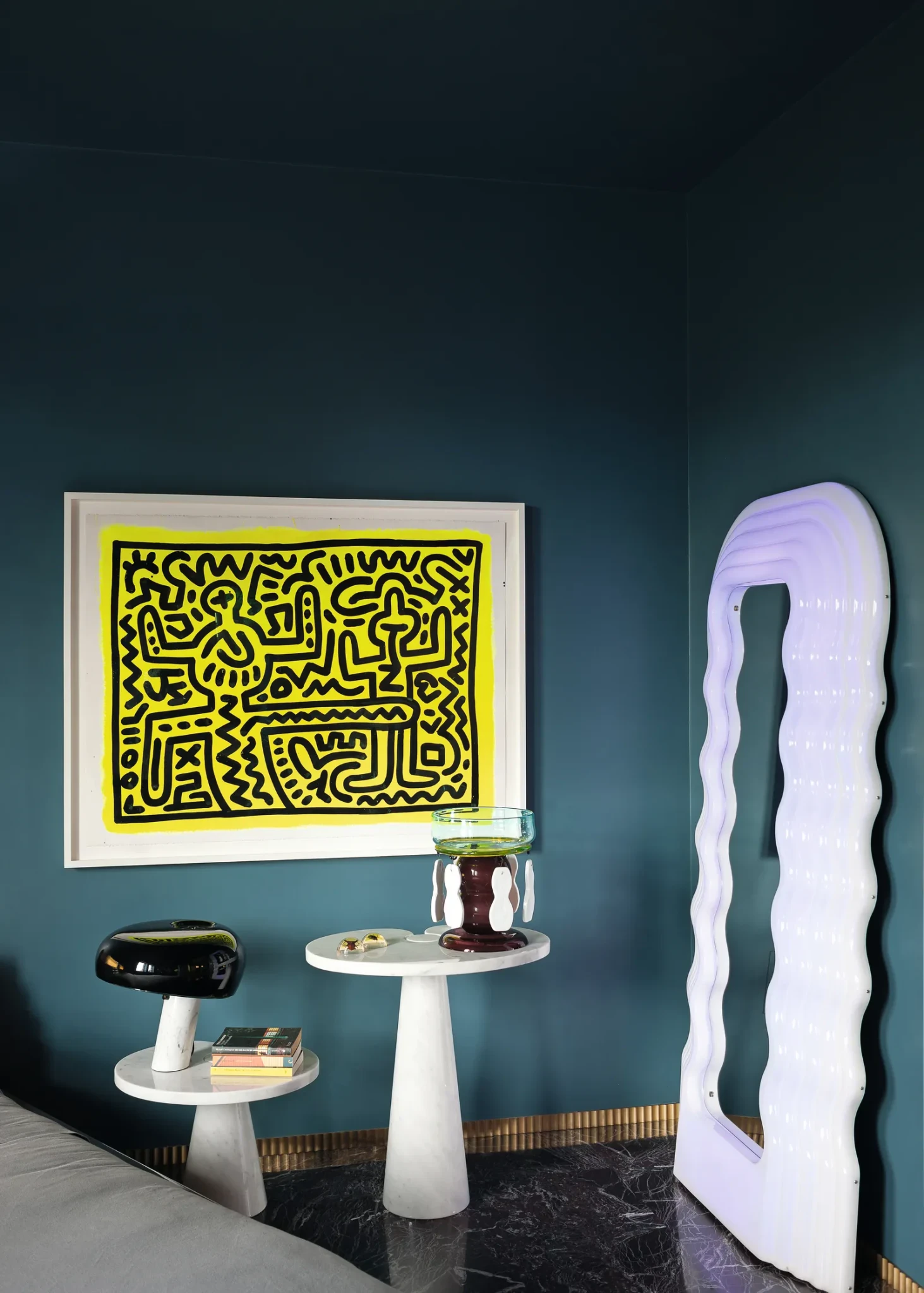 Η κατοικία φιλοξενεί επίσης έργα σύγχρονης τέχνης που έρχονται σε διάλογο με τα αντικείμενα των ’80s. Καθρέφτες του Daniel Buren, φωτεινά ακρυλικά του Peter Halley, έργα του Keith Haring και πολύχρωμα γλυπτά του Ugo Rondinone συνυπάρχουν με την ευαισθησία των έργων της Vanessa Beecroft και τις δυναμικές συνθέσεις του Francesco Vezzoli. Κάθε αντικείμενο αλλάζει συνεχώς τη διάθεση του χώρου, προσδίδοντας νέα διάσταση στην εμπειρία κατοίκησης και επιβεβαιώνοντας την ανήσυχη, πειραματική φύση του ιδιοκτήτη. Η σφραγίδα του Bombassei είναι παντού, από τον ζωντανό χρωματικό διάκοσμο έως τα πρωτοποριακά υλικά που συνδυάζει με τόλμη.