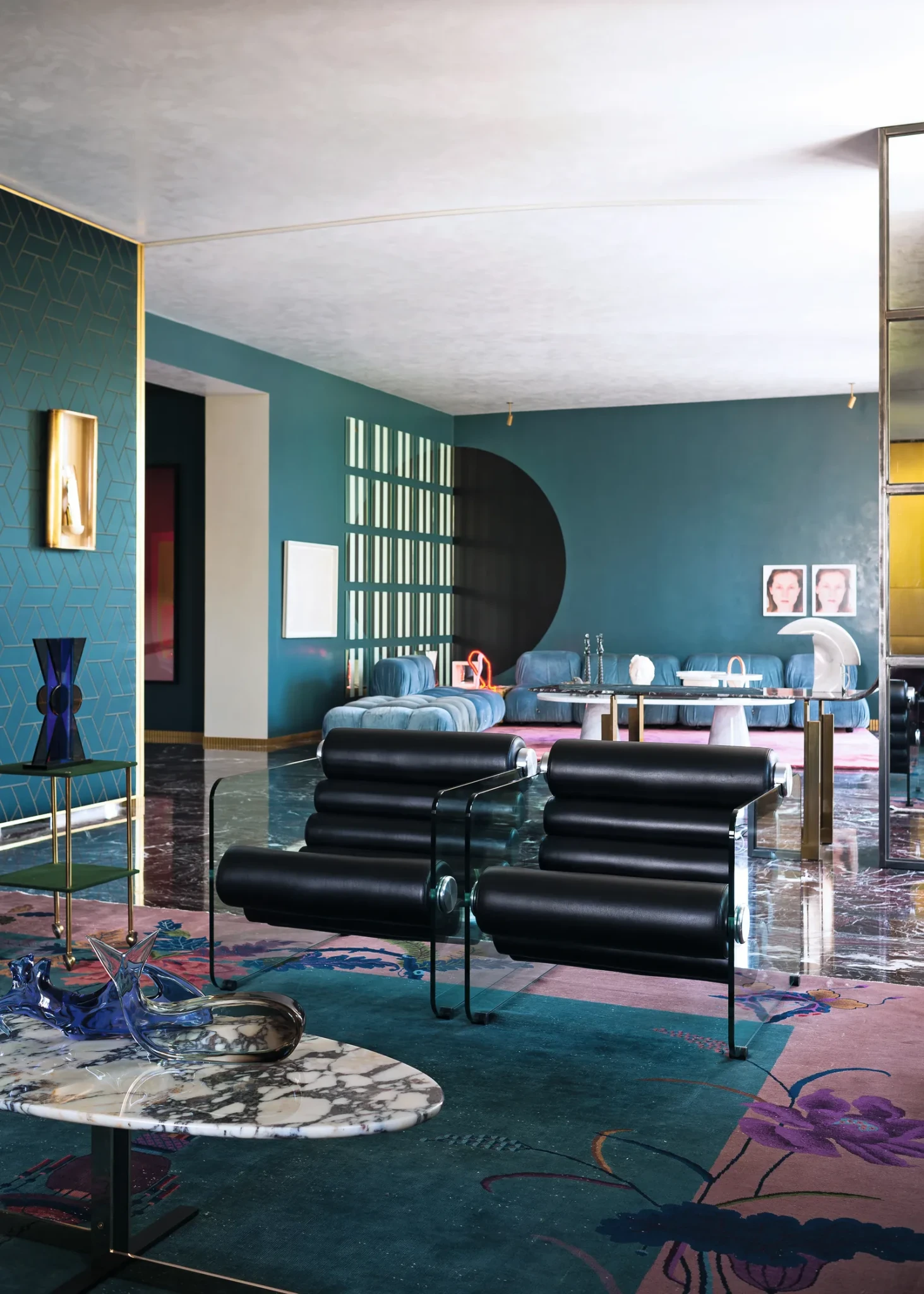 Το πνεύμα της δεκαετίας του ’80 διαποτίζει κάθε γωνιά της κατοικίας. Οι έντονες χρωματικές αντιθέσεις, από το βαθύ μπλε των τοίχων μέχρι το κόκκινο μάρμαρο Levanto, συνδυάζονται με new-age πινελιές, πολύχρωμα χαλιά και έπιπλα–σύμβολα της εποχής. Η επιρροή του Ettore Sottsass και του Mario Bellini είναι εμφανής στα πολυμορφικά καθίσματα Camaleonda, ενώ τα καθίσματα Hyaline του Fabio Lenci και το γλυπτικό κάθισμα Ekstrem του Terje Ekstrøm ενισχύουν τη νεανική, πειραματική διάθεση. Η τραπεζαρία Eros του Angelo Mangiarotti και το καβαλέτο του Carlo Scarpa από το Museo Correr, πάνω στο οποίο ακουμπά έργο του Lucio Fontana, συνδέουν αρμονικά το παρελθόν με τη σύγχρονη αισθητική, ενώ αναδεικνύουν τη βαθιά αγάπη του Bombassei για την τέχνη και τη συλλογή μοναδικών αντικειμένων.