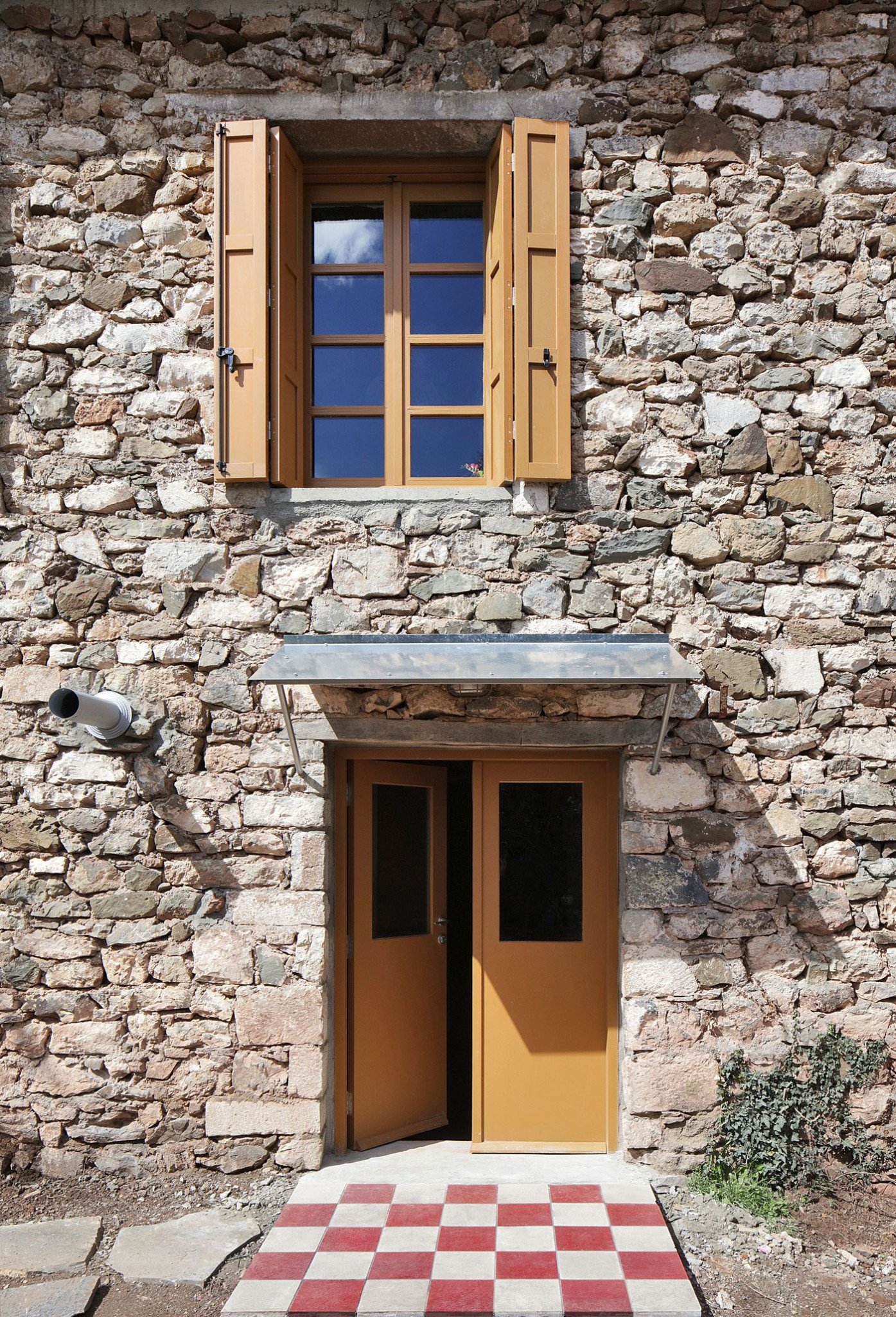Η παρέμβαση αντιμετωπίστηκε σαν διαδικασία «ανασκαφής». Οι πέτρινοι τοίχοι αποκαλύφθηκαν και ενισχύθηκαν με αδρό σκυρόδεμα, οι ξύλινες επιφάνειες συντηρήθηκαν, ενώ οι πρωτότυπες αποχρώσεις των κουφωμάτων – μουσταρδί, φιστικί και κεραμιδί – διατηρήθηκαν, σεβόμενες τις αυθόρμητες επιλογές των παλιών μαστόρων. Η στέγη από κυματοειδές αλουμίνιο, στοιχείο τυπικό για βοηθητικές αγροτικές κατασκευές, ξαναχτίστηκε και σταθεροποιήθηκε με πέτρες, επαναφέροντας μια πρακτική που συνδέεται με τη σοφία της παράδοσης.