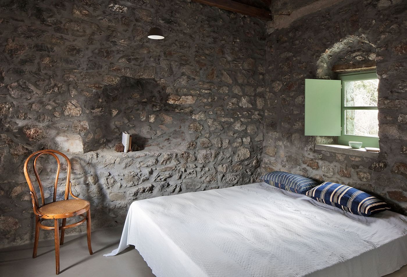 Η νέα διαρρύθμιση οργανώθηκε με στόχο να εξυπηρετεί τον σύγχρονο οικογενειακό τρόπο ζωής. Στον επάνω όροφο συγκεντρώνονται οι χώροι συνύπαρξης. Το καθιστικό με τζάκι, η κουζίνα με ενσωματωμένο ντιβάνι και το υπνοδωμάτιο των γονιών. Το ισόγειο, που άλλοτε φιλοξενούσε ζώα, διατήρησε τις πέτρινες θολωτές κατασκευές του, καθεμιά από τις οποίες μετατράπηκε σε παιδικό υπνοδωμάτιο. Οι αρχιτέκτονες απέφυγαν τα μόνιμα χωρίσματα και προτίμησαν βαριές κουρτίνες που προσφέρουν ευελιξία, δίνοντας στον χώρο αίσθηση ροής και ανεπιτήδευτης οικειότητας.