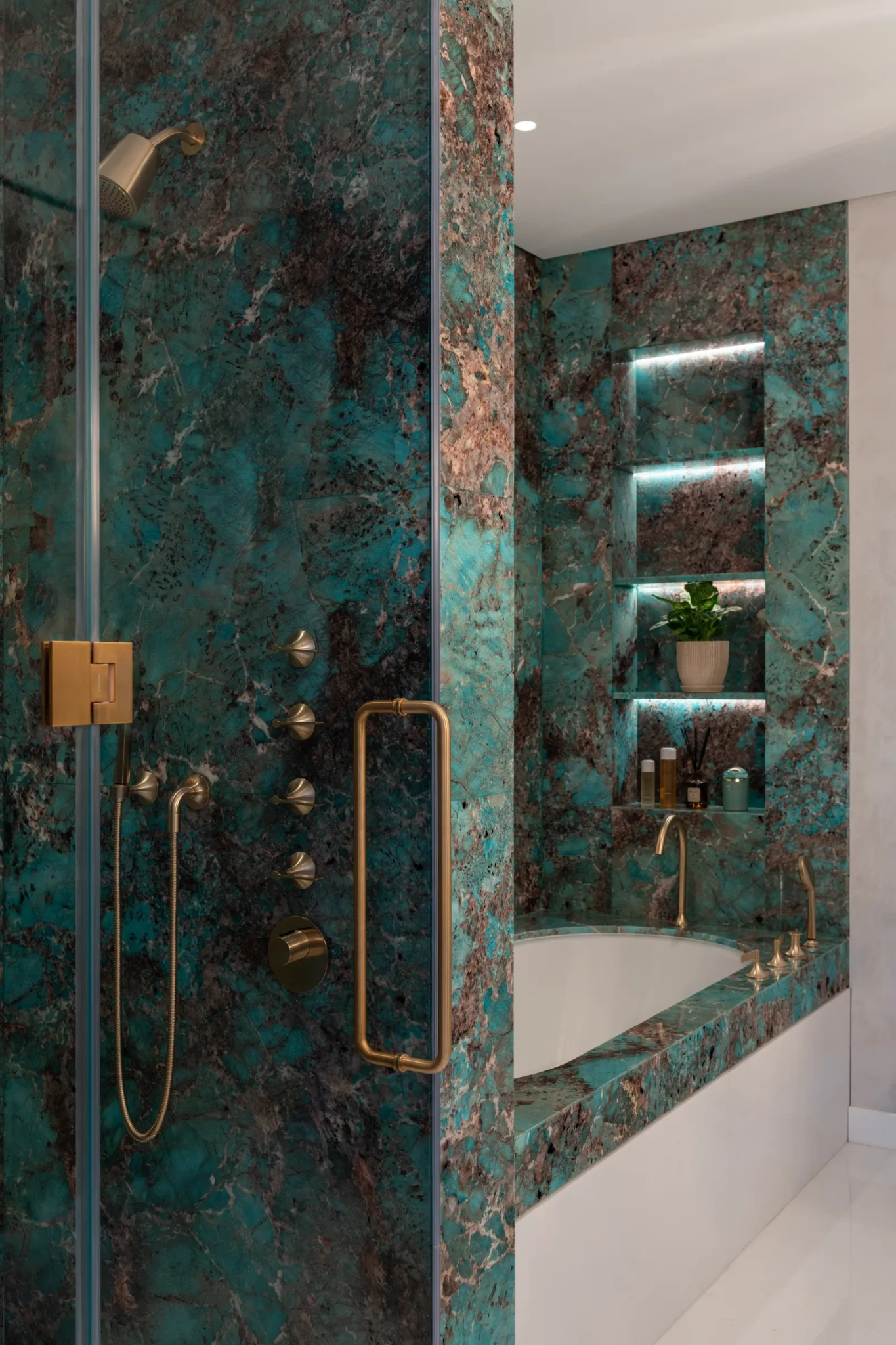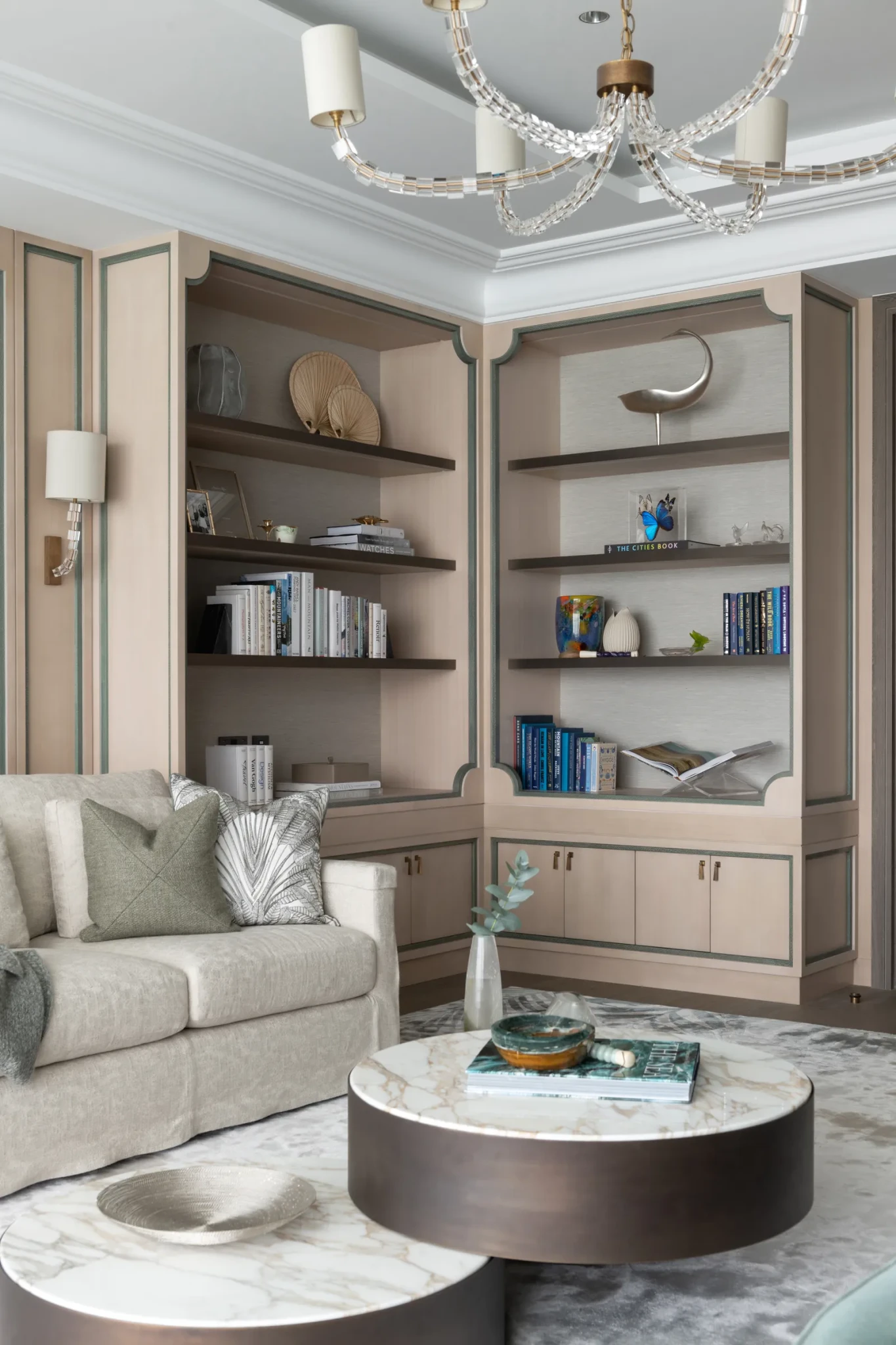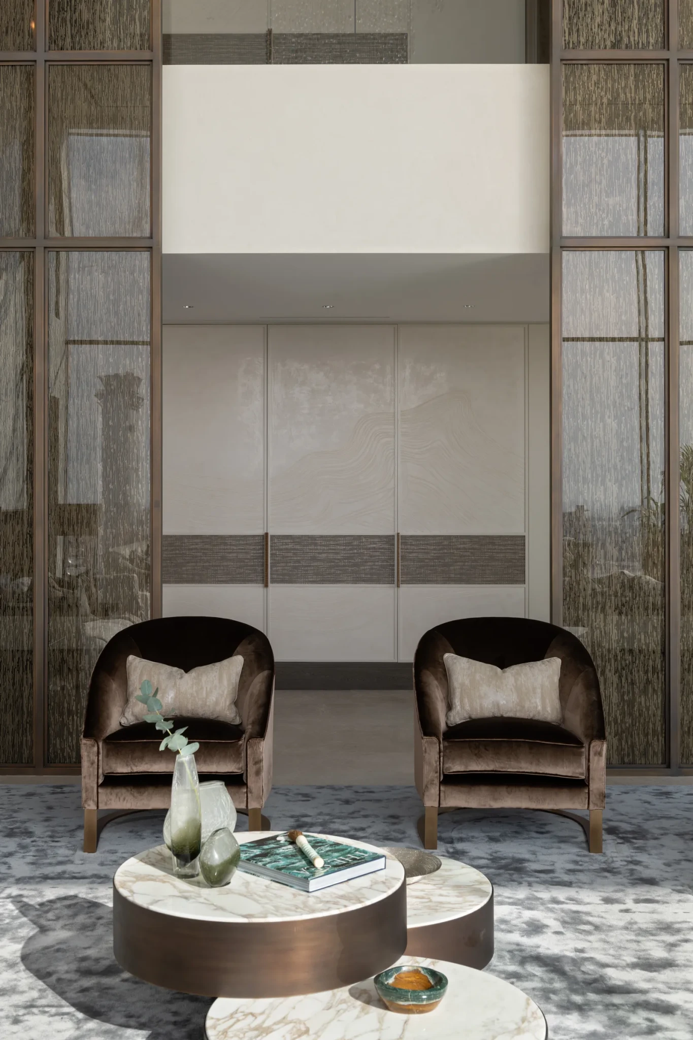 Στον κάτω όροφο, η καμπύλη σκάλα με φινίρισμα από υγρό μπρούντζο ξεχωρίζει, οδηγώντας τον επισκέπτη σε έναν χώρο γεμάτο φως και αναμονή. Ο φωτισμός στα μαρμάρινα σκαλοπάτια δημιουργεί αίσθηση κινητικότητας και ενθουσιασμού. Διπλού ύψους διαχωριστικά από υφασμάτινο πλέγμα και γυαλί διαχωρίζουν την είσοδο από τον χώρο υποδοχής, ενώ ένα επιβλητικό κρυστάλλινο φωτιστικό της Haberdashery προσθέτει κομψότητα και αρμονία. Πάνω από το τζάκι, ένα έργο ρητίνης και μπρούντζου από την Officina Coppola προσθέτει μοναδικό χαρακτήρα. Η οικογενειακή σάλα συνδυάζει ευρύχωρους καναπέδες με κυκλικά τραπεζάκια από όνυχα, ισορροπώντας τις γραμμικές και καμπύλες φόρμες και προσφέροντας άνεση και λειτουργικότητα.