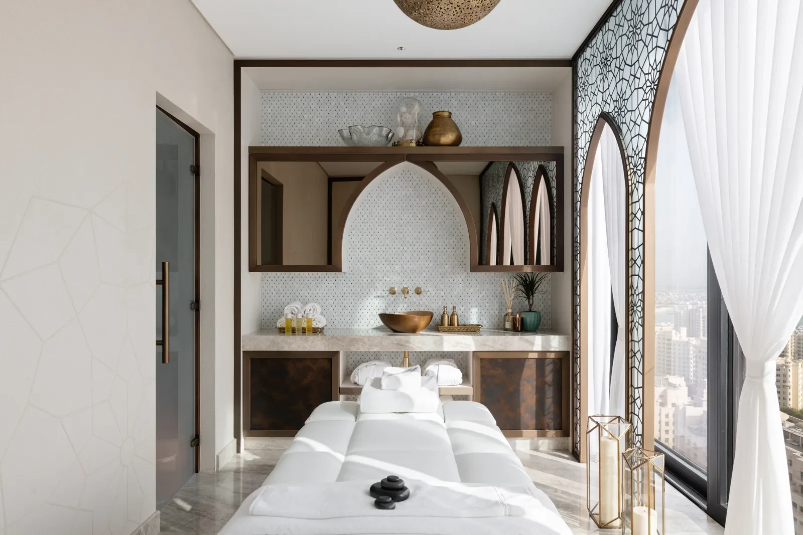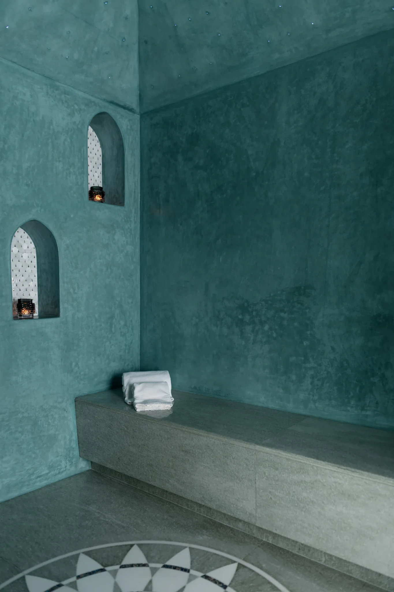 Στον ίδιο όροφο βρίσκονται επίσης δωμάτια εργασίας, ένα για κάθε γονιό, καθώς και ένα μαροκινό χαμάμ με τιρκουάζ τοίχους, θολωτά διακοσμητικά με σμαράγδια και κοχύλια abalone, προσδίδοντας έναν χαρακτήρα πολυτέλειας και χαλάρωσης.