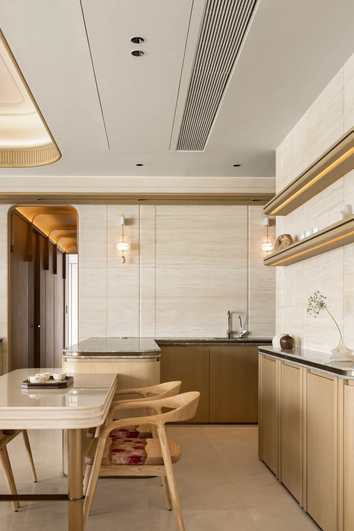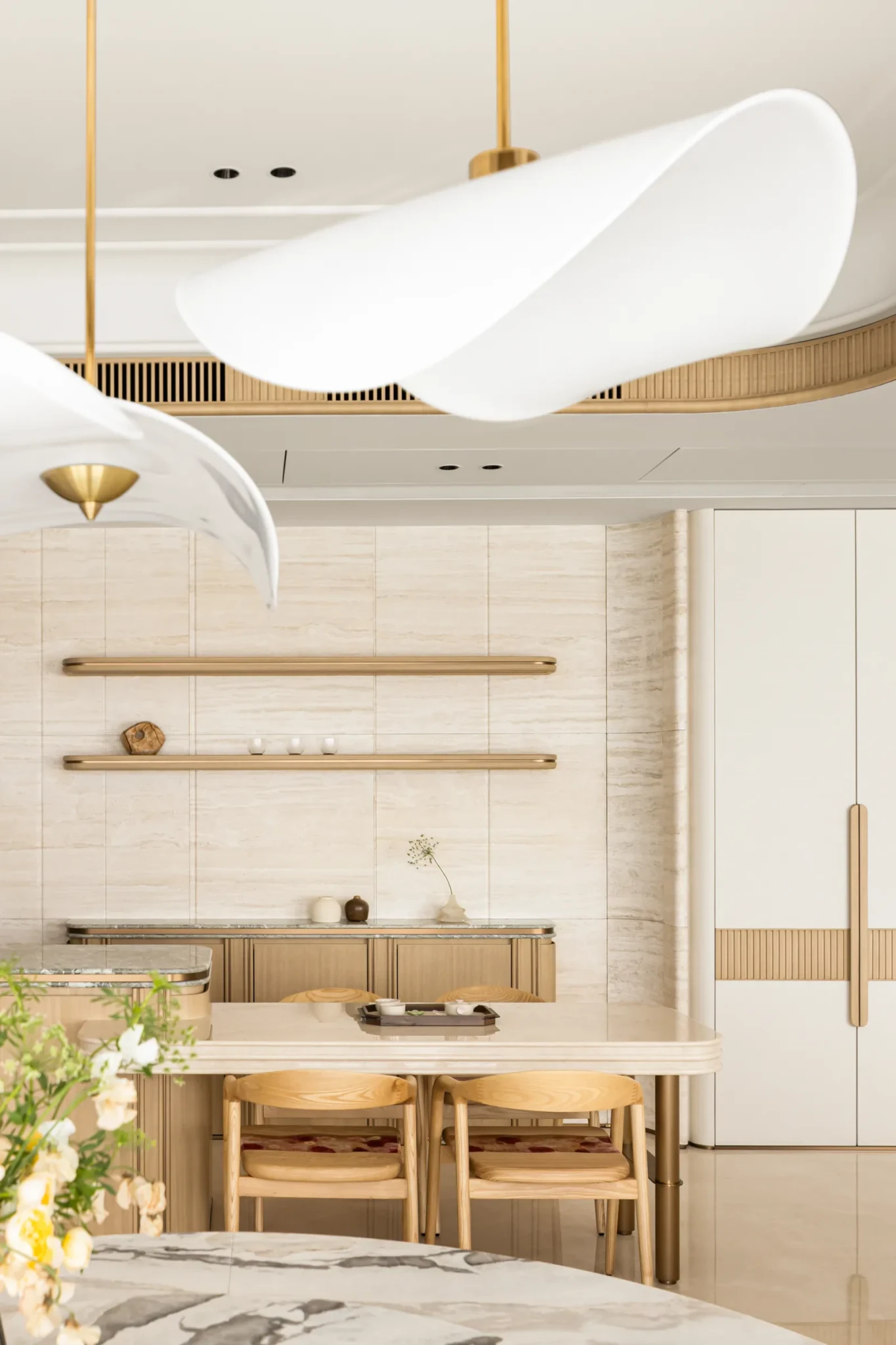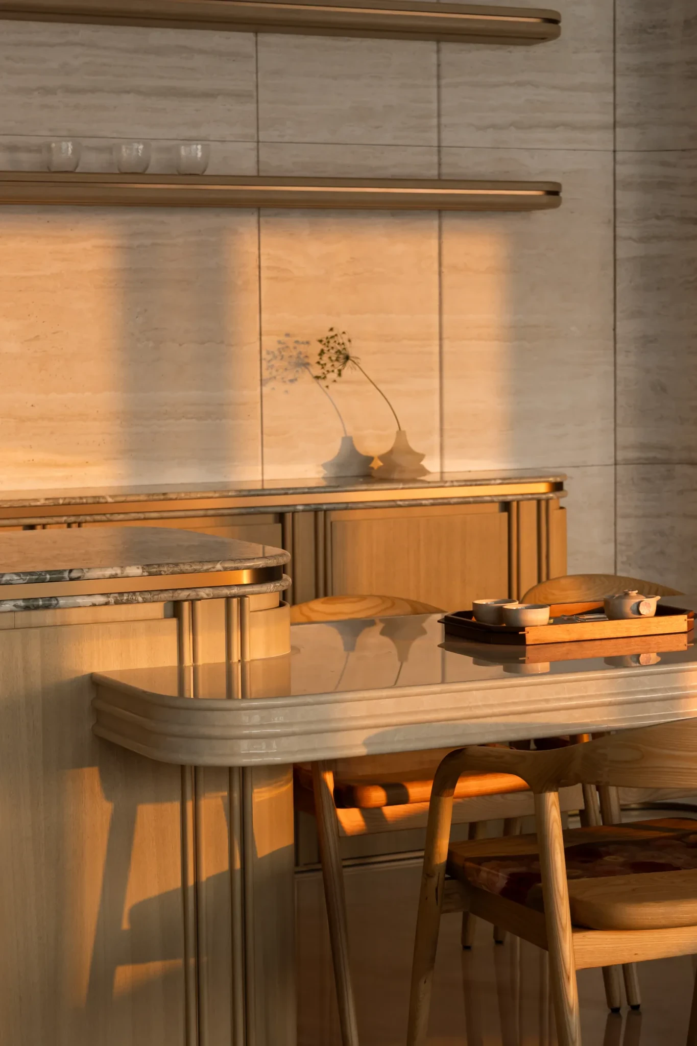 Στα 325 τετραγωνικά μέτρα του διαμερίσματος, η αίσθηση του χώρου μοιάζει σχεδόν μαγική. Οι ξύλινες οροφές με τα αιωρούμενα, οι διάδρομοι με τόξα και οι προσεκτικά επιλεγμένοι φωτισμοί δημιουργούν μια αίσθηση ροής και ελευθερίας. Η λεπτομέρεια στις υφές των μαρμάρων, η ζεστασιά των γήινων τόνων και η αρμονία ανάμεσα σε ξύλο και μέταλλο προσδίδουν ισορροπία και αίσθηση ηρεμίας. Κάθε γωνία φαίνεται να κινείται μαζί με τον παρατηρητή, δημιουργώντας έναν χώρο που είναι ταυτόχρονα λειτουργικός και αισθητικά εντυπωσιακός.