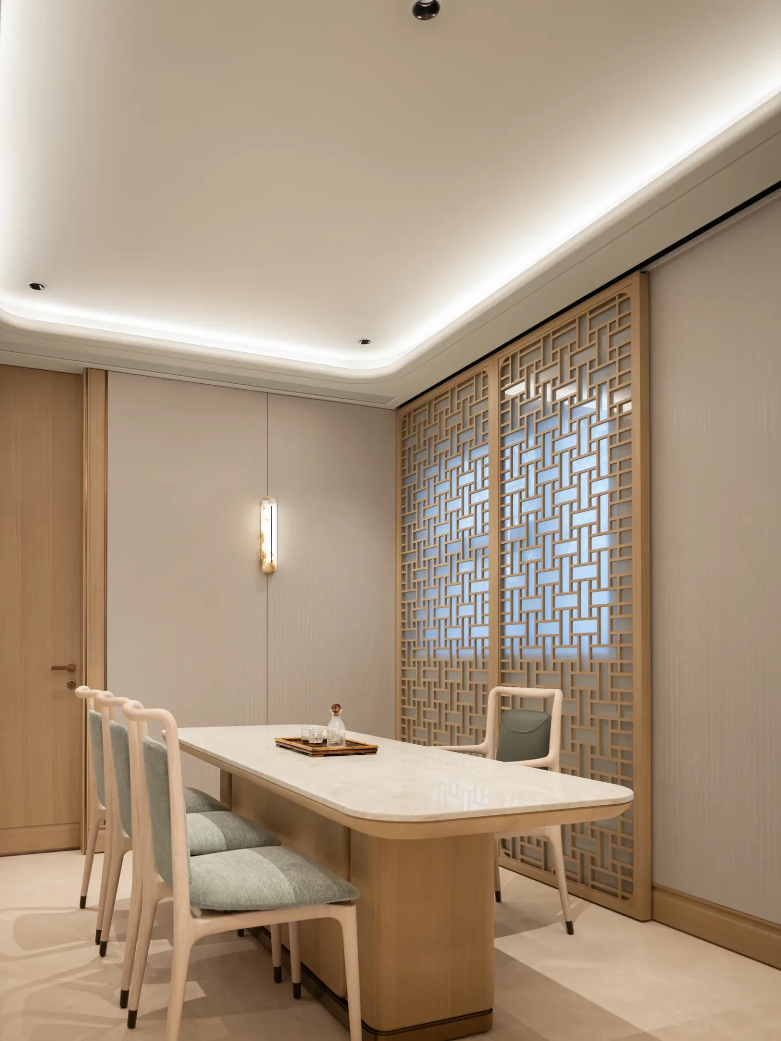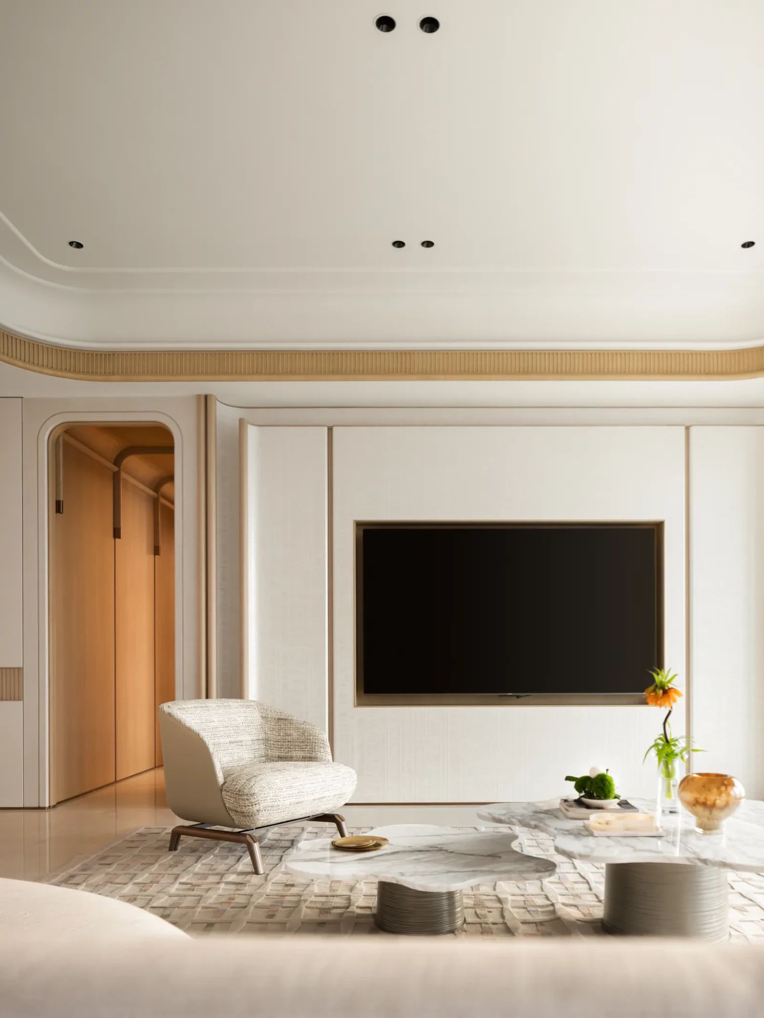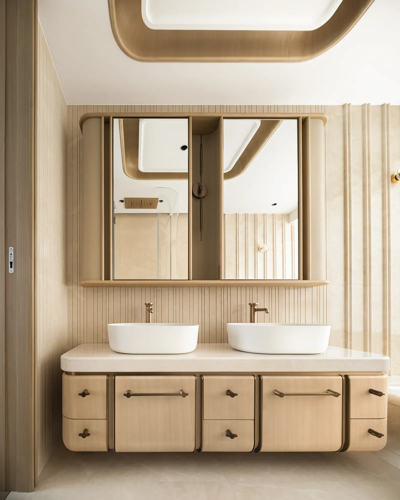 Στα 325 τετραγωνικά μέτρα του διαμερίσματος, η αίσθηση του χώρου μοιάζει σχεδόν μαγική. Οι ξύλινες οροφές με τα αιωρούμενα, οι διάδρομοι με τόξα και οι προσεκτικά επιλεγμένοι φωτισμοί δημιουργούν μια αίσθηση ροής και ελευθερίας. Η λεπτομέρεια στις υφές των μαρμάρων, η ζεστασιά των γήινων τόνων και η αρμονία ανάμεσα σε ξύλο και μέταλλο προσδίδουν ισορροπία και αίσθηση ηρεμίας. Κάθε γωνία φαίνεται να κινείται μαζί με τον παρατηρητή, δημιουργώντας έναν χώρο που είναι ταυτόχρονα λειτουργικός και αισθητικά εντυπωσιακός.