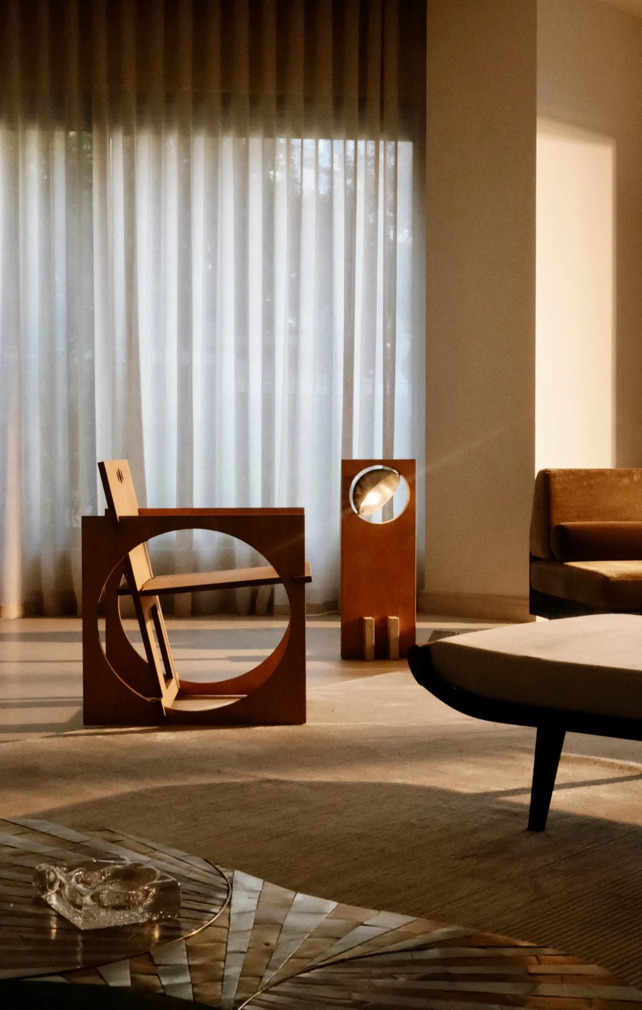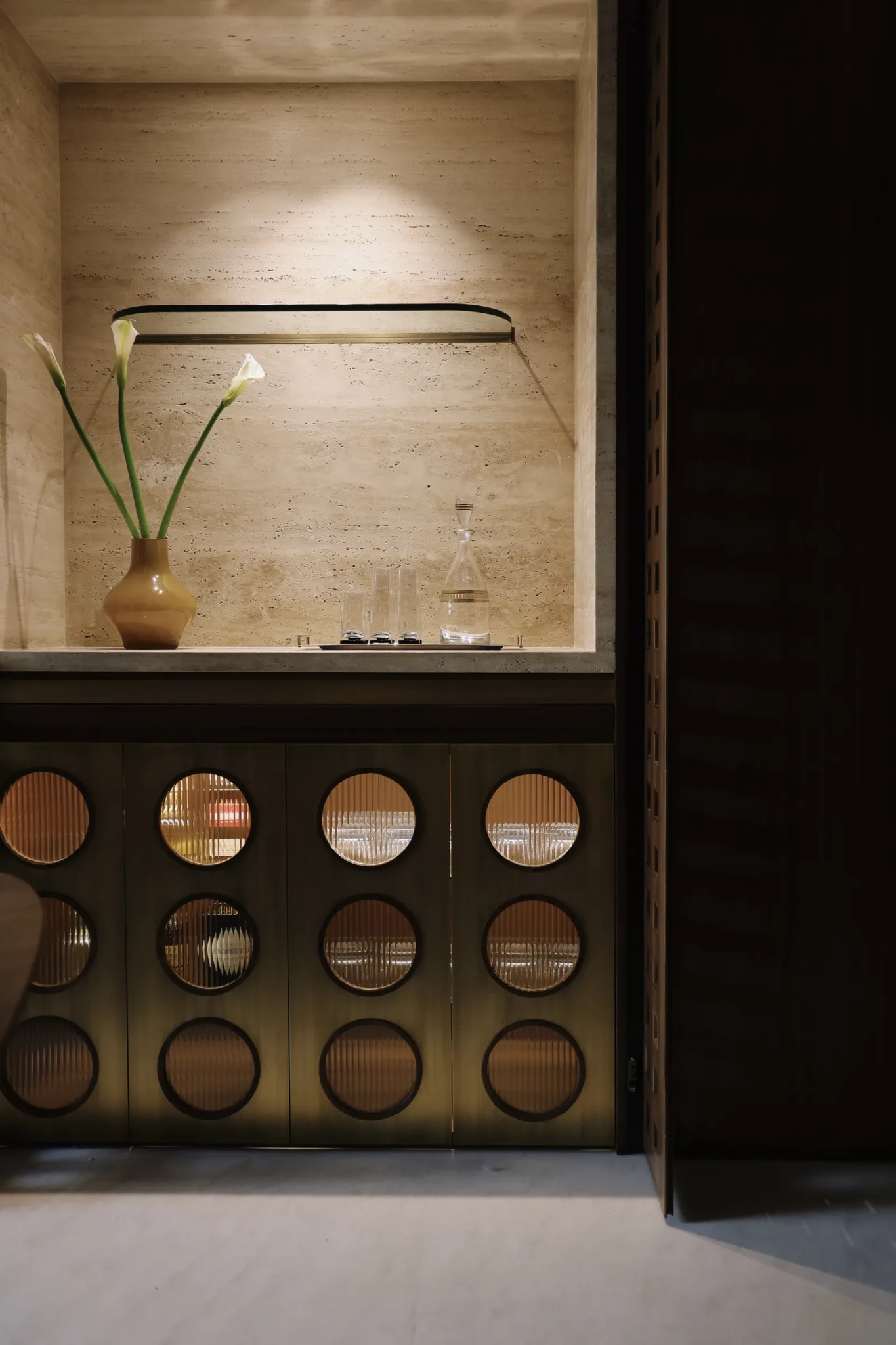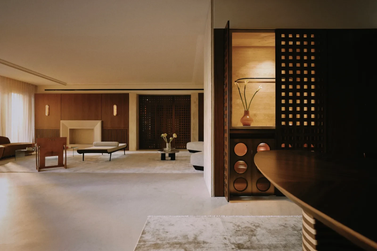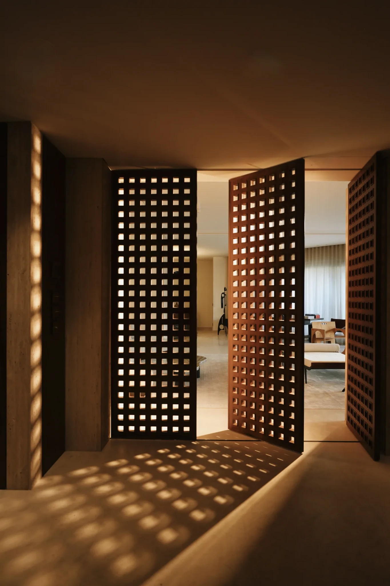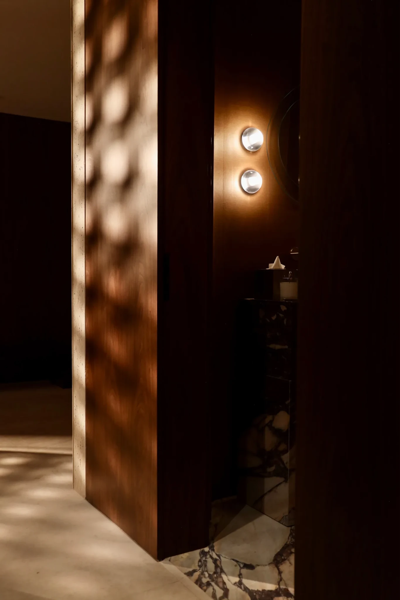 Η εμπειρία ξεκινά από τον προθάλαμο: σκοτεινός, χαμηλοτάβανος, εσκεμμένα κλειστός. Αντί να τον «διορθώσει», ο σχεδιαστής ενίσχυσε τη δραματικότητά του. Επένδυσε τους τοίχους με πάνελ και διάτρητα παραβάν από αμερικανική καρυδιά, πλαισιωμένα με τραβερτίνη. Όταν το φως τα διαπερνά, δημιουργεί σκιές που μοιάζουν να κινούνται. Οι αναφορές στη mashrabiya της αραβικής αρχιτεκτονικής είναι σαφείς, με τετράγωνα ανοίγματα που προκαλούν περιέργεια για όσα ακολουθούν.