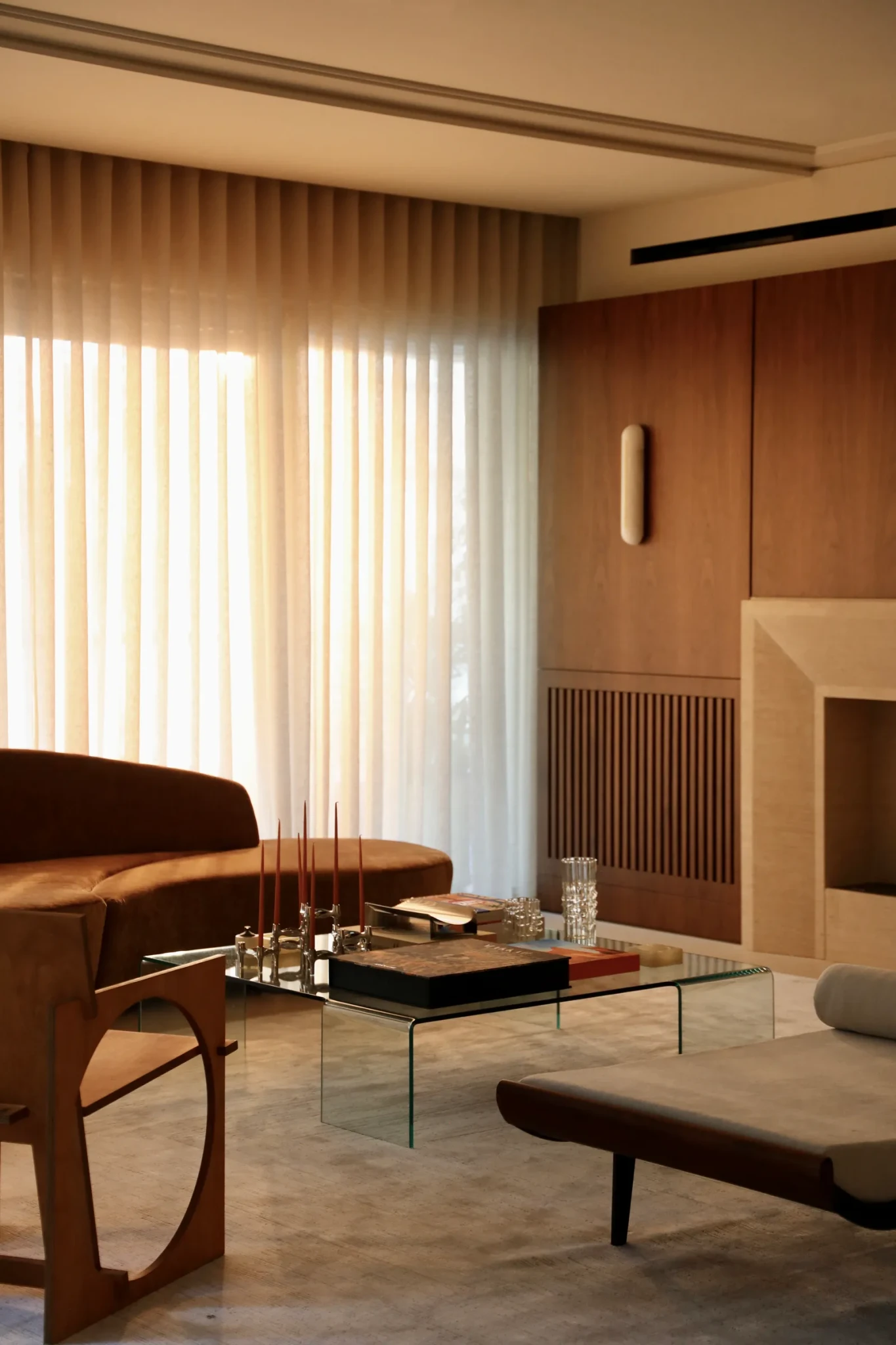 Πίσω από την είσοδο, το σπίτι αναδεικνύει την ομορφιά του. Το καθιστικό και η τραπεζαρία μοιράζονται την ίδια γλώσσα υλικών: καρυδιά, τραβερτίνη, απαλά υφάσματα. Το τζάκι, ειδικά σχεδιασμένο, επαναλαμβάνει τα γεωμετρικά μοτίβα της εισόδου, ενώ τα μοντέρνα φωτιστικά προσθέτουν θερμότητα. Το χαλί από μετάξι και μαλλί, ο καναπές με ανάγλυφη υφή και η ενσωματωμένη μπάρα για ποτά λειτουργούν ως έξτρα στοιχεία πολυτέλειας.
