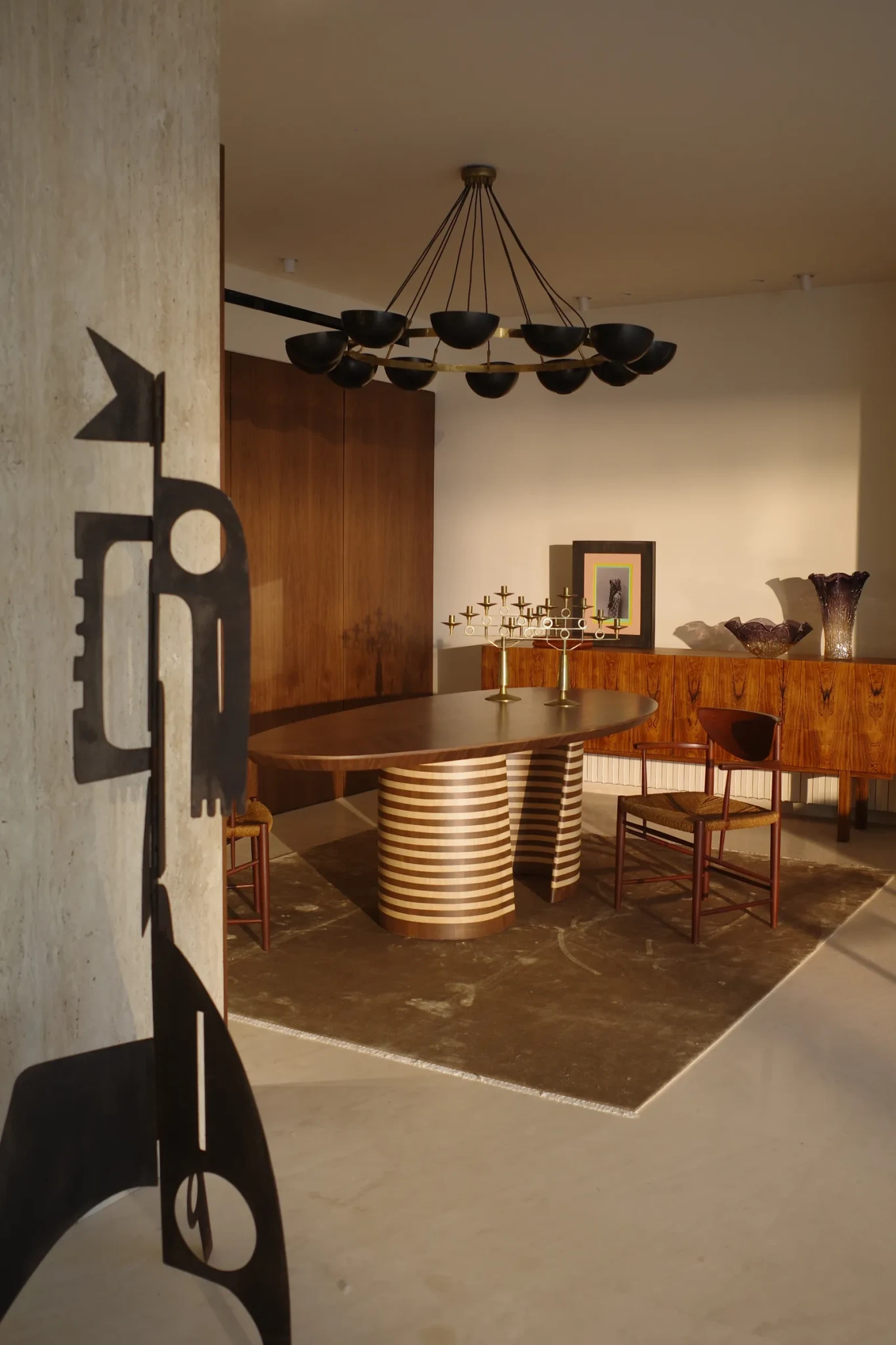 Η παλέτα παραμένει γήινη και ουδέτερη, ώστε να φιλοξενεί την εναλλασσόμενη συλλογή τέχνης. Πολλά από τα έπιπλα είναι σπάνια κομμάτια, που ανακαλύφθηκαν σε υπαίθριες αγορές και γκαλερί στο Παρίσι και το Λονδίνο. Mid-century σχέδια συνυπάρχουν με σύγχρονες δημιουργίες, όλες με έντονη, αλλά ισορροπημένη παρουσία.