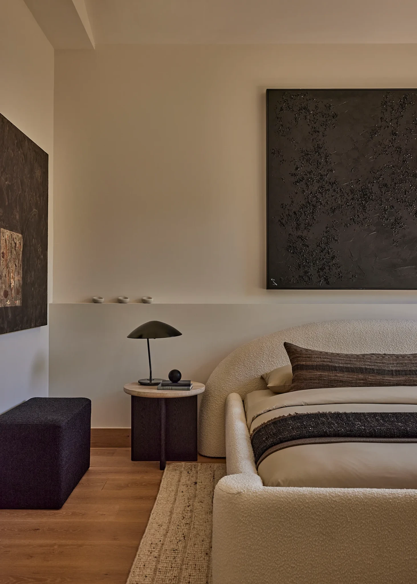Η επιλογή επίπλων από τη RH δεν ήταν τυχαία. Ο Zedd επέλεξε να διατηρήσει την υλική και χρωματική συνέχεια, ώστε κάθε αντικείμενο να συνομιλεί αρμονικά με το λευκό δρύινο υπόβαθρο. Από τους καναπέδες Cloud έως τα τραπέζια και τα φωτιστικά, κάθε κομμάτι τοποθετήθηκε με ακρίβεια, ύστερα από έναν χρόνο δοκιμών και πειραματισμού με την ομάδα σχεδιασμού της RH.