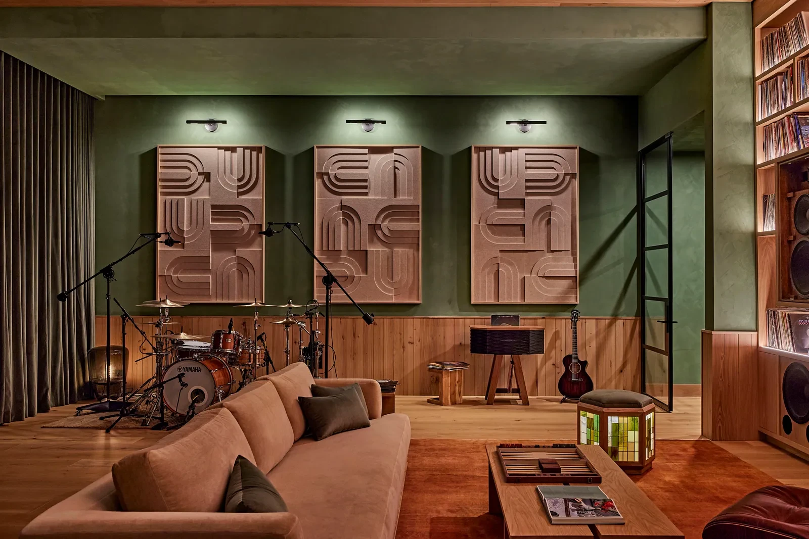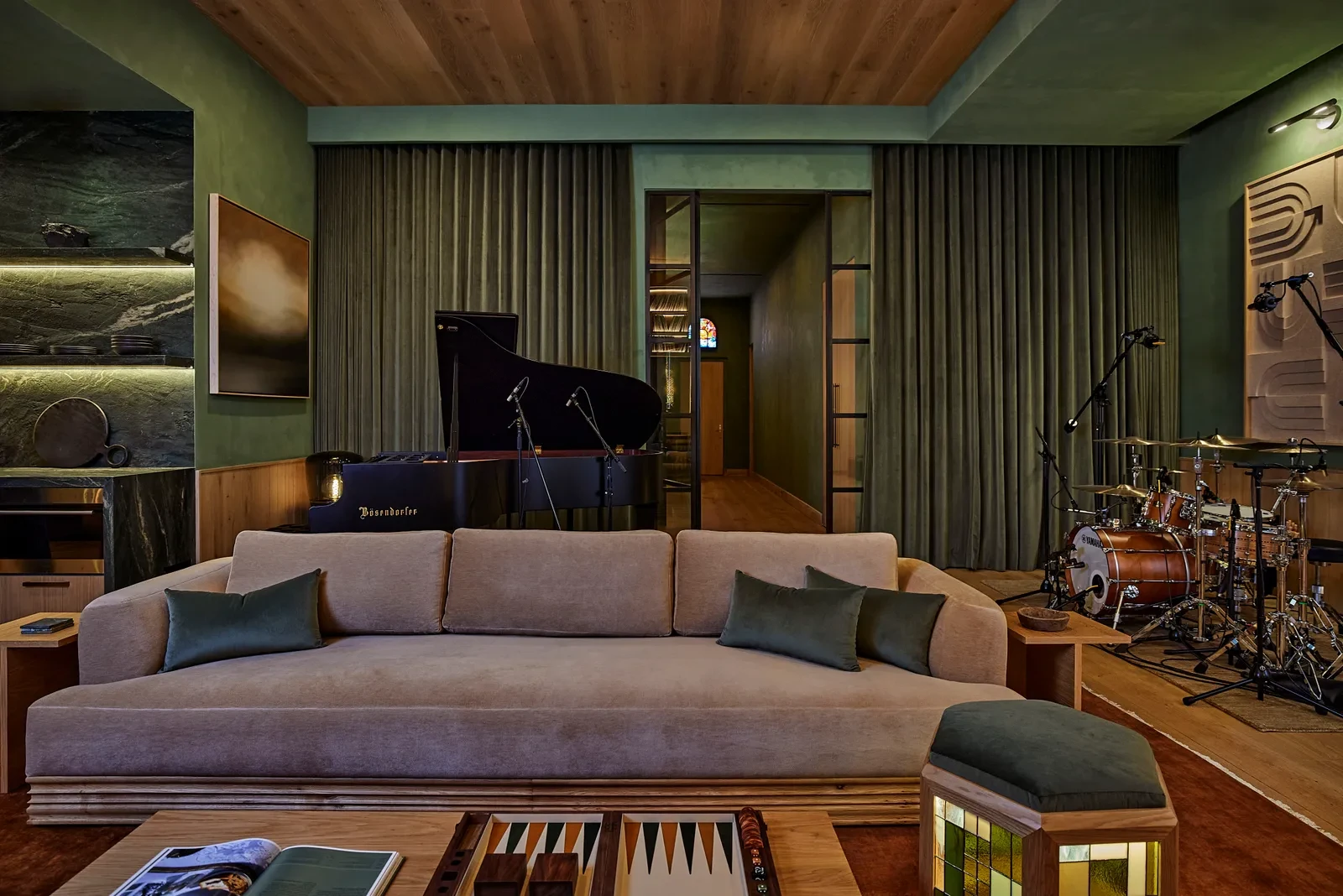 Κάτω από την επιφάνεια της κατοικίας κρύβεται ένα από τα πιο εντυπωσιακά studio ηχογράφησης που έχει δημιουργηθεί ποτέ για μουσικό καλλιτέχνη. Το υπόγειο αντικατέστησε έναν χώρο bowling και μεταμορφώθηκε σε πλήρως εξοπλισμένο recording complex με live room, vocal booth και δύο production rooms. Ο σχεδιασμός έγινε σε συνεργασία με τον αδελφό του, Arkadi Zaslavski, καθώς και τους Kyle Mann, Ryan Shanahan και Hadrien da Souza (HSDSGN). Η τεχνολογική υποδομή επιτρέπει στον Zedd να ελέγχει το στούντιο εξ αποστάσεως, ακόμη και από τον καναπέ του σαλονιού, ενώ η αισθητική του χώρου με την custom απόχρωση limewash της Portola Paints ενισχύει τη δημιουργική του διάθεση.
