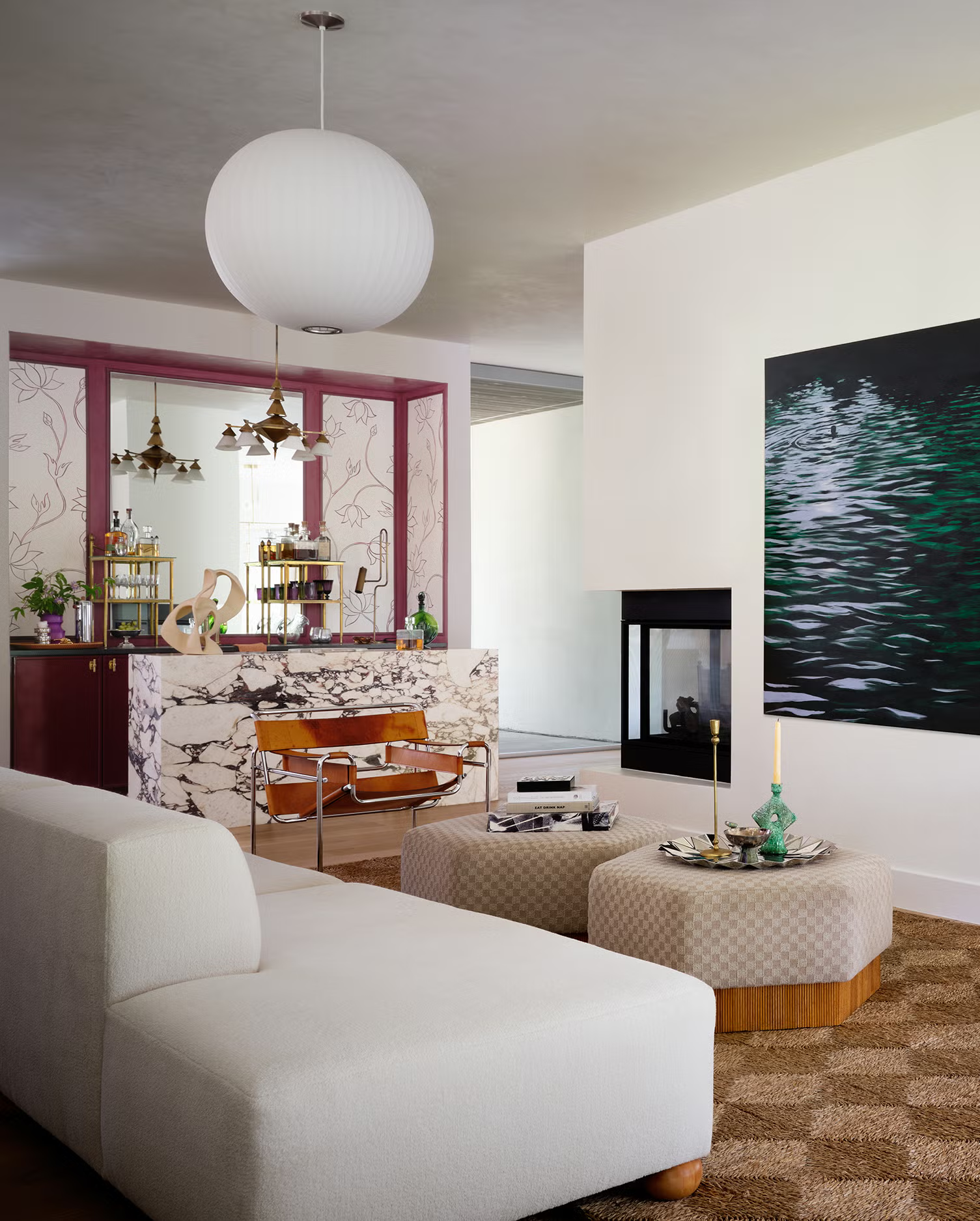 Στο σαλόνι, οι καναπέδες με τα υφάσματα σε φυσικές αποχρώσεις και τα vintage έπιπλα δημιουργούν μια αίσθηση άνεσης και συνέχειας. Η επιλογή υλικών όπως οι ζωγραφισμένοι τοίχοι, τα ελαφριά δέρματα και τα υφάσματα από οργανικές ίνες, δένει με την ανοιχτή δομή της κατοικίας, κάνοντας κάθε γωνία να δείχνει οικεία. Την ίδια ώρα, ένα lux bar με χειροποίητη ταπετσαρία, ματ μαρμάρινους πάγκους από Calacatta Viola και μεταλλικά στοιχεία σε ζεστό μπρούντζο, αποτελεί ένα κομμάτι «δραματικό αλλά παιχνιδιάρικο» μέσα στην ευρύτερη αίσθηση της ηρεμίας του σπιτιού.