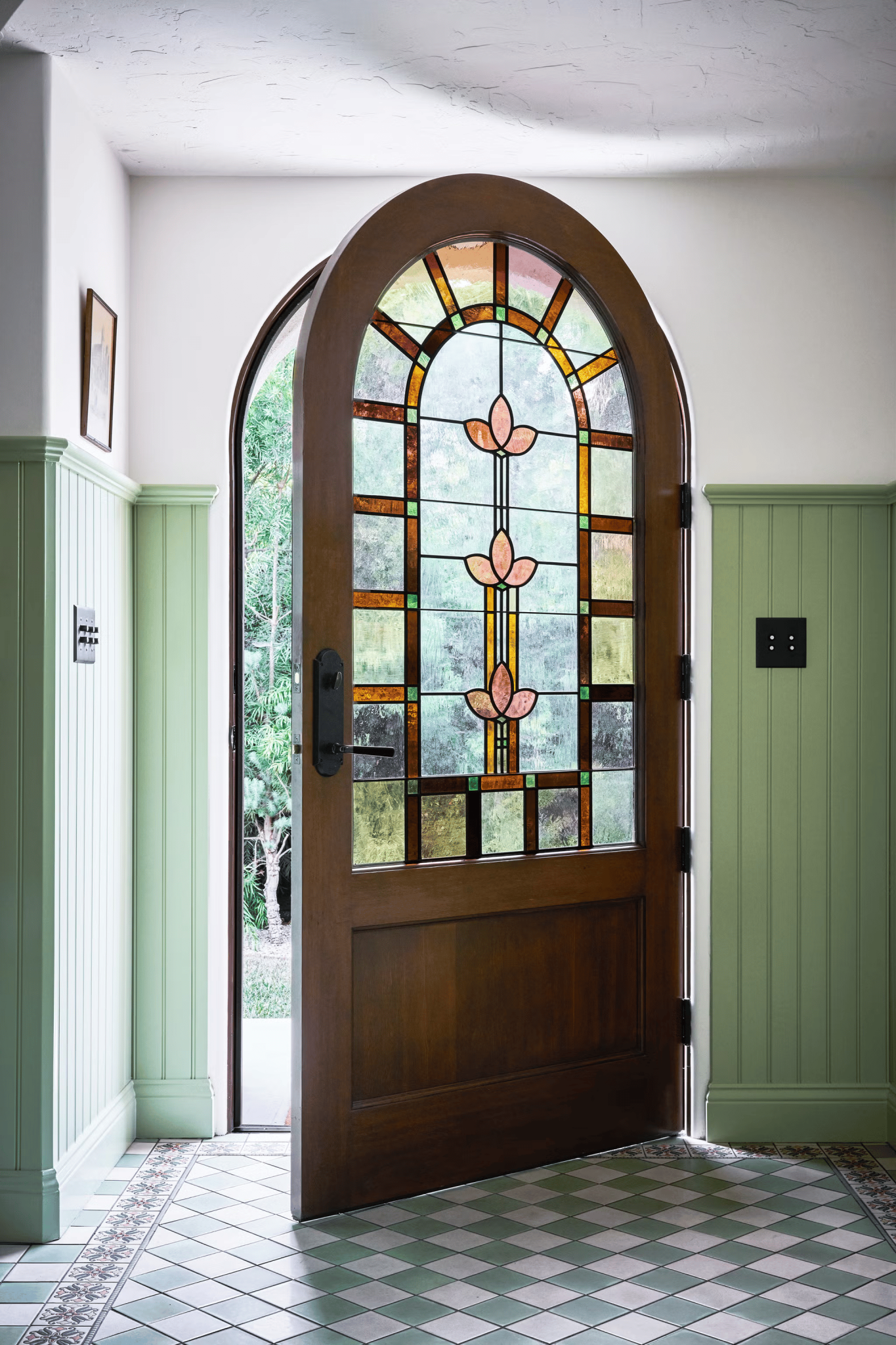 Ο στόχος της Phillips ήταν να διατηρήσει την ιστορική ταυτότητα του σπιτιού, ενώ ταυτόχρονα να εισάγει φρέσκες, παιχνιδιάρικες λεπτομέρειες που θα κάνουν τον χώρο να νιώθει οικείος και χαρούμενος. Έτσι, προστέθηκε μια custom made πόρτα από Judson Studios με βιτρό, χάλκινες λεπτομέρειες, φλοράλ μοτίβα και χαρακτηριστικές καμάρες, τα οποία δίνουν μια παραμυθένια αισθητική. Επιπλέον, τα βοηθητικά έπιπλα της εισόδου, όπως η κρεμάστρα για τα παλτό και τα αποθηκευτικά ντουλάπια φτιάχτηκαν με τέτοιο τρόπο ώστε να φαίνονται παλιά, σε συνδυασμό με τις αντίκες, ενώ τα πλακάκια του πατώματος περάστηκαν με ένα ειδικό γλάσο που τα κάνει να φαίνονται πιο vintage.