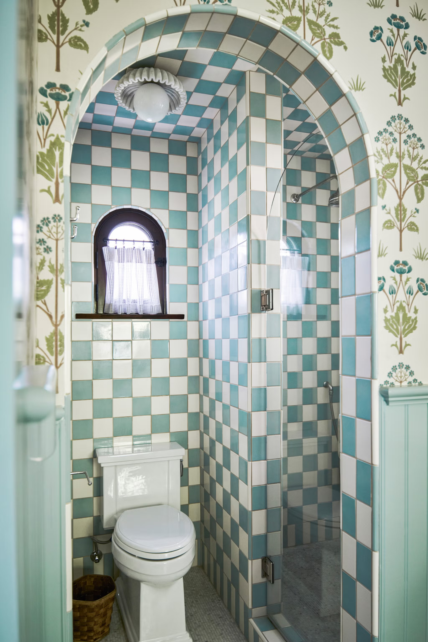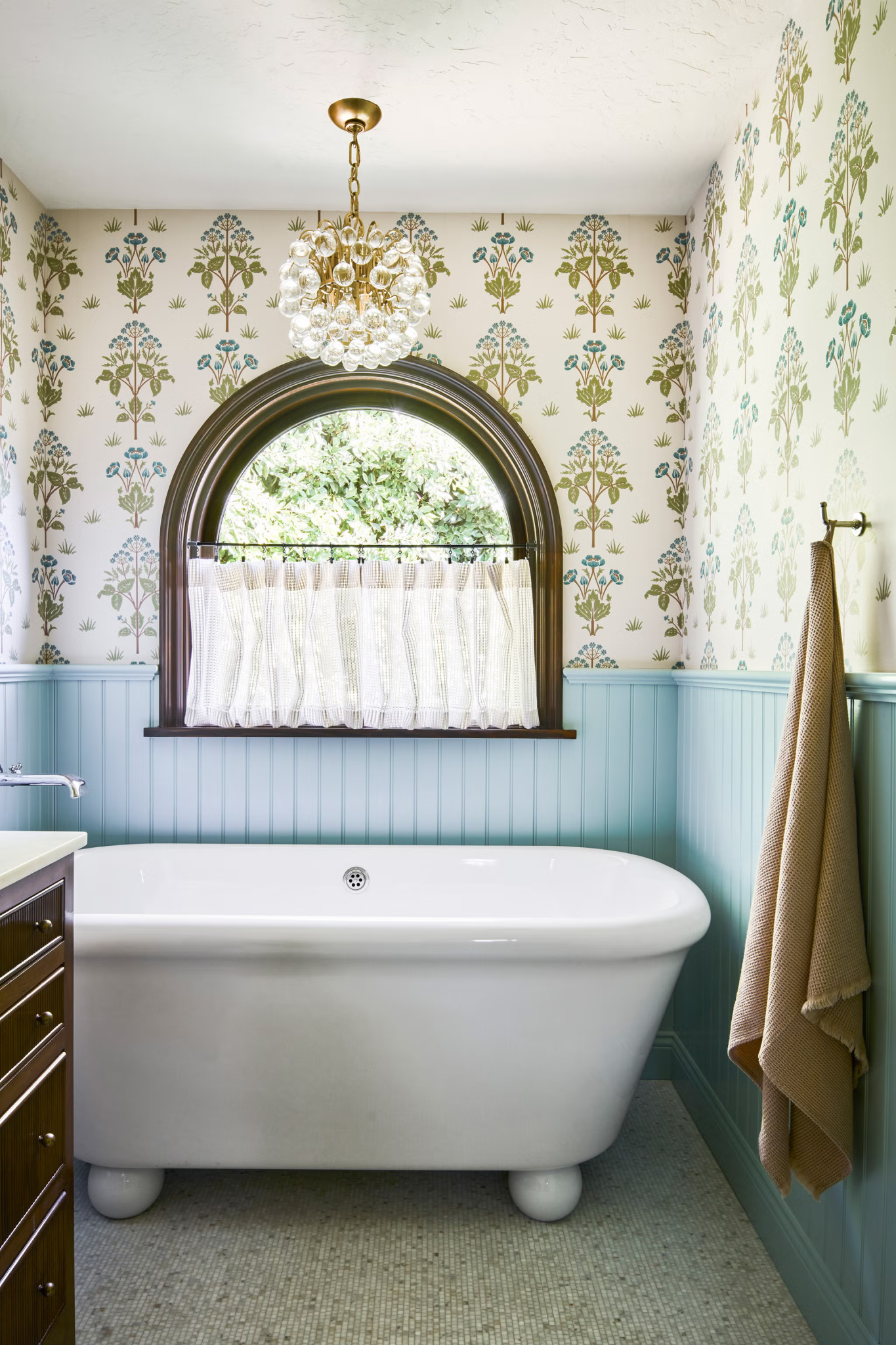 Εμπνευσμένο από την αίγλη του παλιού Hollywood, το κεντρικό μπάνιο είναι ντυμένο με μια φλοράλ ταπετσαρία που δένει απόλυτα με την υπόλοιπη αισθητική του σπιτιού, ενώ τα πλακάκια υπάρχουν παντού κάτι που στην τελική φάνηκε να είναι μια πολύ σωστή απόφαση.