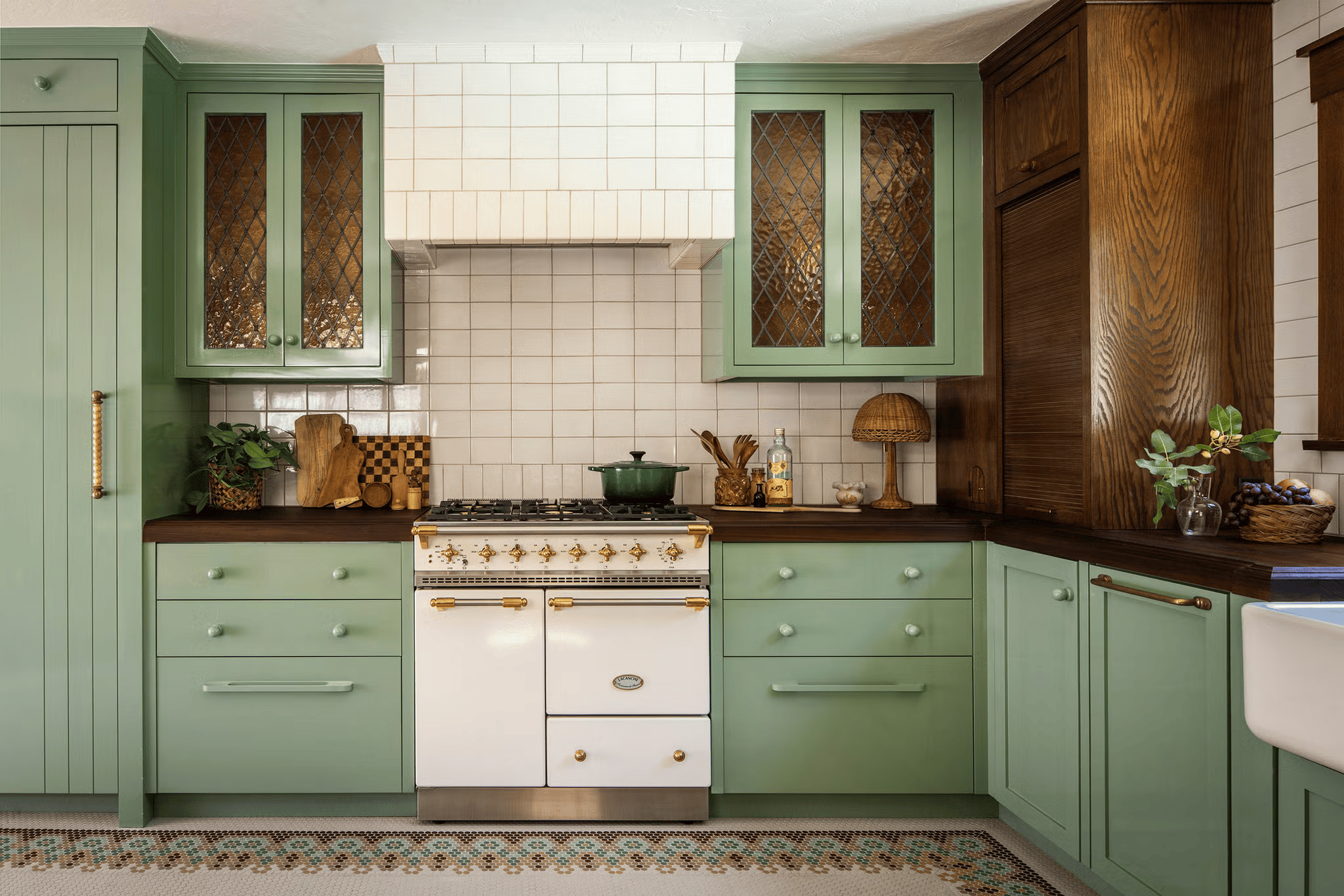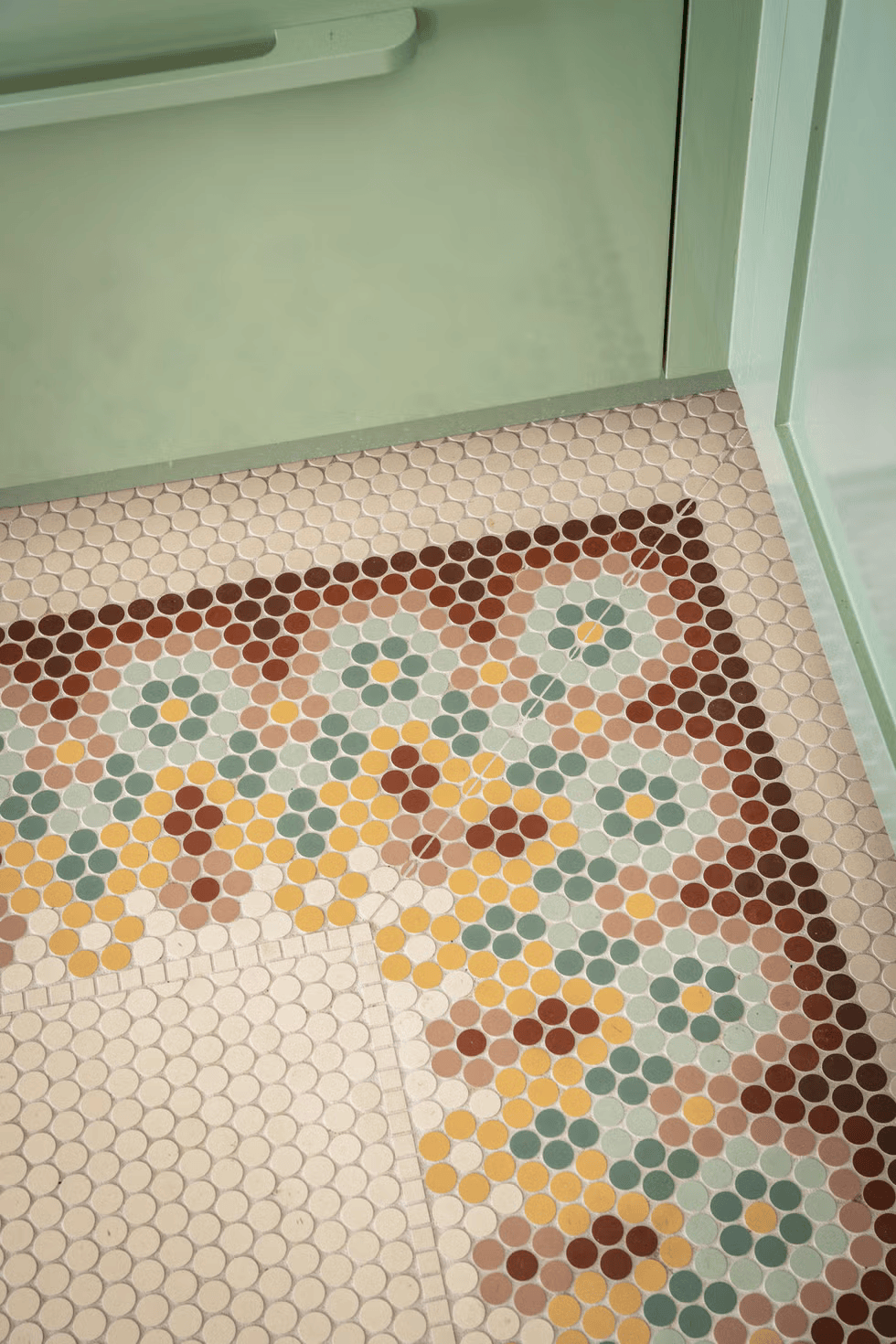 Η κουζίνα αποτελεί μια από τις πιο ζωντανές γωνιές του σπιτιού, όπου οι γυαλιστερές πράσινες επιφάνειες των ντουλαπιών σε συνδυασμό με τους ογκώδεις πάγκους από καρυδιά δημιουργούν μια ζεστή ατμόσφαιρα. Για τα ιδιαίτερα custom πλακάκια του χώρου λέει η σχεδιάστρια: «Σχεδιάσαμε αυτό το ψηφιδωτό πλακάκι εμπνευσμένοι από τα πλακάκια που υπάχουν έξω από έναν σιδηροδρομικό σταθμό».