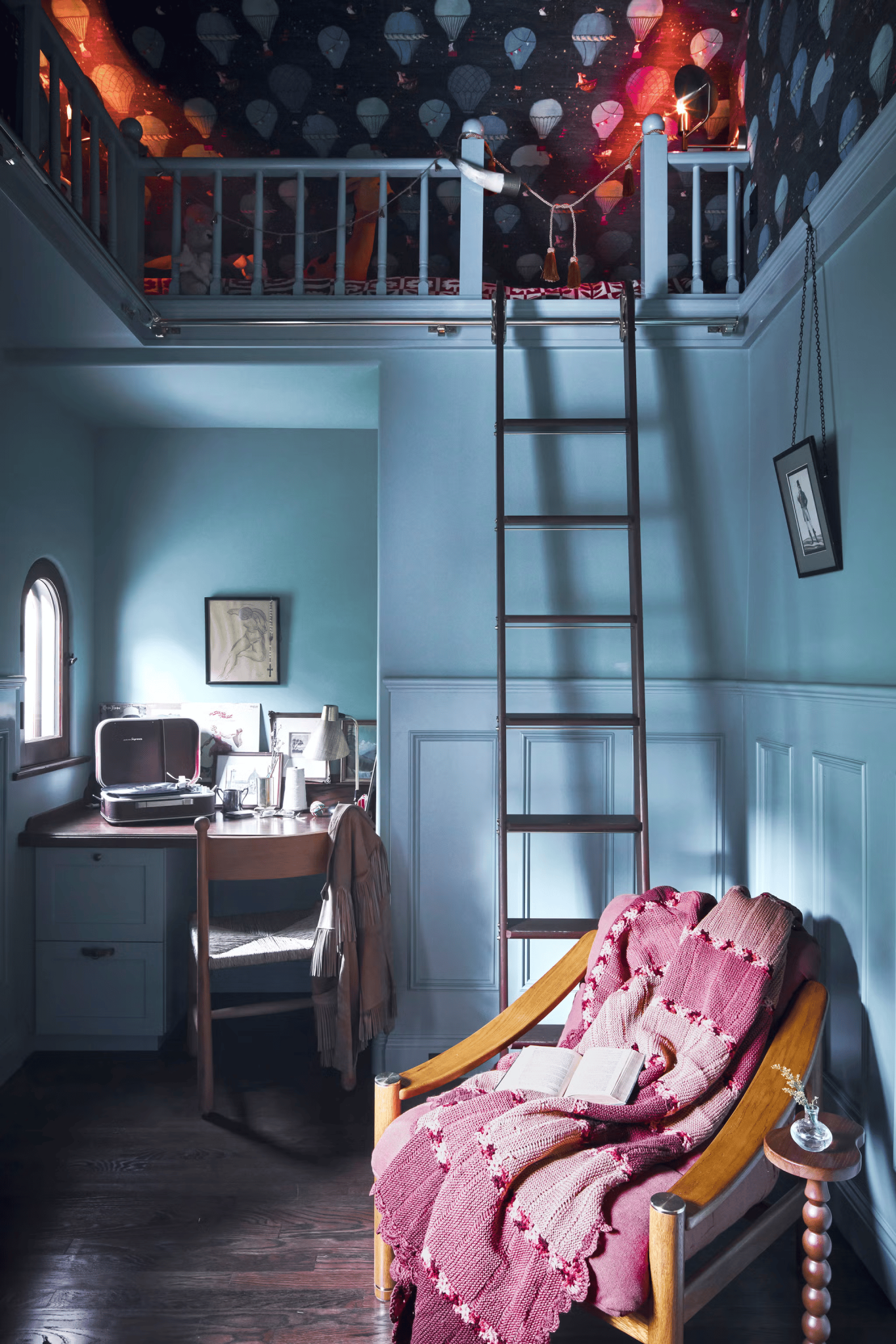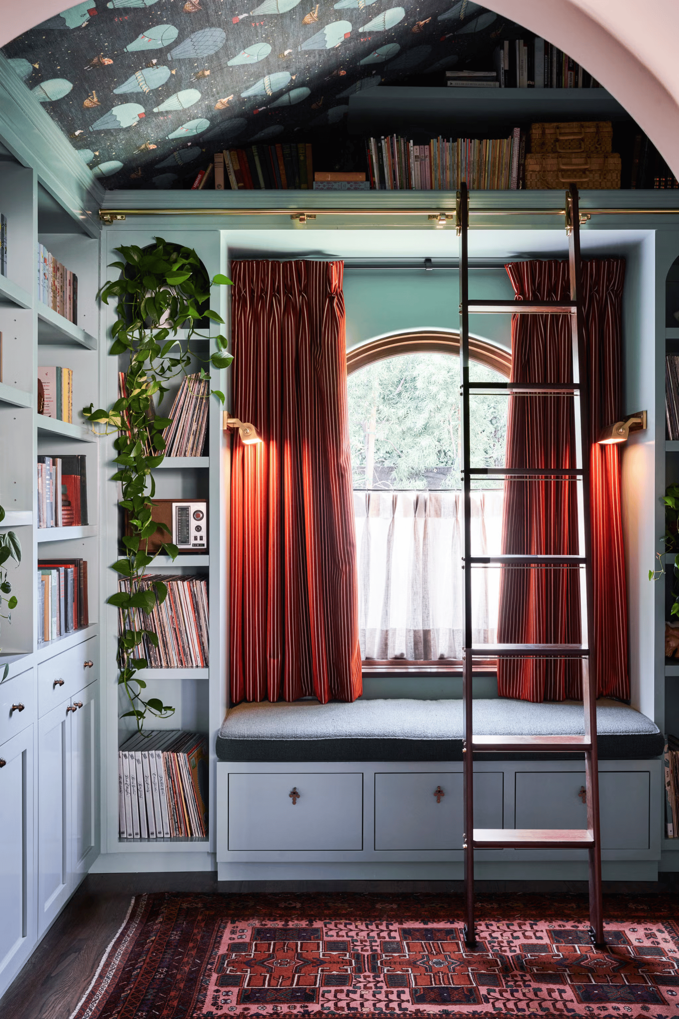 Κεντρικό σημείο του σπιτιού αποτελεί το καθιστικό, με ξύλινους δοκούς στην οροφή που προσθέτουν ζεστασιά και χαρακτήρα. Η διακριτική χρωματική παλέτα του σύμφωνα με τη σχεδιάστρια: «Λειτουργεί ως "καθαριστικό παλέτας" ανάμεσα σε όλα τα πιο πολύχρωμα δωμάτια». Ένα τέτοιο δωμάτιο είναι η βιβλιοθήκη που προστέθηκε με την επέκταση του σπιτιού, η οποία είναι ιδανική για ανάγνωση, χαλάρωση ή ένα ποτό με φίλους. Απαρτίζεται από μία ταπετσαρία με αερόστατα, ψηλές ραφιέρες και έντονα χρώματα.