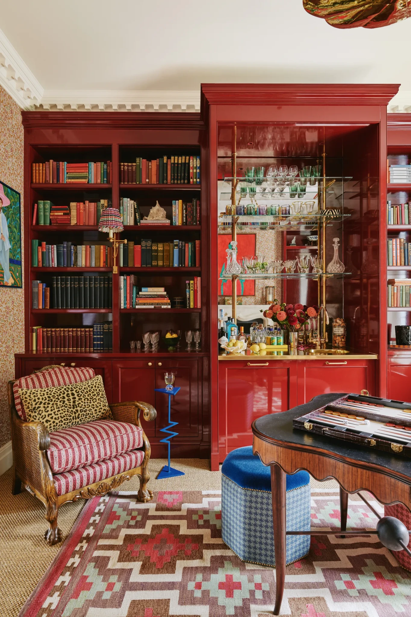 Τη βιβλιοθήκη κοσμεί μια vintage πολυθρόνα, ενώ το σκαμπώ από "Flora Soames" συνδυάζεται απίστευτα με το “Zig Zag” τραπεζάκι από "Jermaine Gallacher". Ένα τουρκικό χαλί από "Robert Stephenson" λειτουργεί ως ζεστό και λιτό αντίβαρο στο χώρο, δένοντας όλα τα στοιχεία μεταξύ τους.