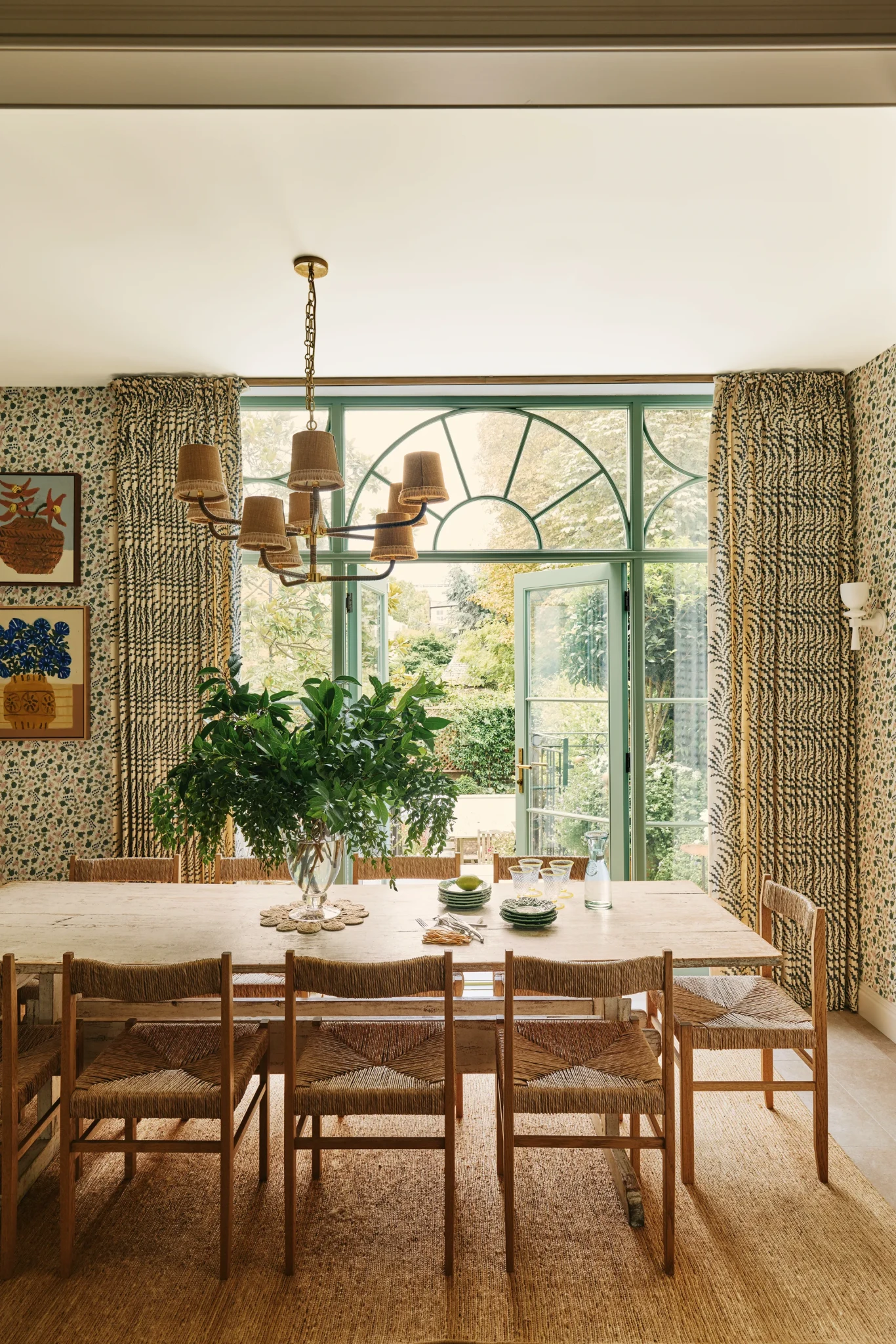 Στην τραπεζαρία βασικό έπιπλο αποτελεί το σουηδικό τραπέζι από "Maison Artefact", το οποίο συνοδεύεται από τις καρέκλες του Studio Atkinson πάνω σε ένα χαλί από γιούτα. Τα έπιπλα συνδυάζονται αρμονικά μεταξύ τους με τη βοήθεια των γύρω υφασμάτων και των κουρτινών, δημιουργώντας έτσι ένα χώρο που φαίνεται ενιαίος, εκλεπτυσμένος και ζεστός.