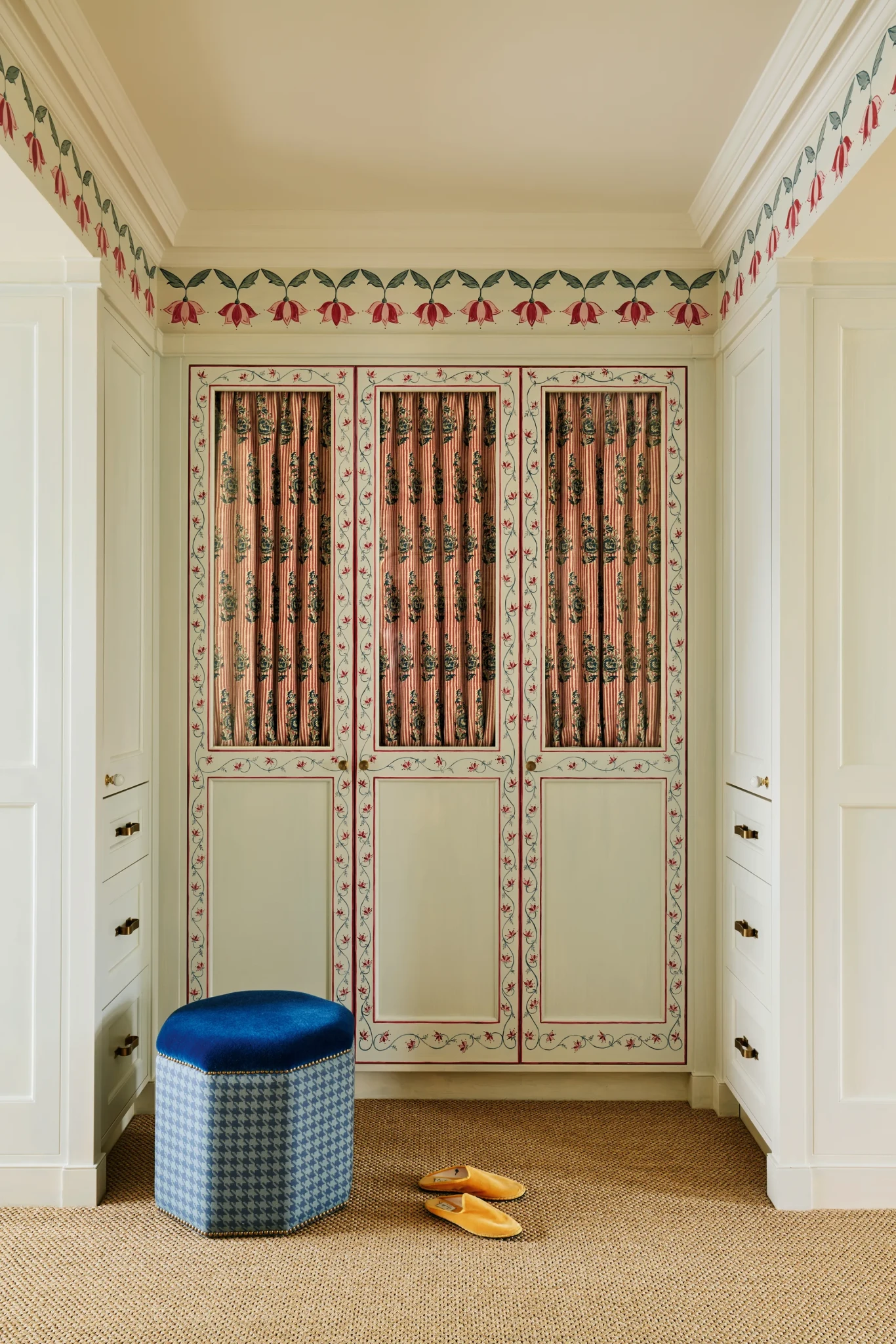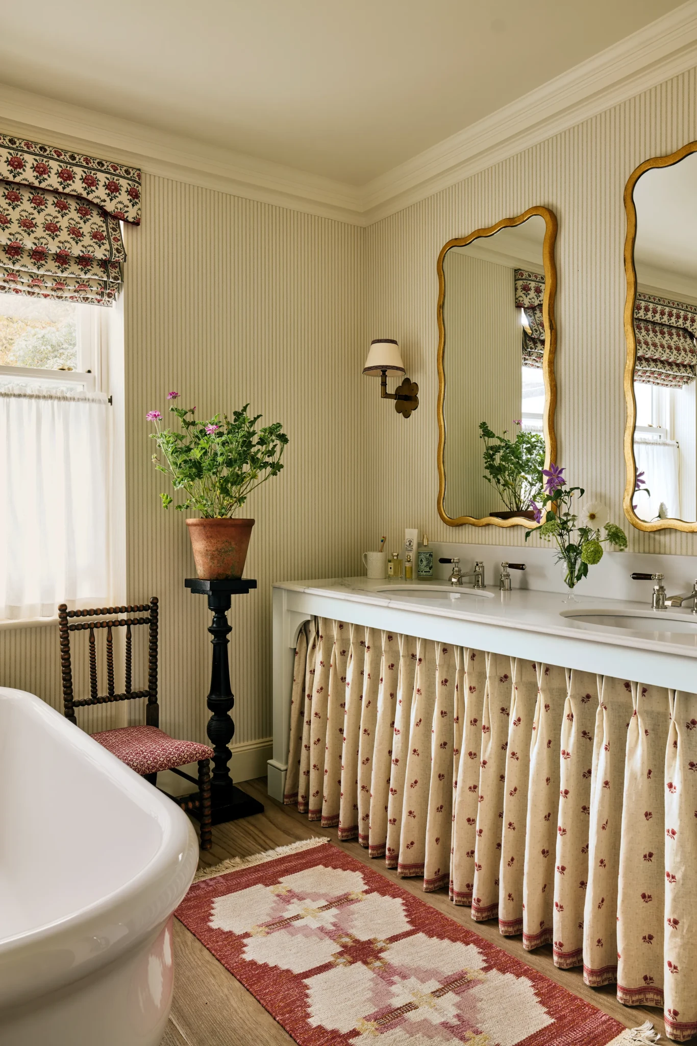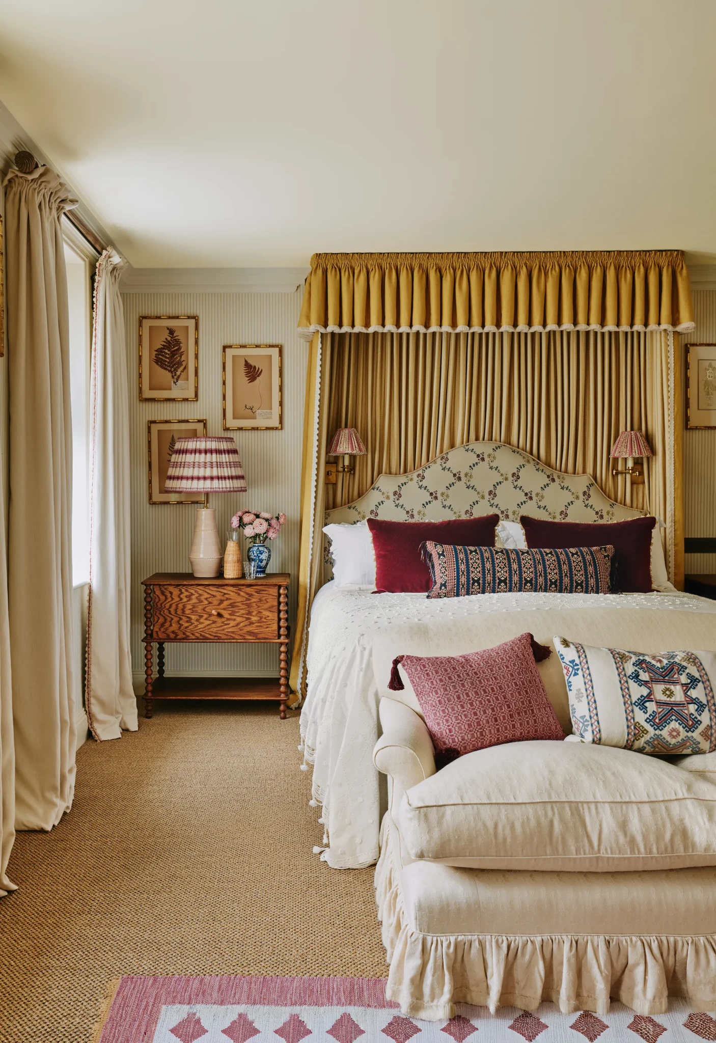 Το κυρίως υπνοδωμάτιο είναι βαμένο με την απόχρωση "Setting Plaster" από "Farrow & Ball’s", ενώ το μεγάλο κεφαλάρι του κρεβατιού που κλέβει τις εντυπώσεις είναι ντυμένο με ύφασμα από το brand "Robert Kime". Το μπάνιο εμπνέει μια vintage αισθητική με κεντρικό στοιχείο του τη μπανιέρα από "The Water Monopoly". Οι έντονες κουρτίνες του δωματίου από "Décors Barbares", πλαισιώνονται από φωτιστικά της εταιρείας "Soane".