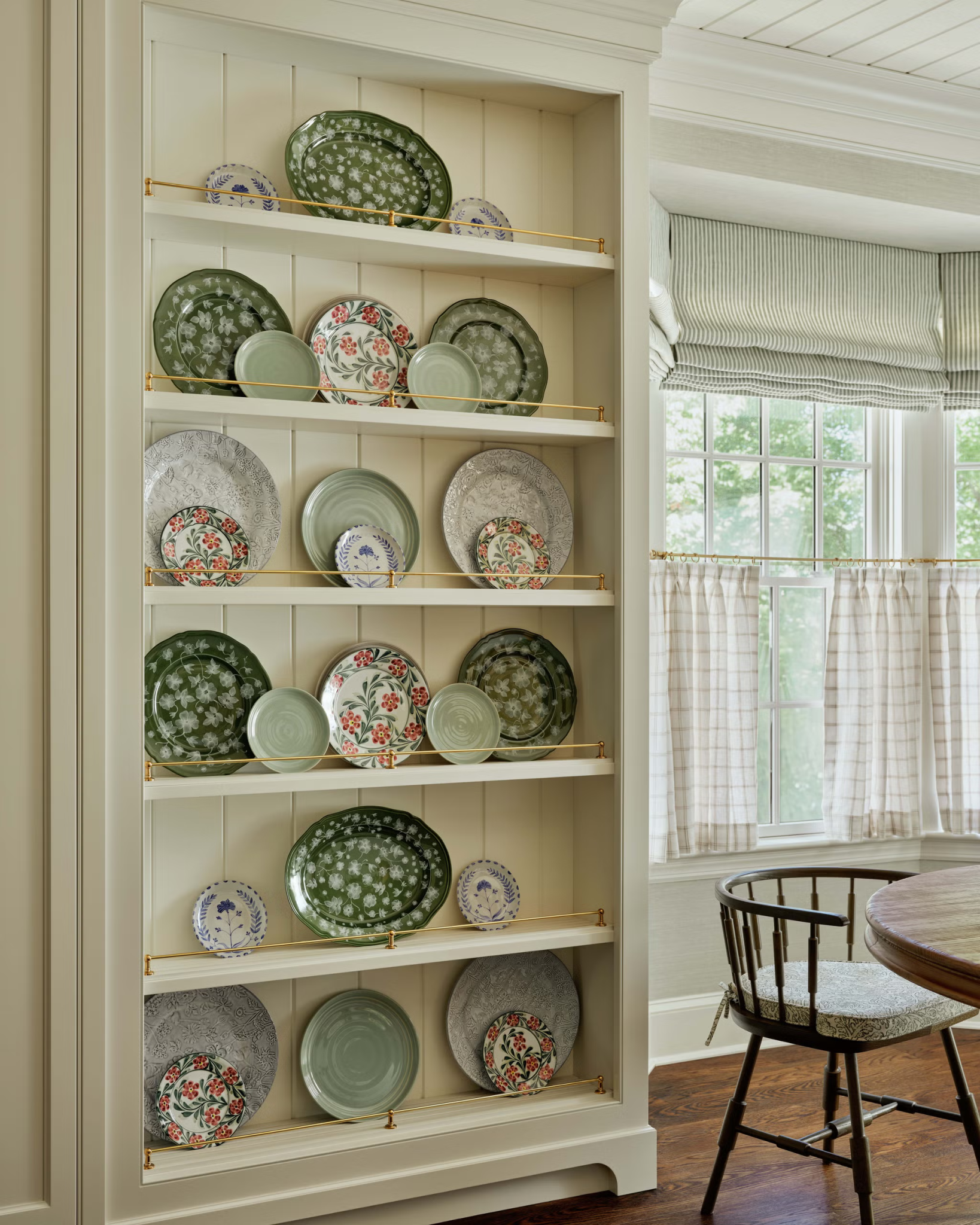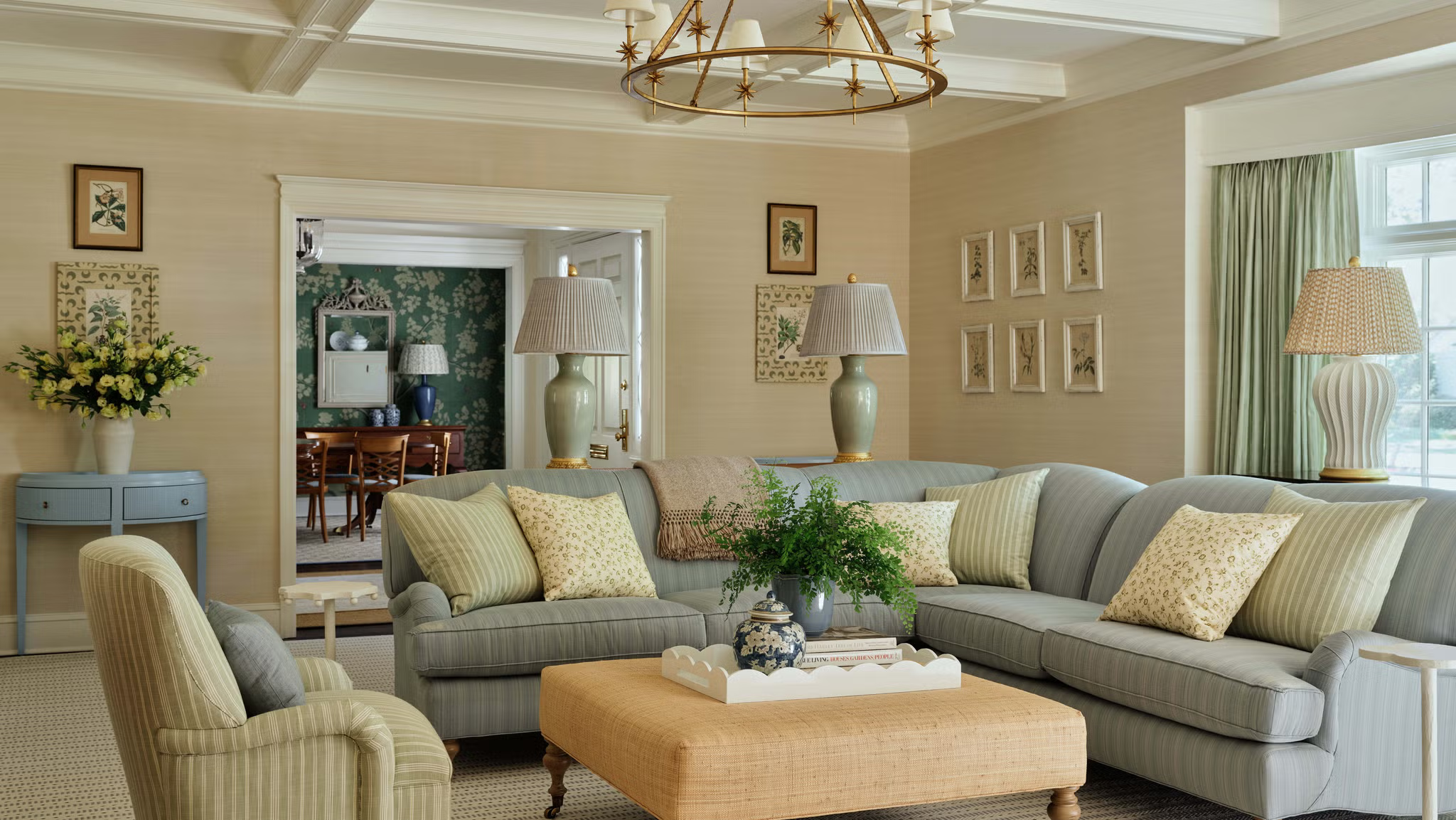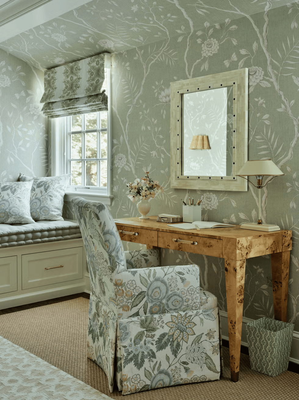 Για την τραπεζαρία, η Okin επέλεξε μια ταπετσαρία σε βαθύ πράσινο που μετατρέπει το δωμάτιο σε ένα έργο τέχνης από μόνο του. Το κεντρικό τραπέζι συμπληρώνεται από καρέκλες αντίκες που ανανεώθηκαν με ύφασμα Claremont. Οι κουρτίνες είναι custom από C&M Shade, ενώ το φωτιστικό McLean και ενισχύουν την κομψότητα του χώρου. Ο συνδυασμός των παραδοσιακών vintage και σύγχρονων στοιχείων δημιουργεί ένα χώρο που δείχνει διαχρονικός και πλούσιος σε χαρακτήρα.