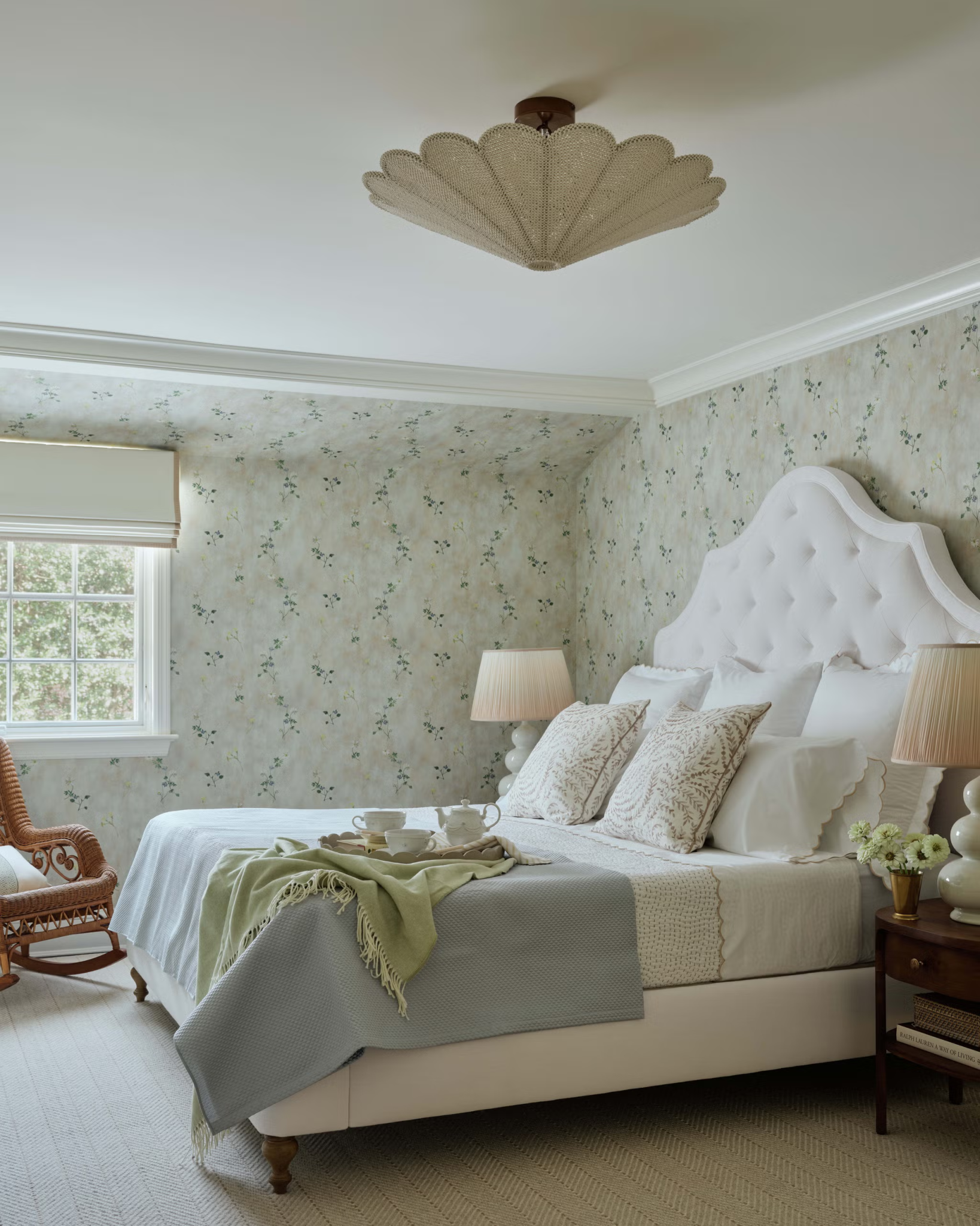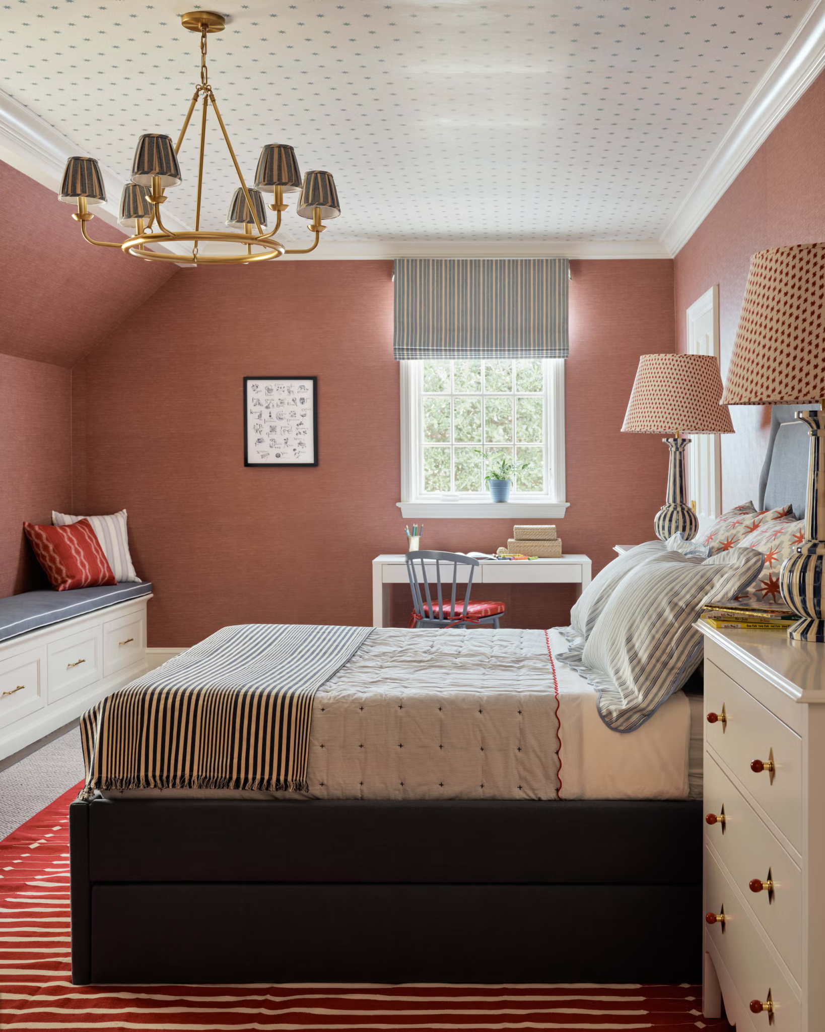 Τα υπνοδωμάτια, από αυτό του γιου μέχρι το ξενώνα, σχεδιάστηκαν με προσοχή στις ανάγκες του καθενός. Το παιδικό δωμάτιο ντύθηκε με ταπετσαρία και ουδέτερα χαλιά, ενώ ο ξενώνας με floral ταπετσαρία και έπιπλα από Serena & Lily για να δίνουν μια αισθητική χαλάρωσης.