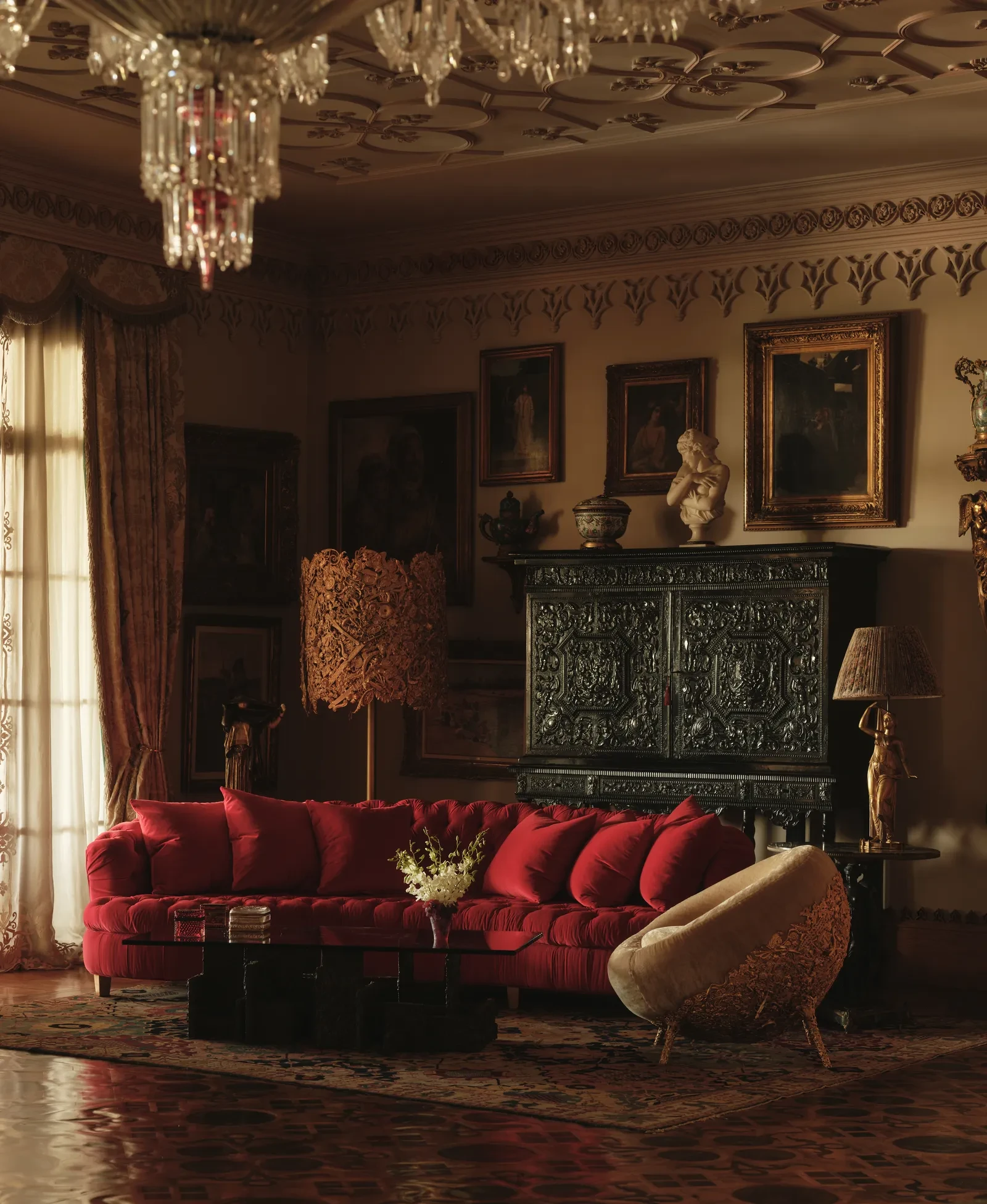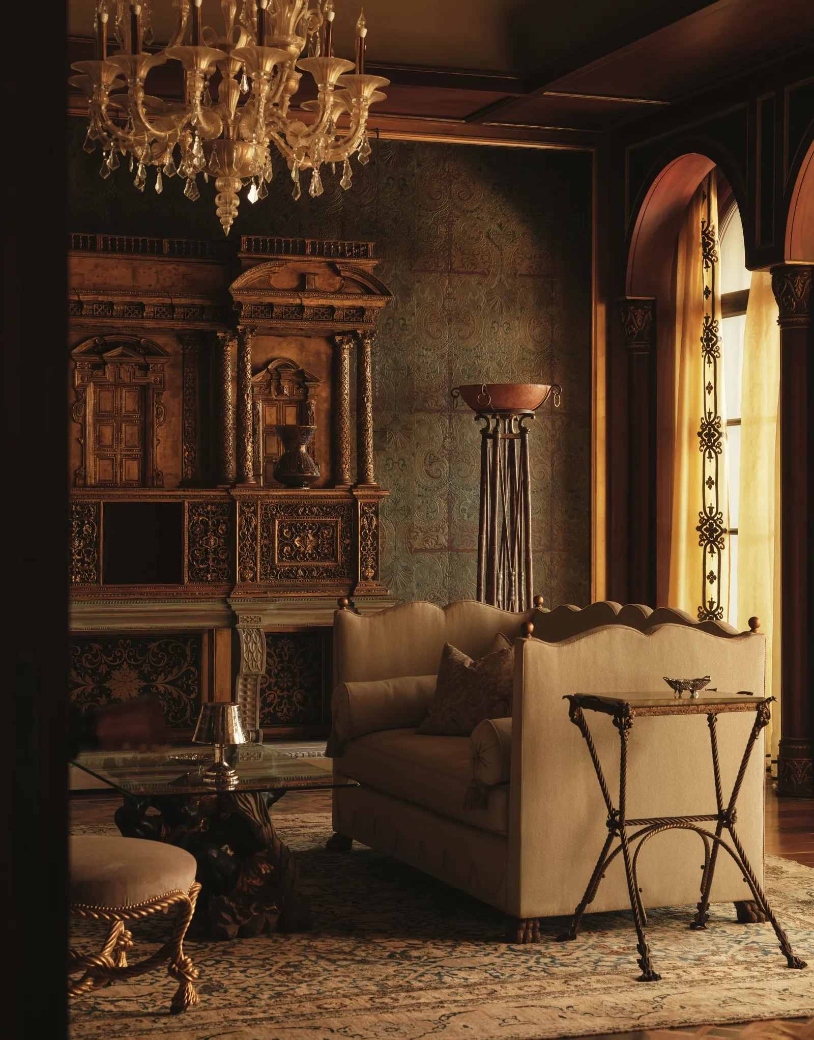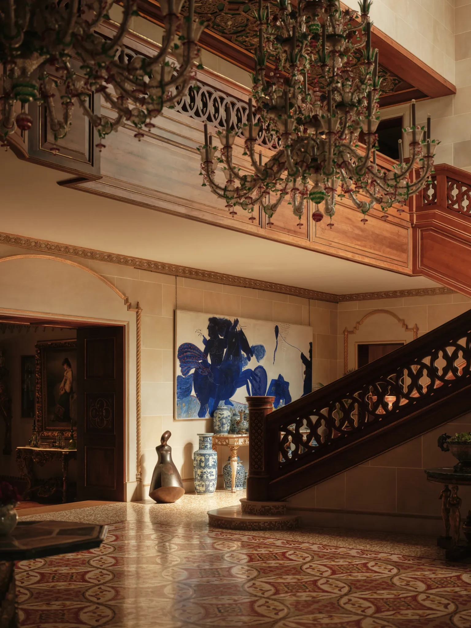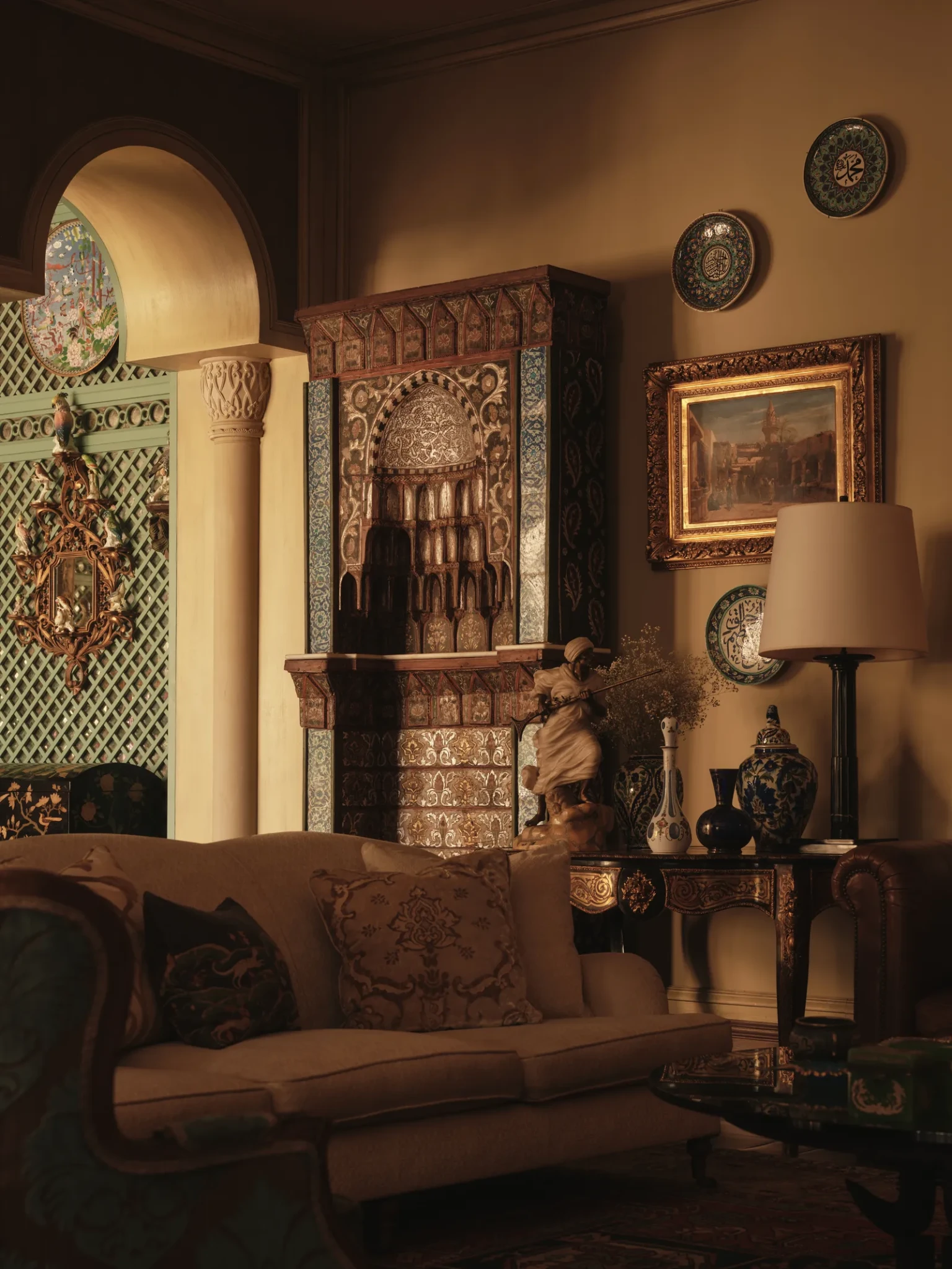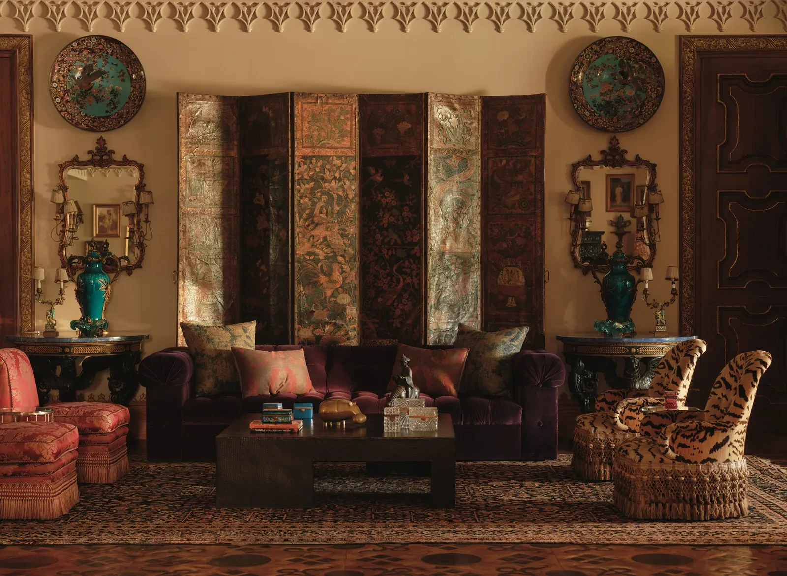 Στο κεντρικό σαλόνι, η El Tanani μεταμόρφωσε μια περίτεχνη ινδική οθόνη σε έκθεση σπάνιων έργων τέχνης, των οποίων τα μοτίβα αντηχούν με την αψιδωτή κιονοστοιχία που εμπνέεται από την ισλαμική αρχιτεκτονική. Στην ίδια ενότητα, αιγυπτιακά έργα και φιγούρες των δυναστειών Tang και Ming συνυπάρχουν με σύγχρονα έργα των Fernando και Humberto Campana, δημιουργώντας έναν διάλογο ανάμεσα στο παλιό και το νέο. Το μικρό σαλόνι φιλοξενεί μια εντυπωσιακή βενετσιάνικη κασέλα, στο κέντρο της οικογενειακής ζωής, περιβαλλόμενη από οριενταλιστικούς πίνακες του 18ου και 19ου αιώνα που απεικονίζουν φανταστικά ταξίδια και μακρινούς προορισμούς.