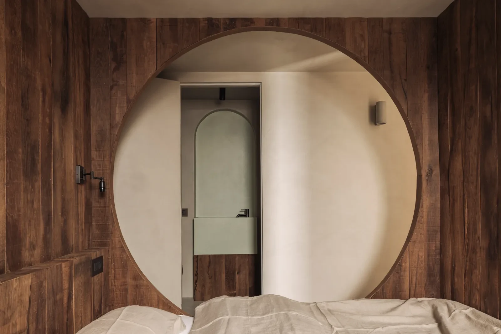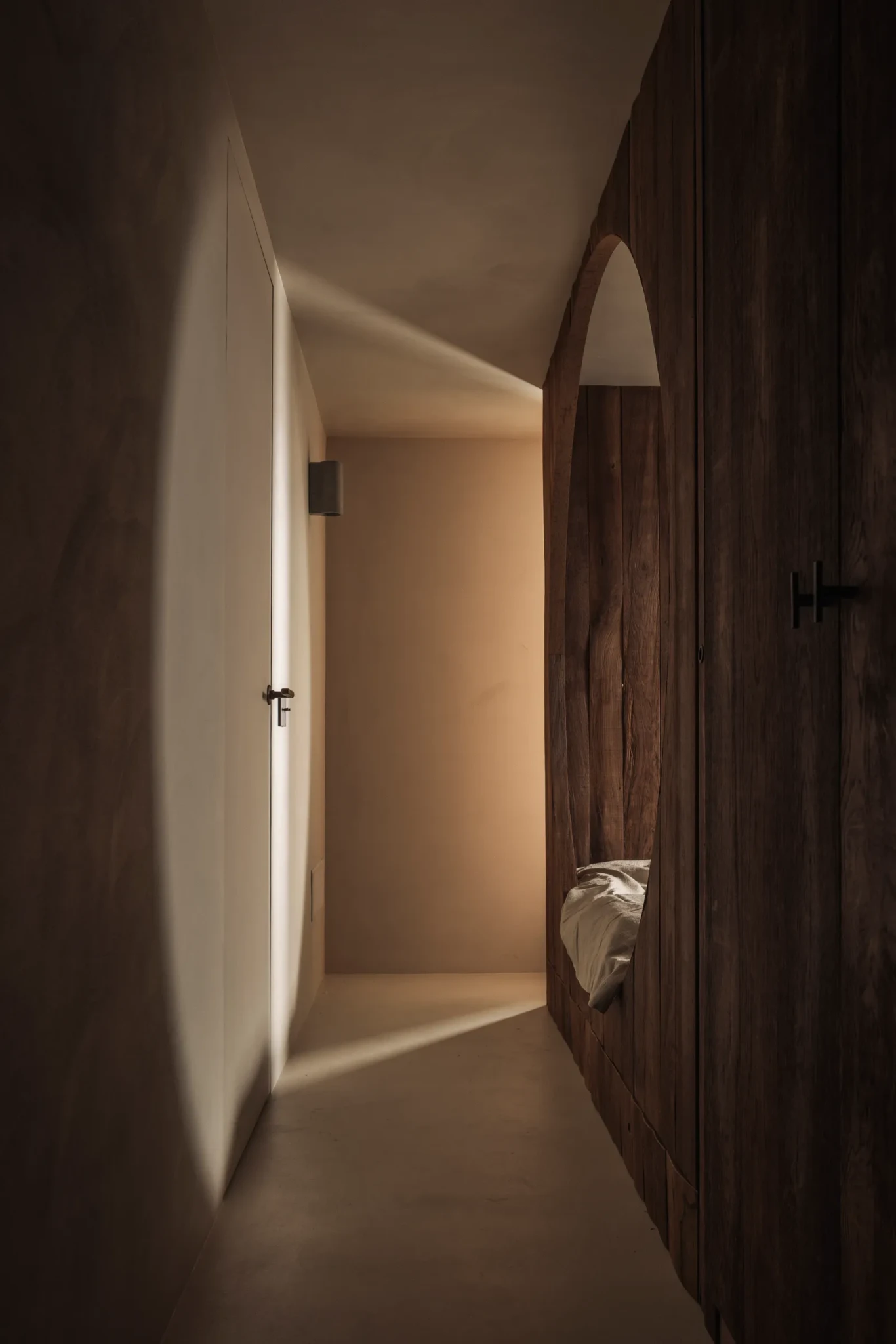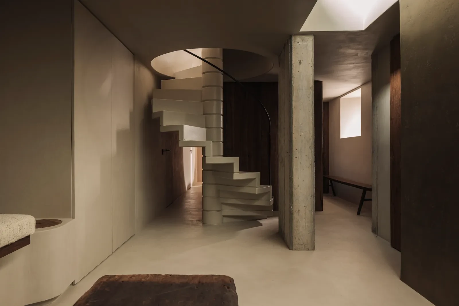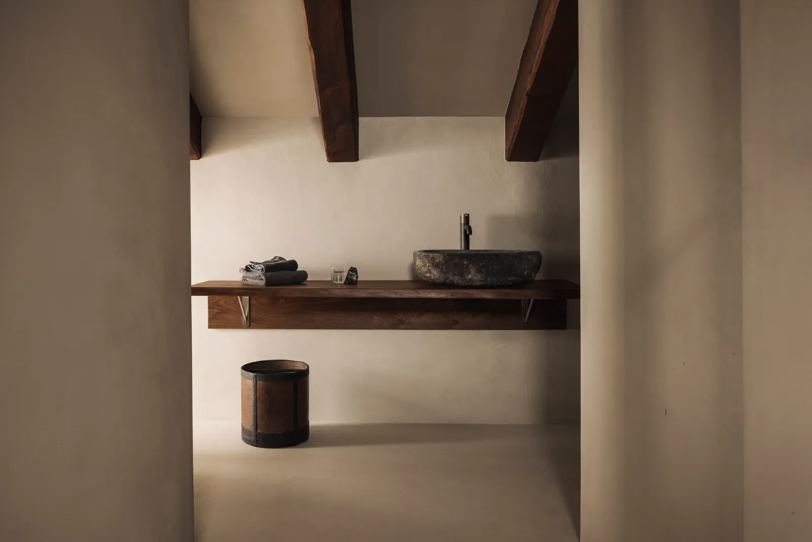 Στο εσωτερικό, η αισθητική ακολουθεί τη φιλοσοφία της ηρεμίας και του μέτρου. Οι χώροι παραμένουν λιτοί, χωρίς περιττά διακοσμητικά στοιχεία, αφήνοντας τα υλικά να αφηγηθούν τη δική τους ιστορία. Η διακόσμηση περιορίζεται σε λίγα vintage έπιπλα από την περιοχή, που φέρουν τη γοητεία του χρόνου και την απλότητα της τοπικής παράδοσης. Οι υφές των υλικών, το φυσικό φως και οι σκιές που εναλλάσσονται καθ’ όλη τη διάρκεια της ημέρας συνθέτουν ένα ήρεμο, σχεδόν διαλογιστικό σκηνικό.
