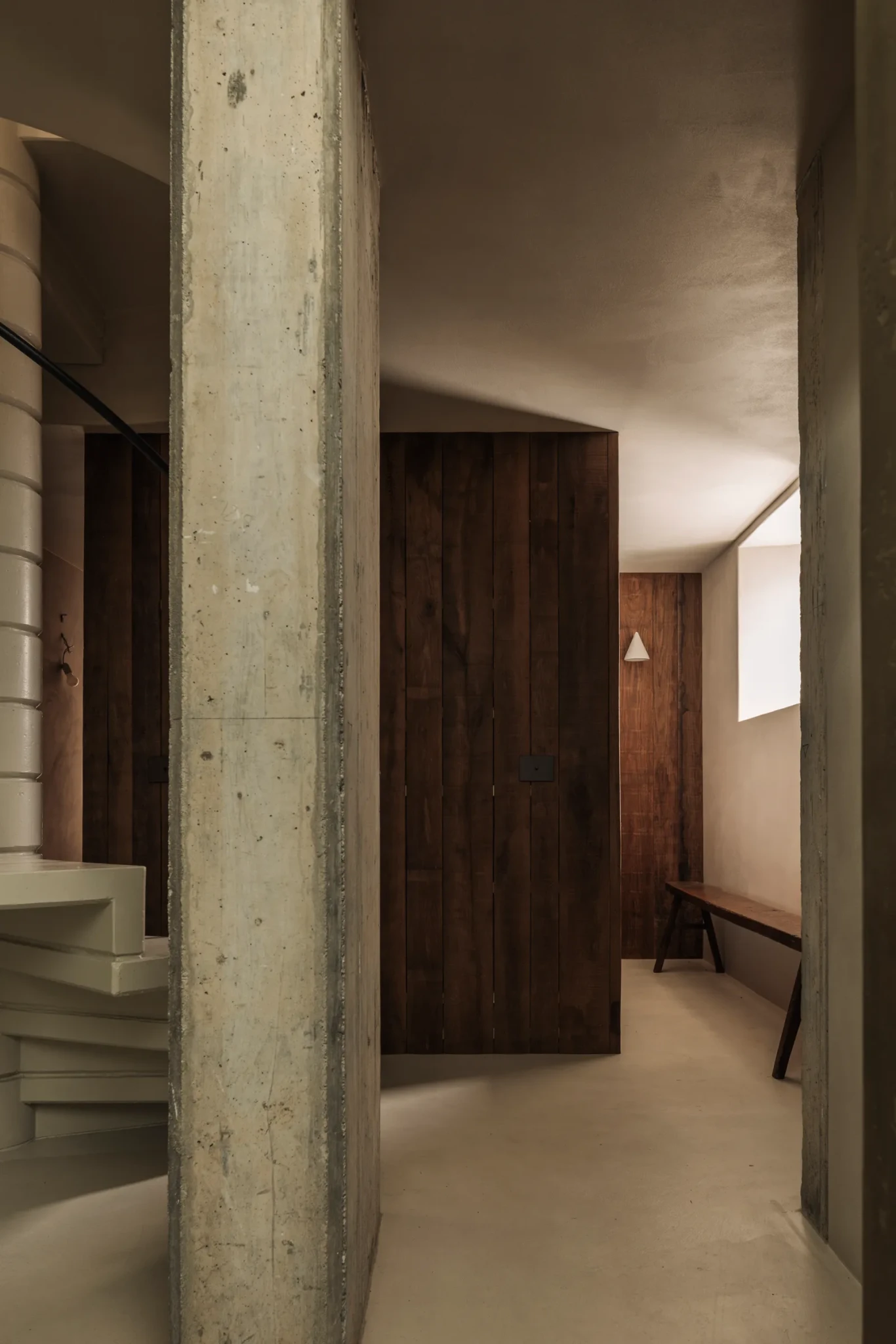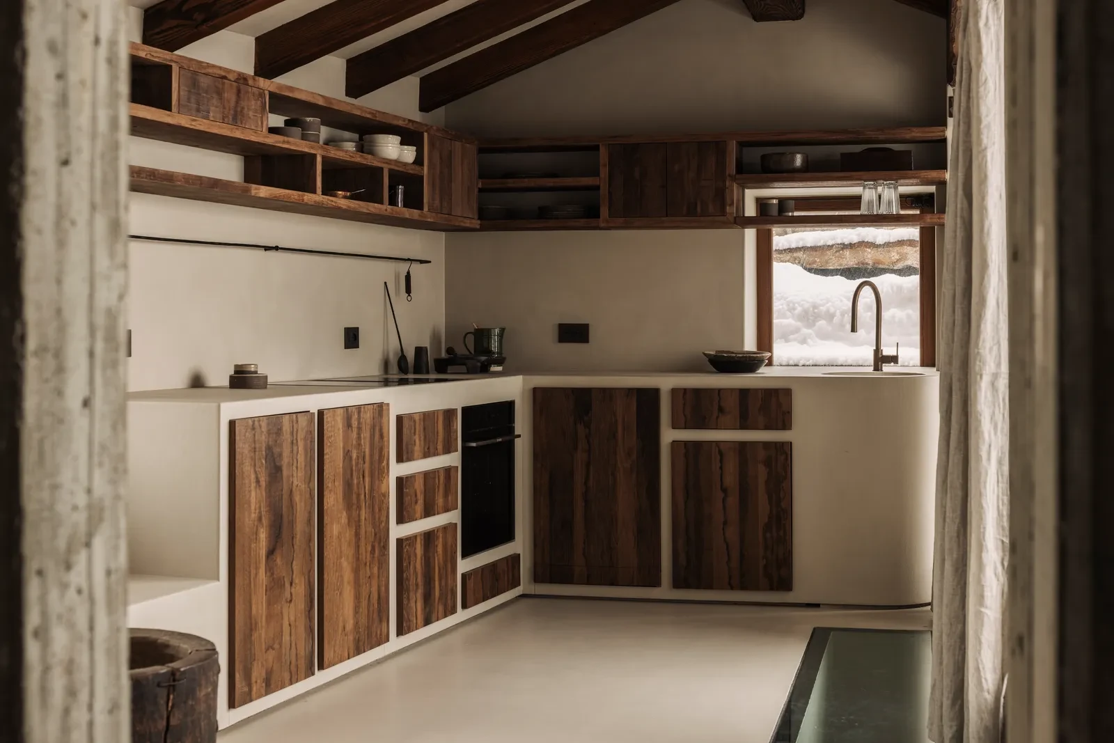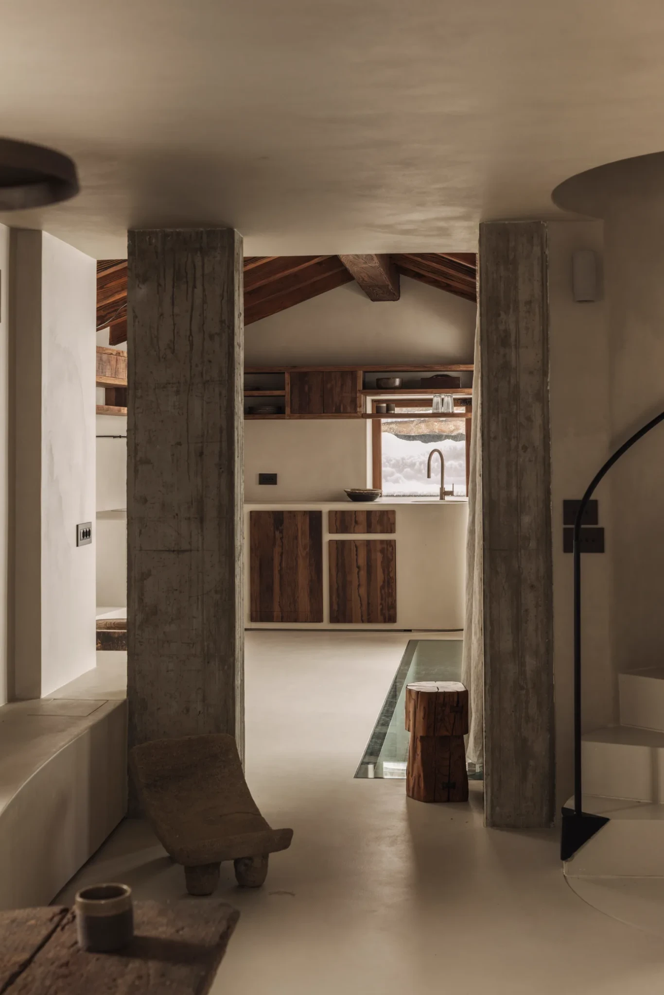 Το γυαλισμένο σκυρόδεμα, σε απαλούς τόνους, συμπληρώνει το ξύλο και προσδίδει μοντέρνα ισορροπία, ενώ ο συνδυασμός των δύο υλικών εκφράζει τον διάλογο ανάμεσα στη στιβαρότητα και τη ζεστασιά. Ακόμη και η μεταφορά των υλικών πραγματοποιήθηκε με σεβασμό στο περιβάλλον. Οι βαριές ξύλινες δοκοί μεταφέρθηκαν με ελικόπτερο, καθώς το σημείο δεν ήταν εύκολα προσβάσιμο από το έδαφος. Το αποτέλεσμα είναι ένα έργο όπου κάθε λεπτομέρεια κρύβει μια ιστορία φροντίδας, δεξιοτεχνίας και αφοσίωσης.