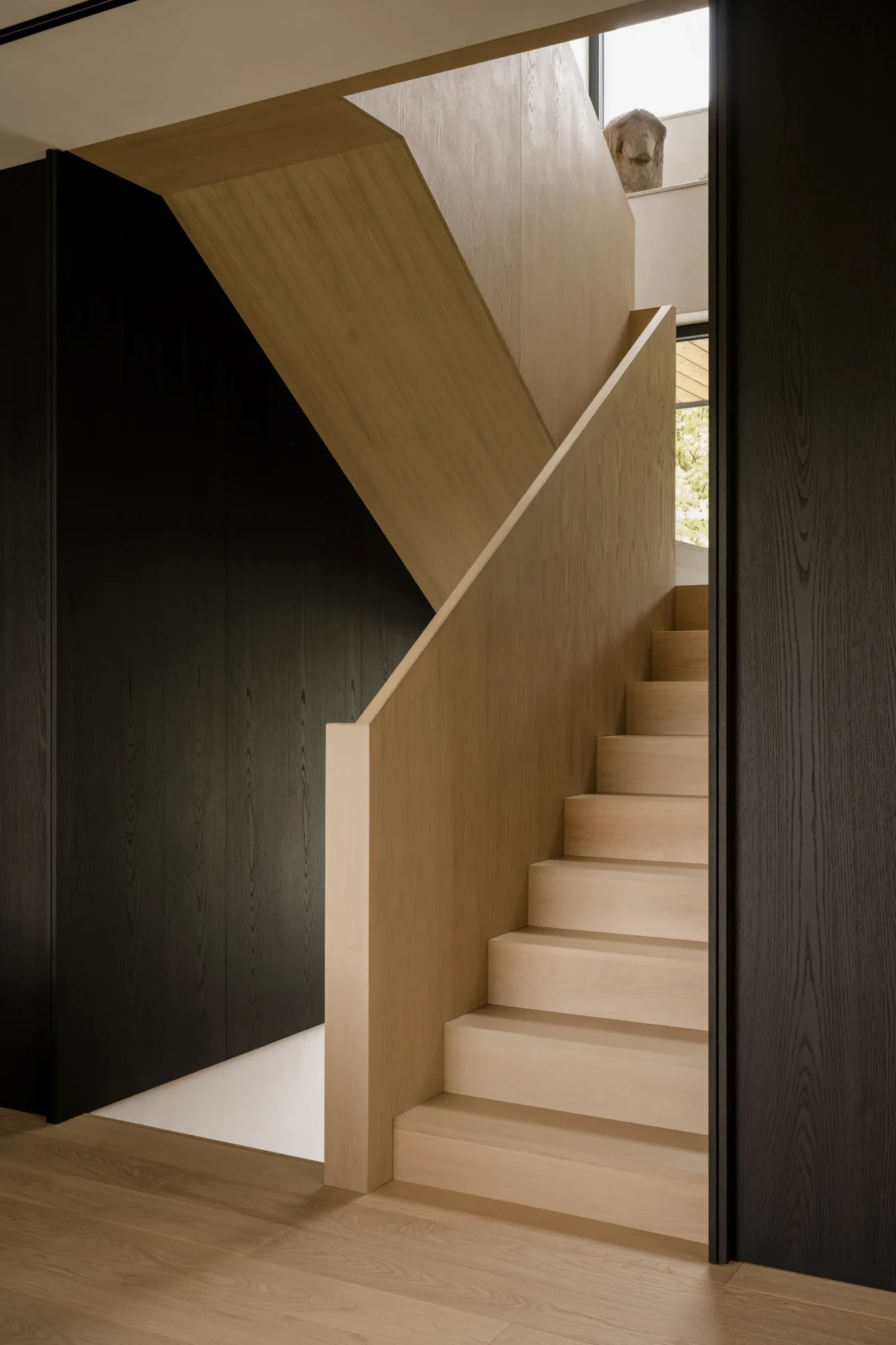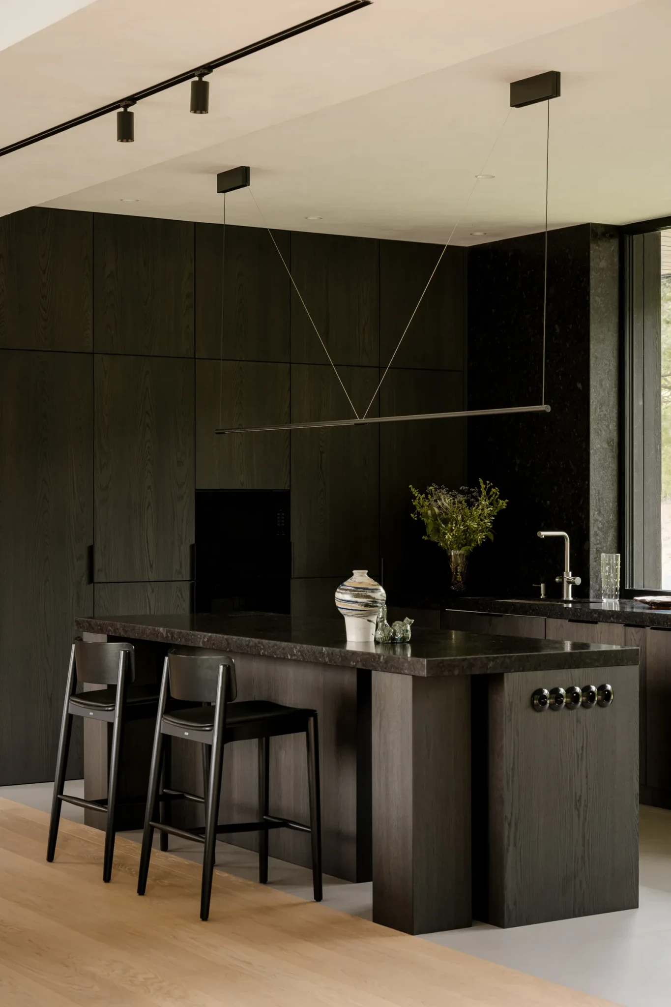 Η ατμόσφαιρα του σπιτιού στηρίζεται σε μια σύνθεση φυσικών υλικών και τόνων που μιμούνται τη γαλήνη του περιβάλλοντος. Ο σκούρος δρυς στους τοίχους και τις οροφές δημιουργεί βάθος και ένταση, ενώ τα πιο ανοιχτόχρωμα ξύλα στα δάπεδα και τα έπιπλα προσφέρουν ισορροπία. Οι επιφάνειες καλύπτονται με άργιλο, δίνοντας μια ανάγλυφη, γήινη αίσθηση. Η κουζίνα ντύνεται με ανθεκτικό γρανίτη, ενώ τα μπάνια λάμπουν μέσα από το quartzite Naica, που προσθέτει πολυτέλεια χωρίς υπερβολές.