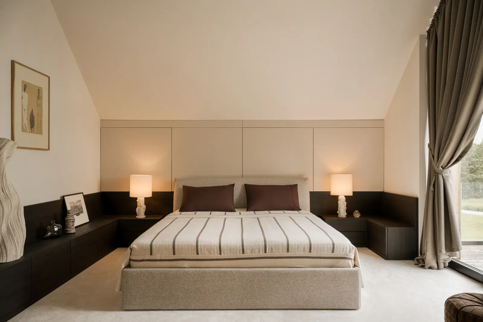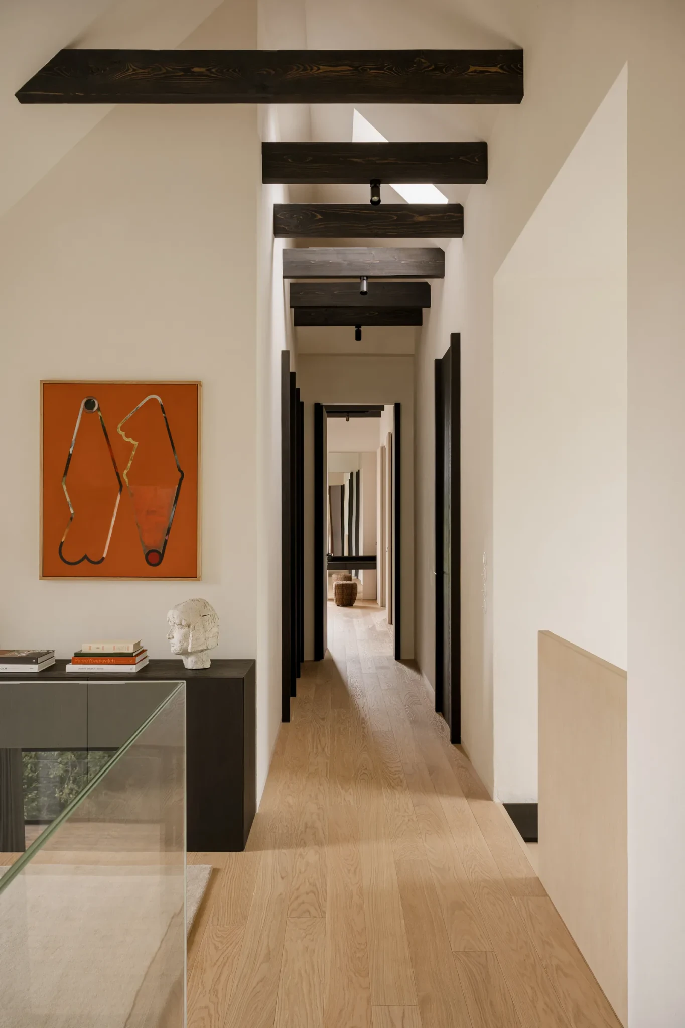 Η χρωματική παλέτα κινείται ανάμεσα σε απαλούς τόνους μπεζ και φυσικού ξύλου, δημιουργώντας γαλήνια ατμόσφαιρα. Τα μαύρα και σκούρα καφέ στοιχεία παραπέμπουν στο καμένο ξύλο της πρόσοψης, ενώ διακριτικές πινελιές κόκκινου και σκουριάς προσθέτουν χαρακτήρα και ζωντάνια. Το αποτέλεσμα είναι ένας διάλογος ανάμεσα στο ήρεμο και το έντονο, στο γήινο και το εκφραστικό.