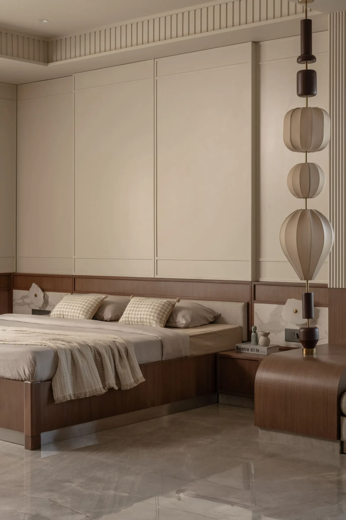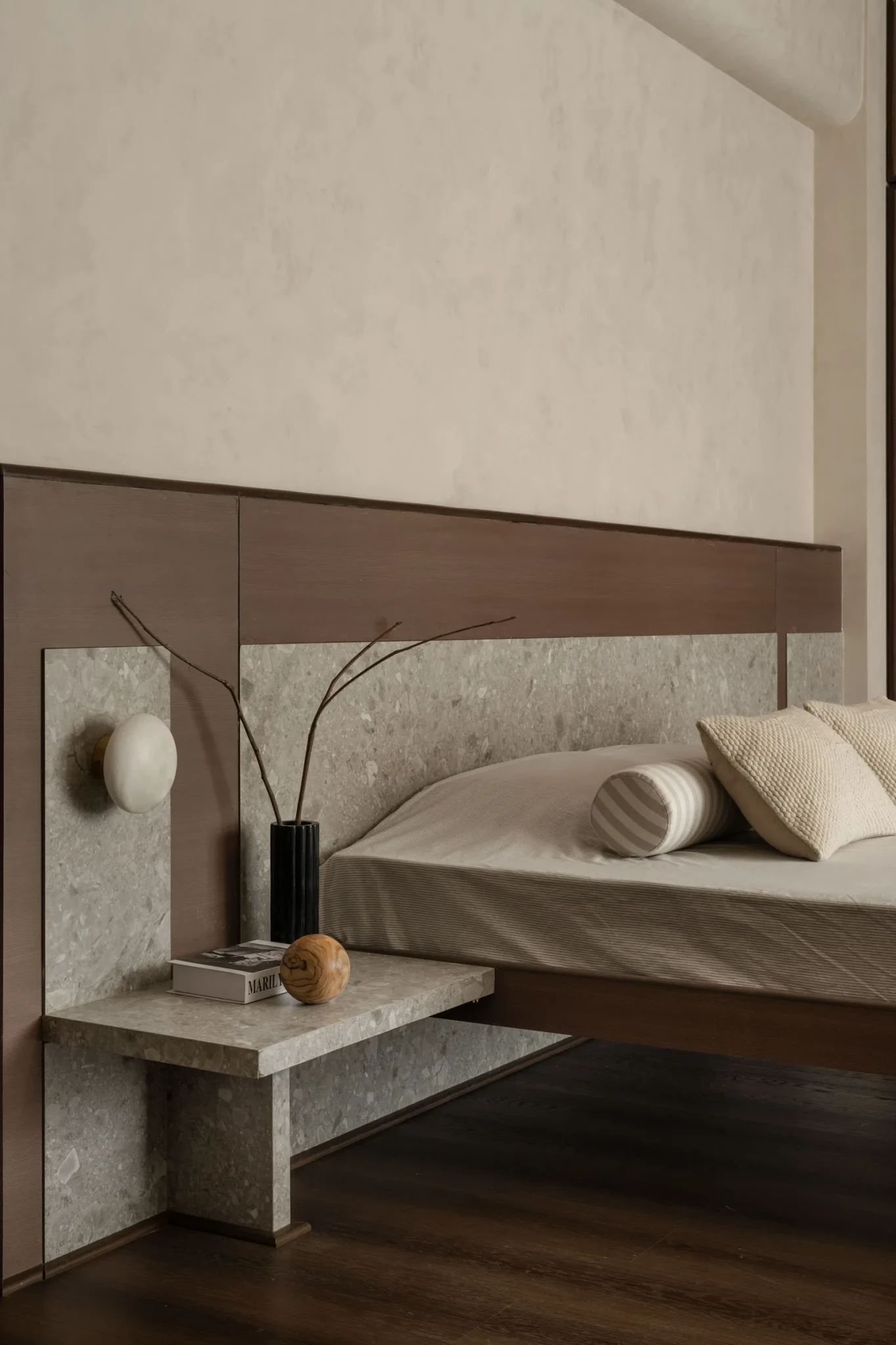 Στα υπνοδωμάτια, η ατμόσφαιρα γίνεται ακόμη πιο ήρεμη. Οι ίδιες αποχρώσεις επαναλαμβάνονται με πιο απαλό τρόπο, ενώ τα υλικά δημιουργούν μια αίσθηση προστασίας και οικειότητας. Το φως παραμένει βασικό στοιχείο, ενώ οι λεπτομέρειες περιορίζονται στο απολύτως απαραίτητο. Οι χώροι αυτοί δεν επιδιώκουν να εντυπωσιάσουν, αλλά να προσφέρουν ηρεμία.
