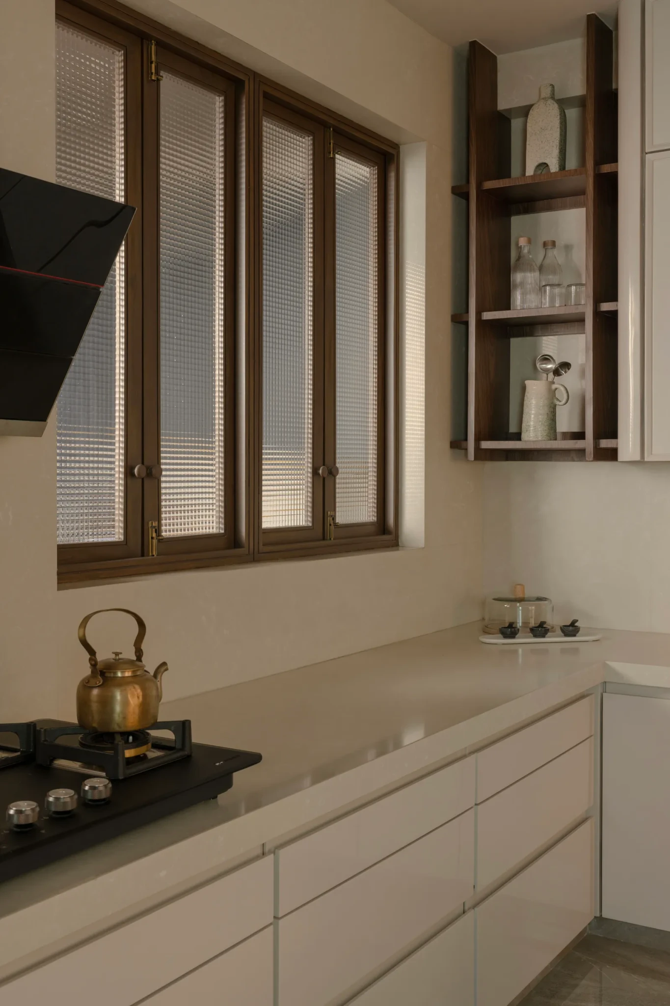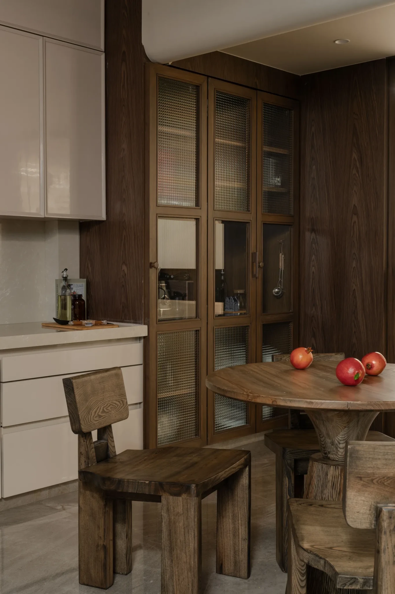 Η κουζίνα ενσωματώνεται πλήρως στον χώρο, χωρίς να διαχωρίζεται έντονα από τις υπόλοιπες λειτουργίες. Οι επιφάνειες ακολουθούν την ίδια γήινη παλέτα, ενώ τα υλικά διατηρούν τη φυσικότητά τους. Οι αποθηκευτικοί χώροι είναι διακριτικά ενσωματωμένοι, διατηρώντας την καθαρότητα της σύνθεσης. Το αποτέλεσμα είναι ένας χώρος που λειτουργεί πρακτικά, χωρίς να διαταράσσει την αισθητική ισορροπία.