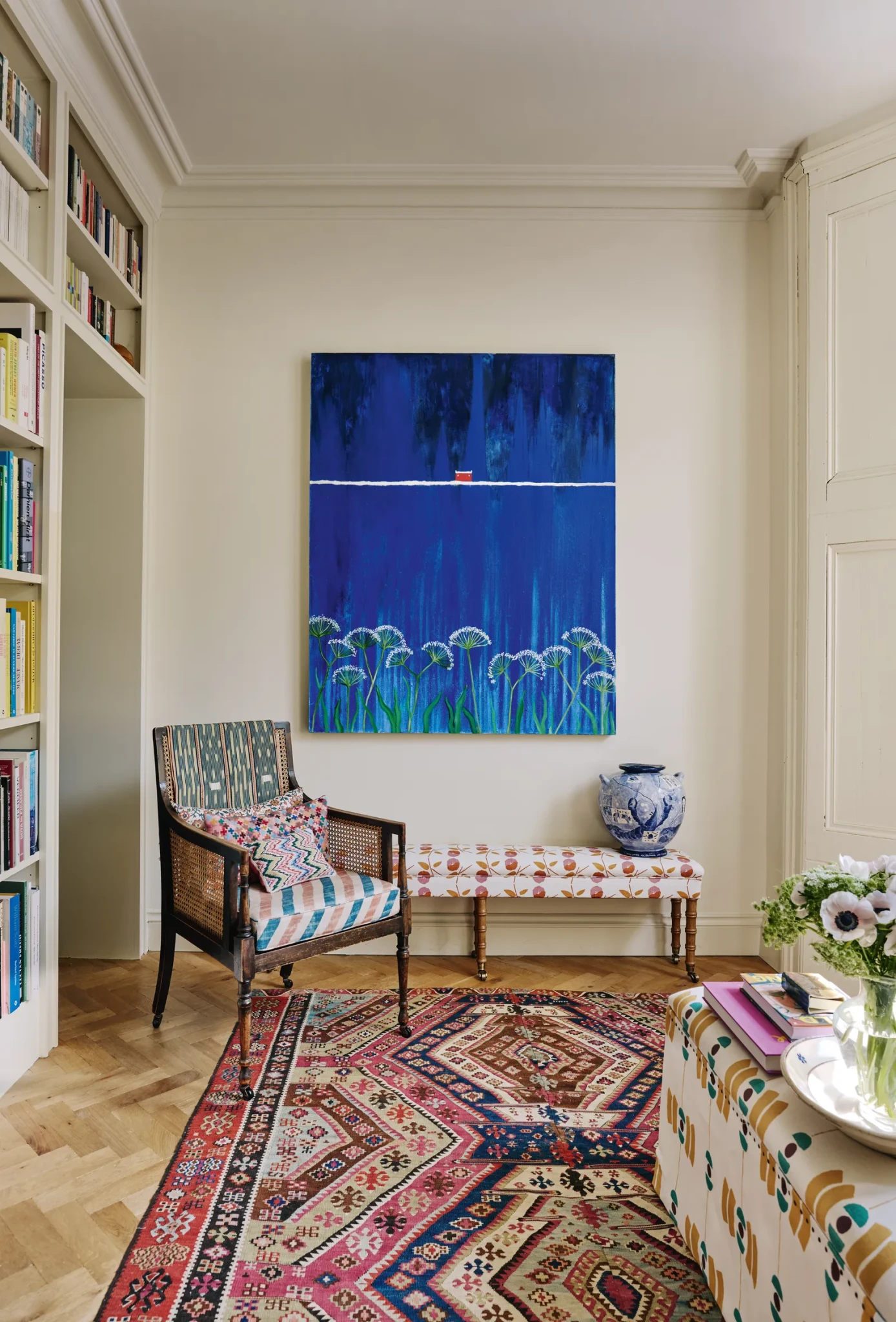 Στην ήσυχη πλευρά του σπιτιού, στο υπνοδωμάτιο, η Lyndsey έχει εναποθέσει πολύ προσωπικά έργα, μεταξύ αυτών και μια λεπτή αλλά δυνατή ζωγραφιά «magnolia» της Sarah Graham, που θέτει τον τόνο για μια πιο ξεκούραστη ατμόσφαιρα.