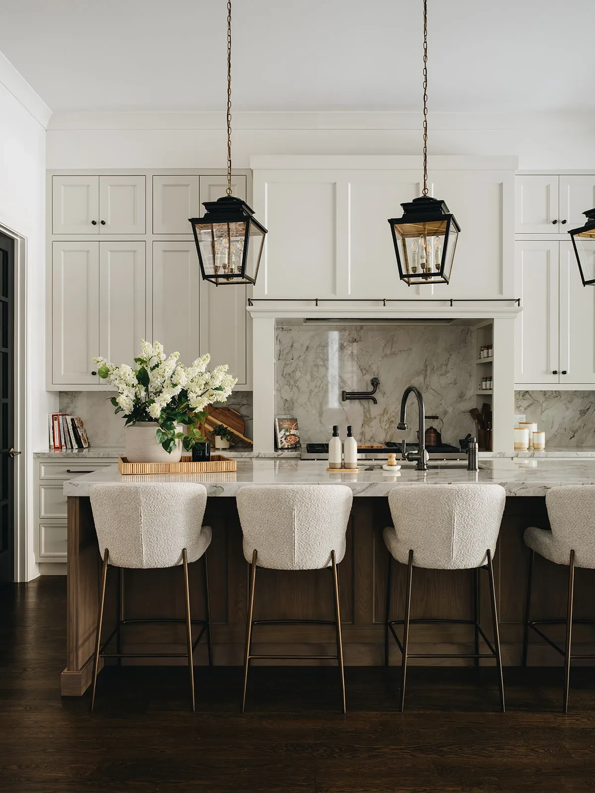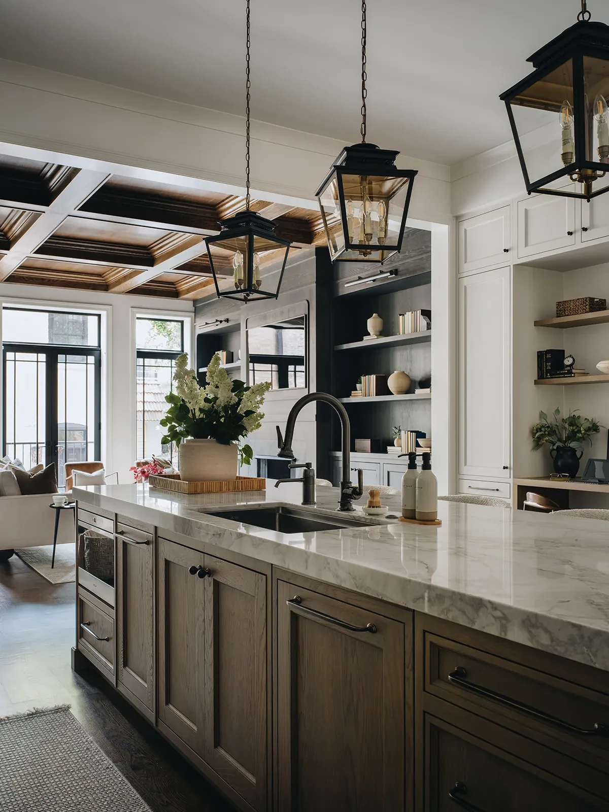 Στο οικογενειακό καθιστικό με την ξύλινη οροφή και στην παρακείμενη κουζίνα, η μαεστρία της Thompson με το ασπρόμαυρο αποκαλύπτεται πλήρως. Σκούρα ντουλάπια με μαρμάρινο πλαίσιο δημιουργούν μια σχεδόν dramatic εικόνας, χωρίς όμως σκληρότητα. «Είναι ένας συνδυασμός μαύρου και ανθρακί με όμορφες διαβαθμίσεις που δεν το κάνουν έντονο», εξηγεί. Η κουζίνα, σχεδιασμένη για συγκεντρώσεις, συνδυάζει λευκή δρύινη επίπλωση με ντουλάπια από ανοιχτόχρωμο ξύλο, δημιουργώντας μια ατμόσφαιρα ζεστασιάς και φιλόξενης διάθεσης.