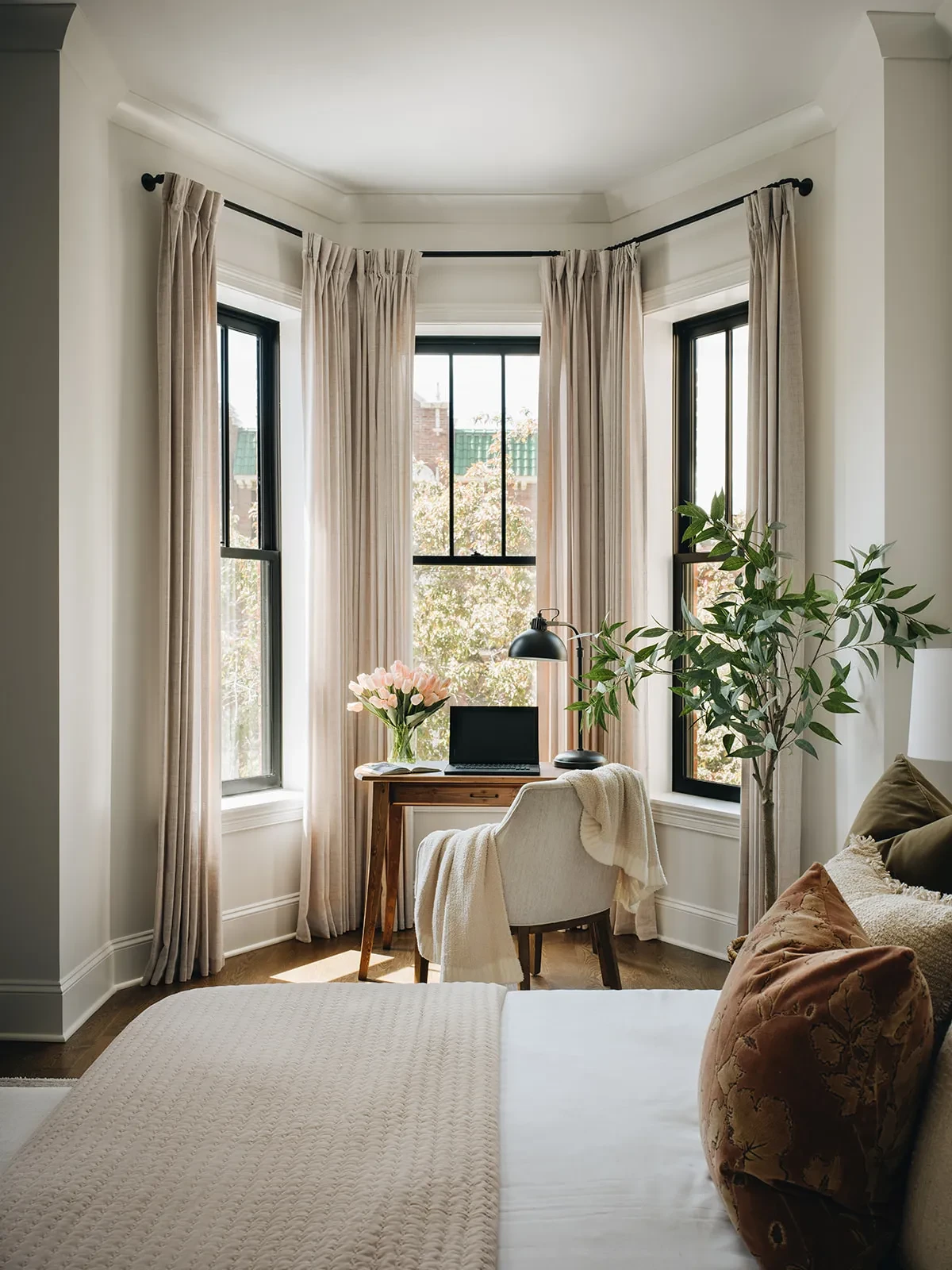 Στον πάνω όροφο, η κύρια σουίτα αναδεικνύει πιο απαλές γήινες αποχρώσεις, με λευκό φόντο και μαύρα πλαίσια παραθύρων. «Όποιος μπαίνει στο δωμάτιο δε θέλει να φύγει», λέει η Thompson, αναδεικνύοντας τη γαλήνη και την αίσθηση αναζωογόνησης που προσφέρει ο χώρος. Η προσοχή στη λεπτομέρεια, από τα υλικά μέχρι τα έπιπλα, ολοκληρώνει την πολυτέλεια και την κομψότητα, κάνοντας κάθε στοιχείο, όσο μικρό κι αν είναι, να ξεχωρίζει.