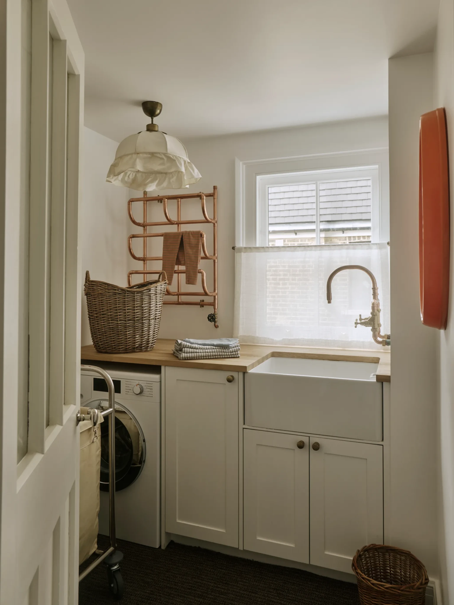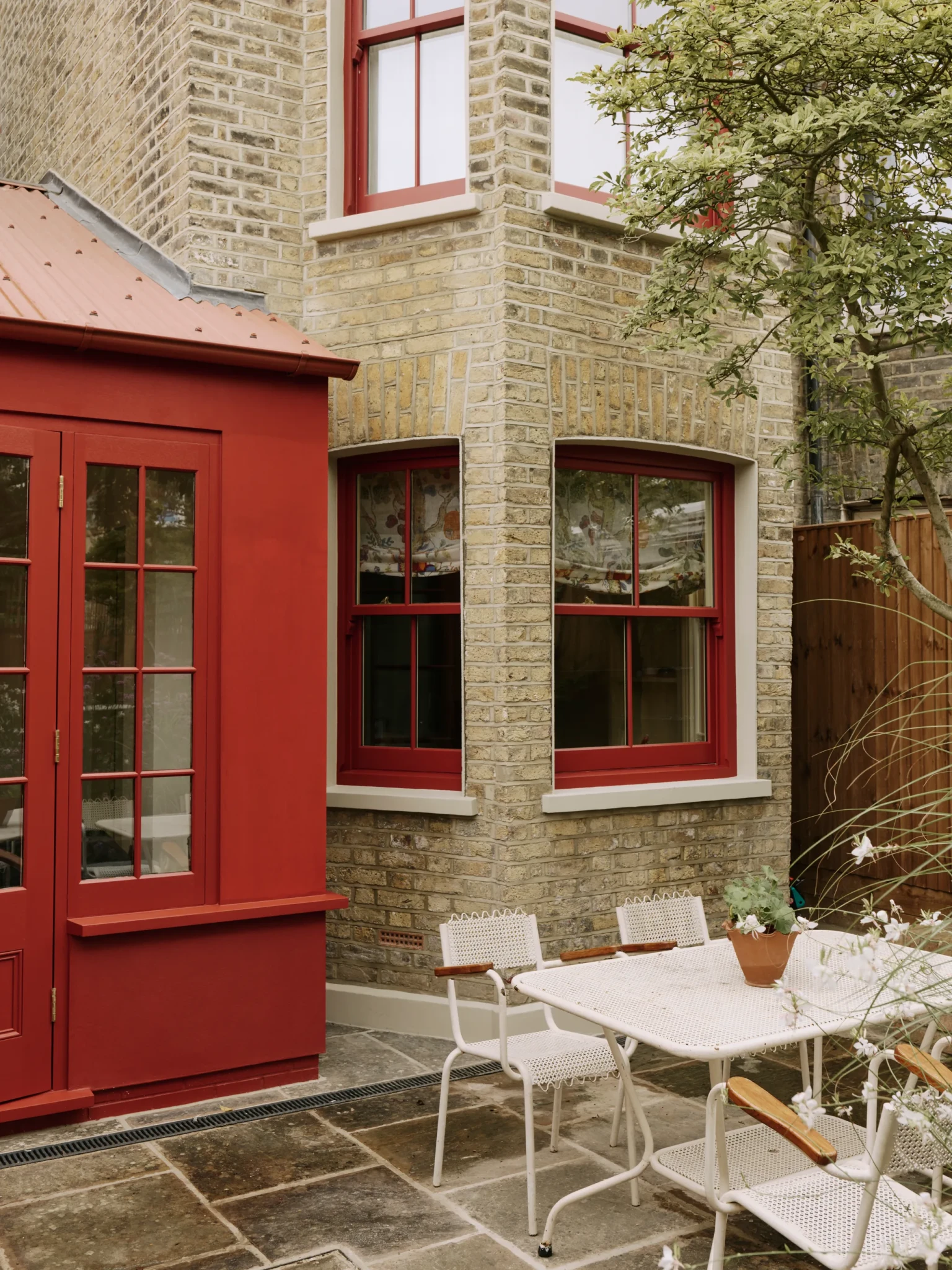 Το εξωτερικό του σπιτιού είναι εξίσου εντυπωσιακό. Η νέα επέκταση ντύθηκε με έντονο κόκκινο, αρμονισμένο με τα παράθυρα, ενώ η στέγη καλύφθηκε με κυματοειδές μέταλλο, προσδίδοντας με αυτόν τον τρόπο μοντέρνο χαρακτήρα. Πρόκειται για μία τολμηρή επιλογή που δημιουργεί αντίθεση με την ουδέτερη και ήρεμη παλέτα των εσωτερικών χώρων, ενώ παράλληλα τιμά την ιστορική ταυτότητα του κτιρίου.