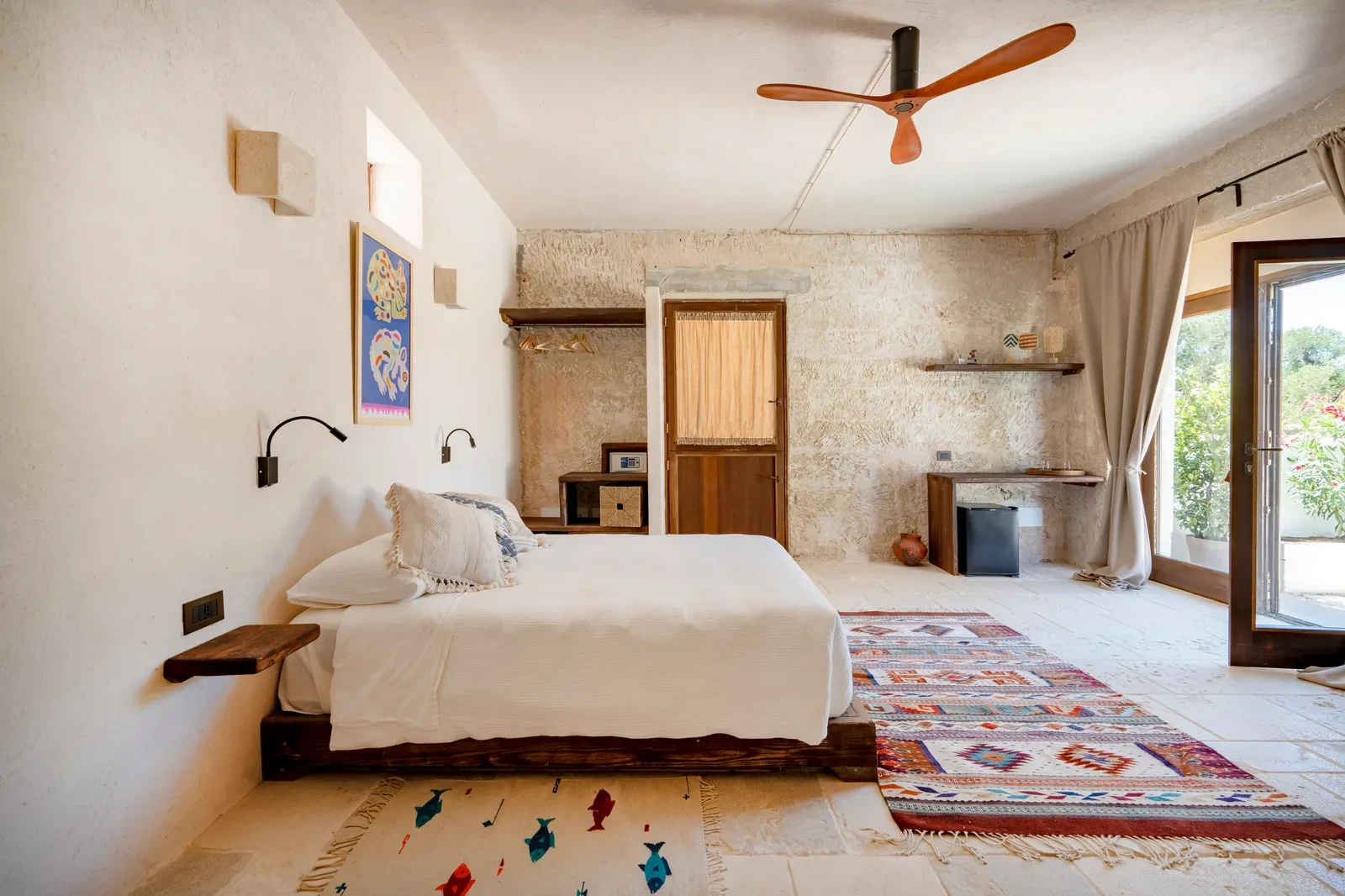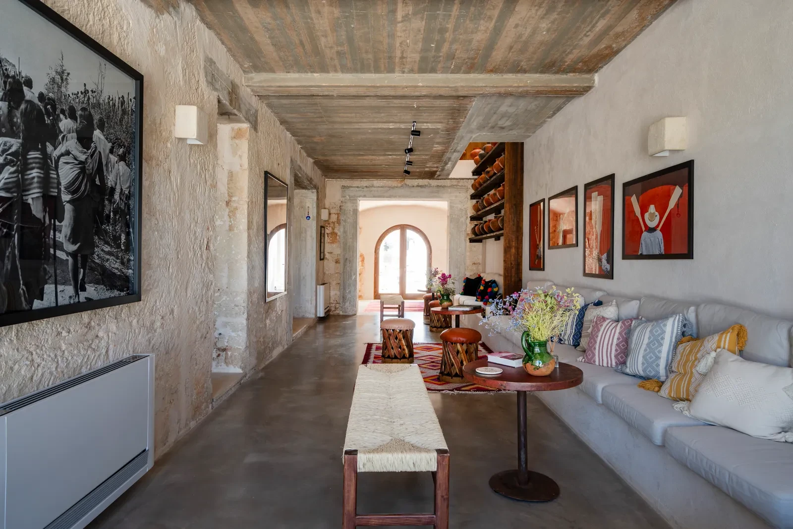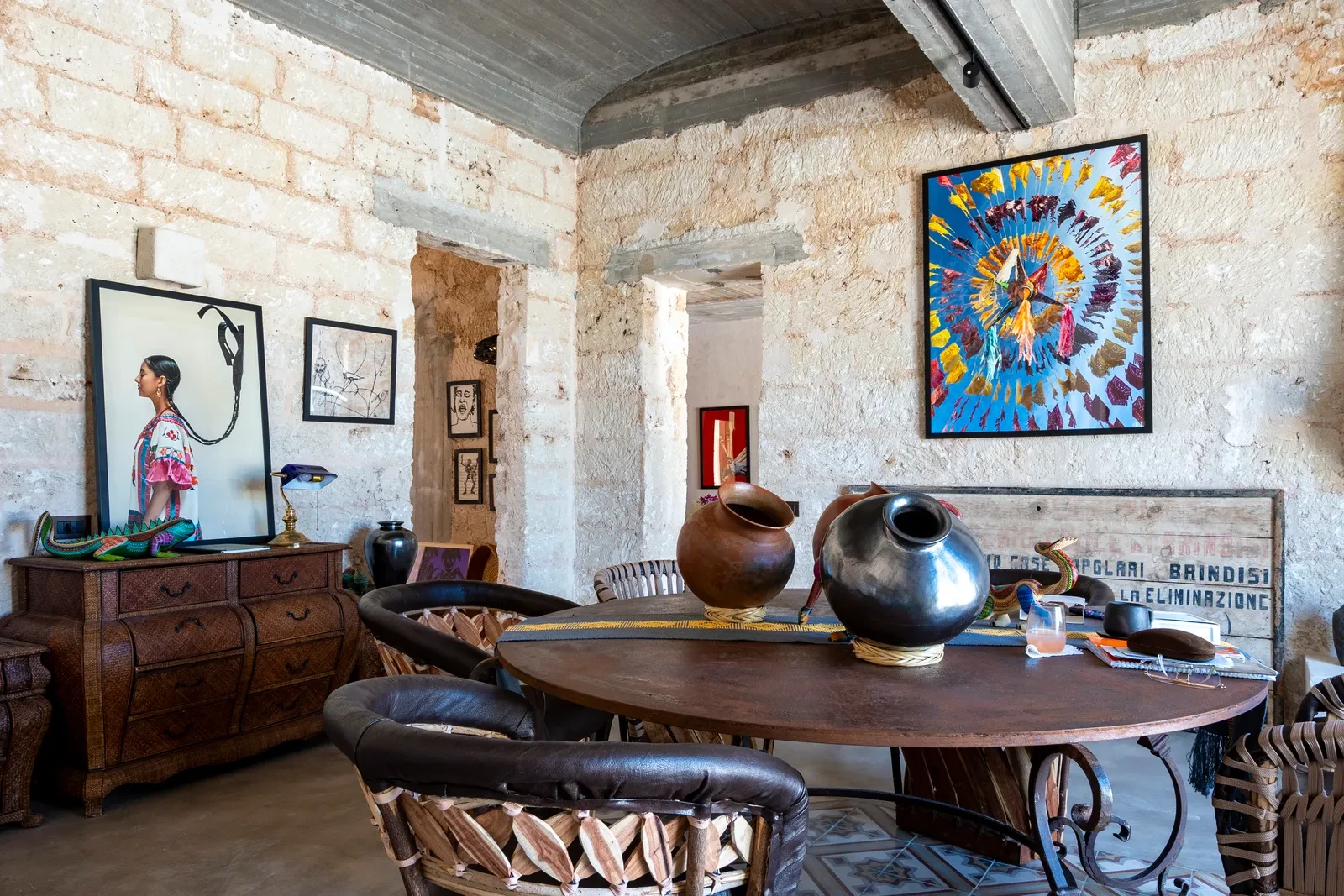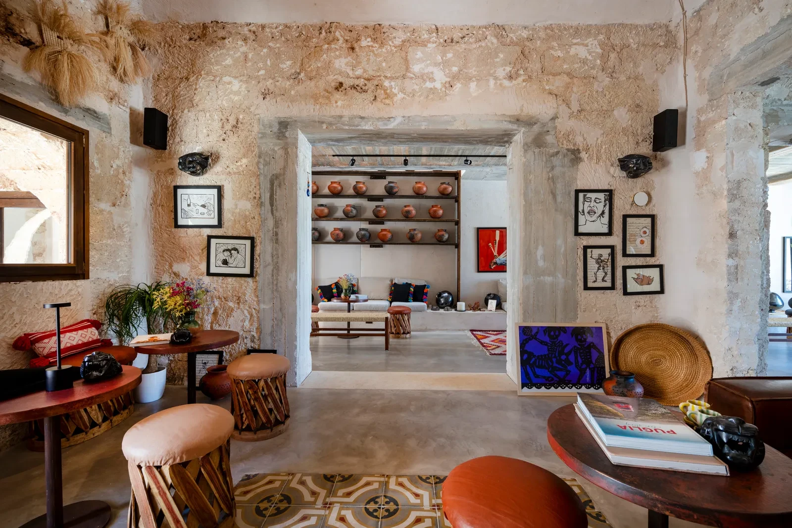 Το εσωτερικό της Mascienda Guadalupe είναι ένας ύμνος στη χειροποίητη δημιουργία. Έπιπλα από δέρμα και ξύλο του Jalisco, μπρούτζινα τραπέζια σφυρηλατημένα στο χέρι, κεραμικές λάμπες σε ζεστές αποχρώσεις, υφαντά από το Oaxaca και αιώρες από το Yucatán συνθέτουν μία ατμόσφαιρα εξωτική αλλά και οικεία. Σε κάθε δωμάτιο βρίσκονται σύμβολα της μεξικανικής λαϊκής τέχνης – alebrijes, ξυλόγλυπτοι ιαγουάροι, κεραμικά σε έντονα χρώματα – που δίνουν ένταση και χαρακτήρα. Παράλληλα, η πέτρα και το ξύλο της Puglia λειτουργούν σαν σταθερή βάση που «γειώνει» τον χώρο στη μεσογειακή πραγματικότητα.