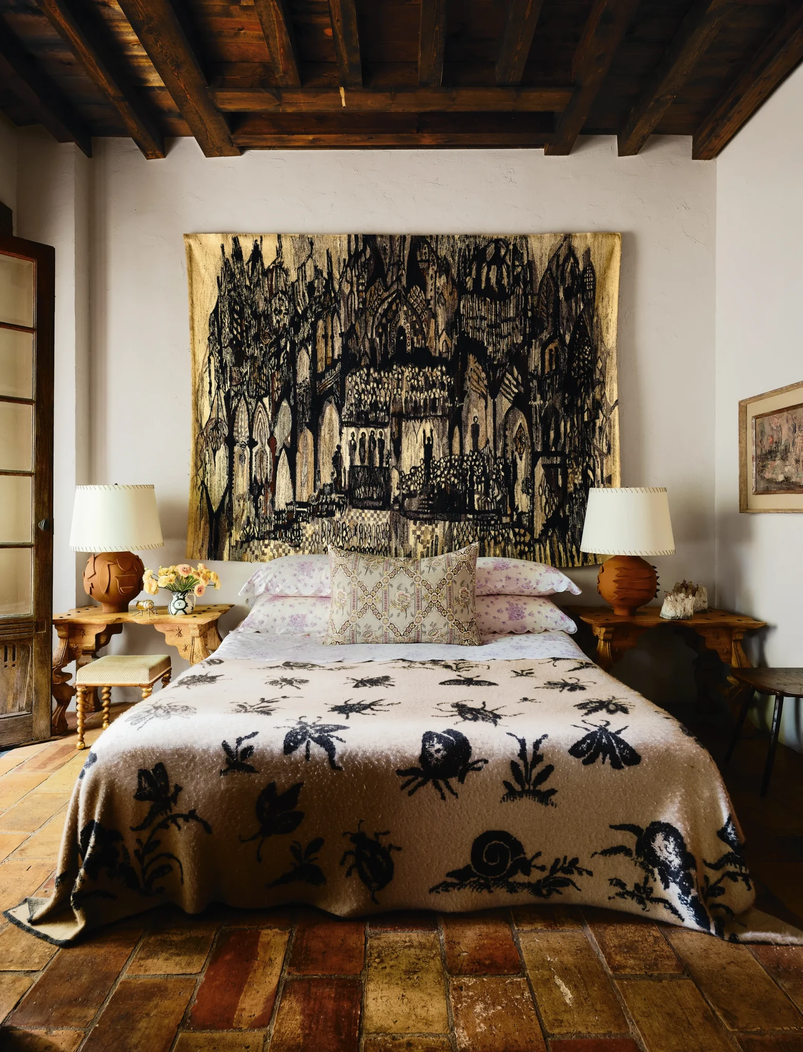 Στην κρεβατοκάμαρα, η designer επέλεξε να αναδείξει μια ατμοσφαιρική ταπετσαρία, πιθανώς από τα μέσα του 20ού αιώνα, ενώ η επιλογή υφασμάτων από floral λινό δίνει μια γυναικεία, σχεδόν ποιητική νότα στο δωμάτιο. Τα τραπεζάκια από ανακυκλωμένο ξύλο και οι terracotta λάμπες με λεπτομέρειες που παραπέμπουν σε έργα του Henri Matisse ολοκληρώνουν την αισθητική του χώρου. Ένα κασμιρένιο κουβερλί με μοτίβα εντόμων και φυτών προσθέτει μια διακριτική αλλά πλούσια υφή, η οποία ενώνεται αρμονικά με τα υπόλοιπα στοιχεία.
