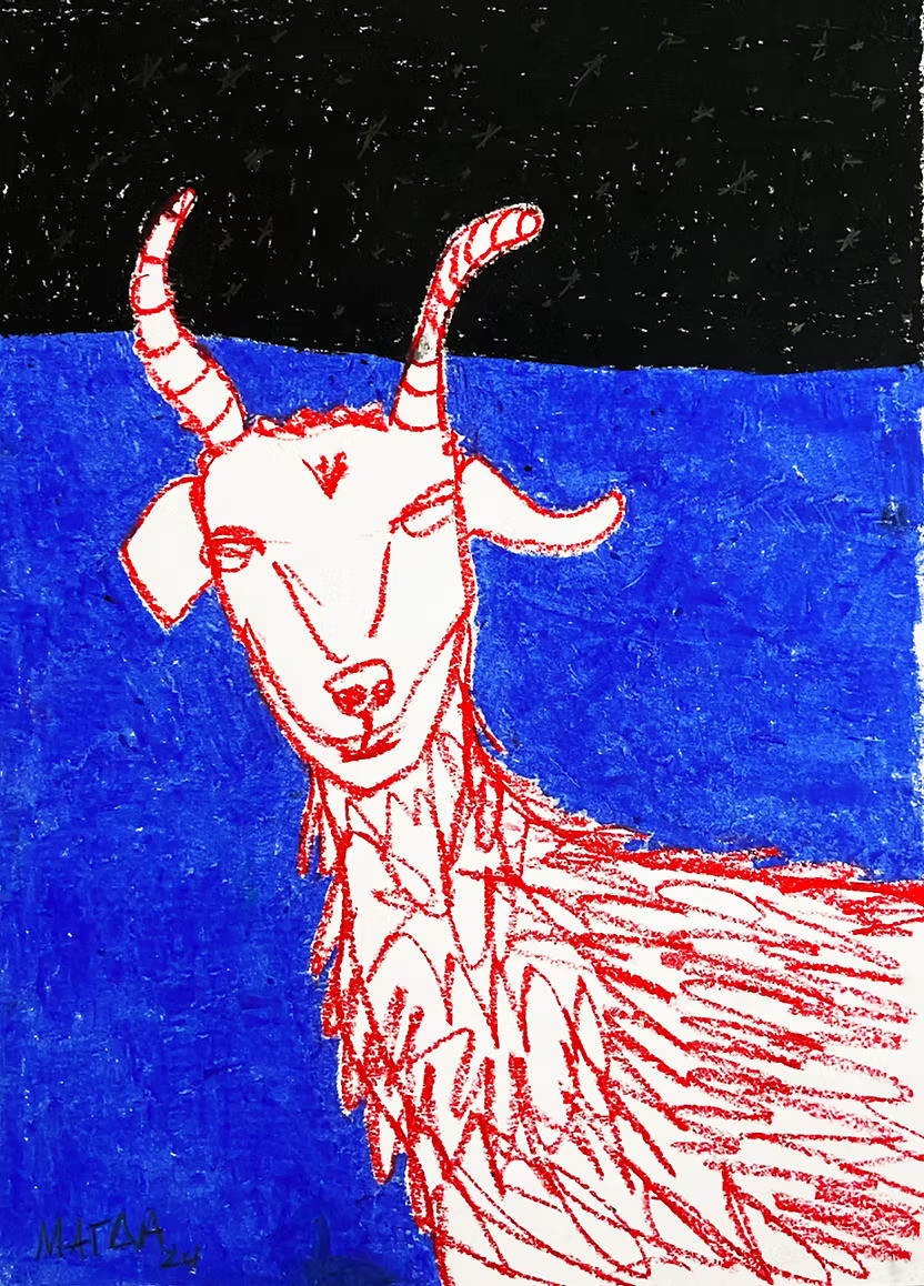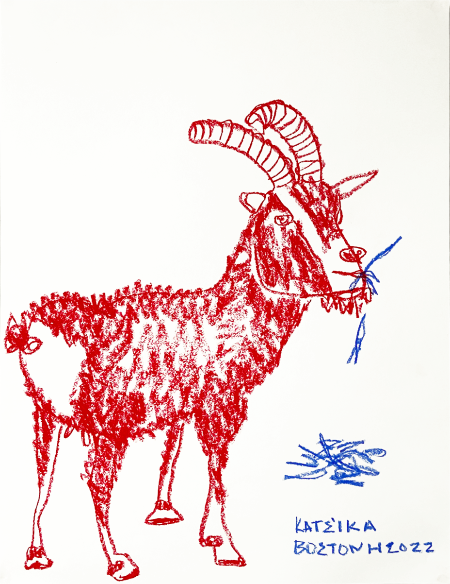Νοσταλγία, μνήμη και παιδικότητα. Για εμένα η κατσίκα σημαίνει Ελλάδα. Η λέξη αίγα προέρχεται από το αρχαίο ρήμα αΐσσω, δηλαδή πηδώ, εξού και οι κατσίκες ονομάστηκαν αίγες. Μάλιστα, οι αρχαίοι Έλληνες αποκαλούσαν και τα κύματα με το ίδιο όνομα καθώς πηδούν στη θάλασσα. Πολλοί πιθανολογούν ότι αντί για τον μύθο του Θησέα, το Αιγαίο Πέλαγος ονομάστηκε έτσι από τα κύματα που πηδούσαν στον γιαλό της θάλασσας. Πέρα, λοιπόν, από την ετυμολογική σύνδεση, προσωπικά από μικρή είχα μια εμμονή με τις κατσίκες. Ένας βοσκός τις έφερνε στο δίπλα στο εξοχικό μου να φάνε αγριόχορτα και τις παρακολουθούσα με δέος. Οι γονείς μου με φώναζαν «κατσικάκι» επειδή πάντα σκαρφάλωνα σε βράχους και δέντρα.