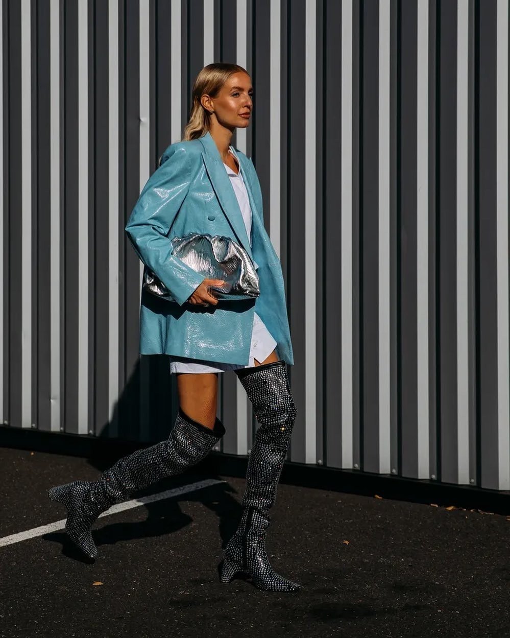 Ένα από τα υφάσματα που κυριαρχούν κατά τη διάρκεια των πιο κρύων μηνών είναι αδιαμφισβήτητα το δερμάτινο. Υπάρχουν πολλοί τρόποι για να το εντάξουμε στα everyday looks μας. Η Leonie Hanne επέλεξε ένα leather outwear σε γαλάζιο χρώμα, συνδυάζοντας το με τις μεγαλύτερες τάσεις της σεζόν, όπως τα oversized shirts και τα metallic designs.