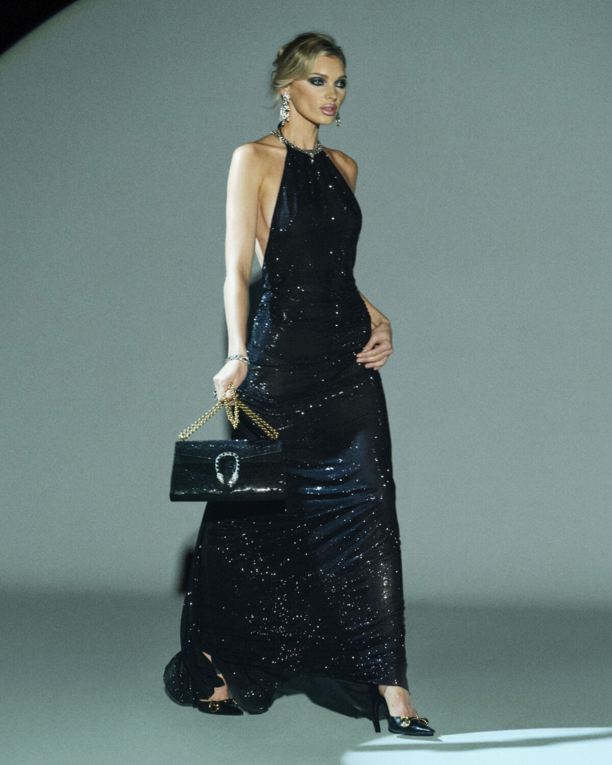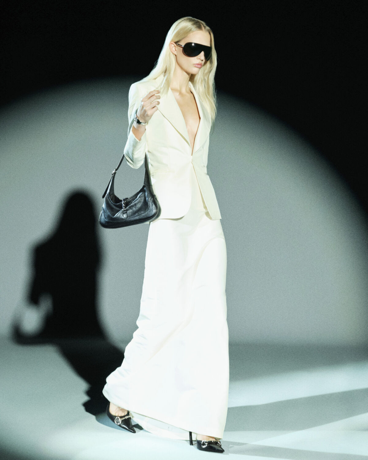 Το outerwear αποτελεί το πιο χαρακτηριστικό κεφάλαιο της συλλογής, ενώ βλέπουμε και κομμάτια εμπνευσμένα από εσώρουχα που συνδυάζονται με μεταξωτά blousons, draped μίνι και μίνιμαλ φορέματα από jersey και chiffon. Η έρευνα του Demna στις ‘70s και ‘90s συλλογές του Gucci εμφανίζεται σε racer jackets με web stripe, Double G αγκράφες, δερμάτινα και suede looks. Τα παπούτσια παραμένουν streamlined, από ballerinas επηρεασμένες από τη Valigeria μέχρι stilettos και ελαφριά loafers με μεταλλικές λεπτομέρειες. Ακόμα, οι τσάντες -Lunetta Phone+, η επανασχεδιασμένη Jackie 1961 και η Dionysus- ολοκληρώνουν τη συλλογή.