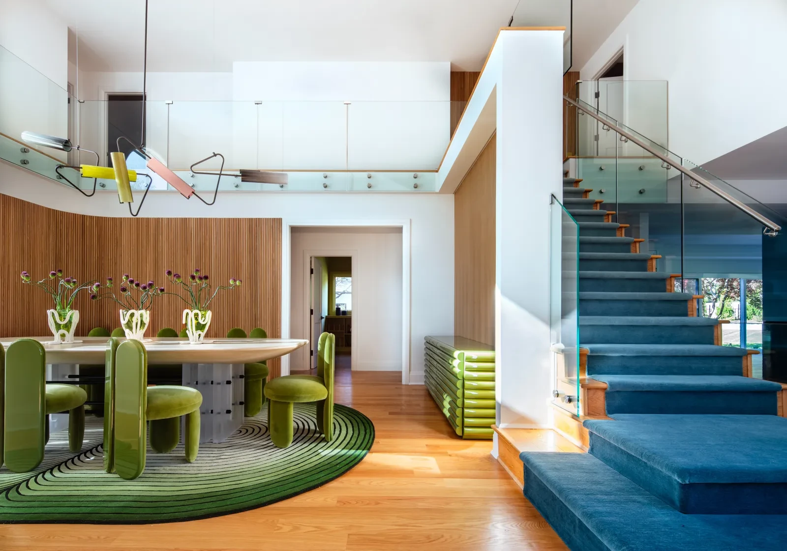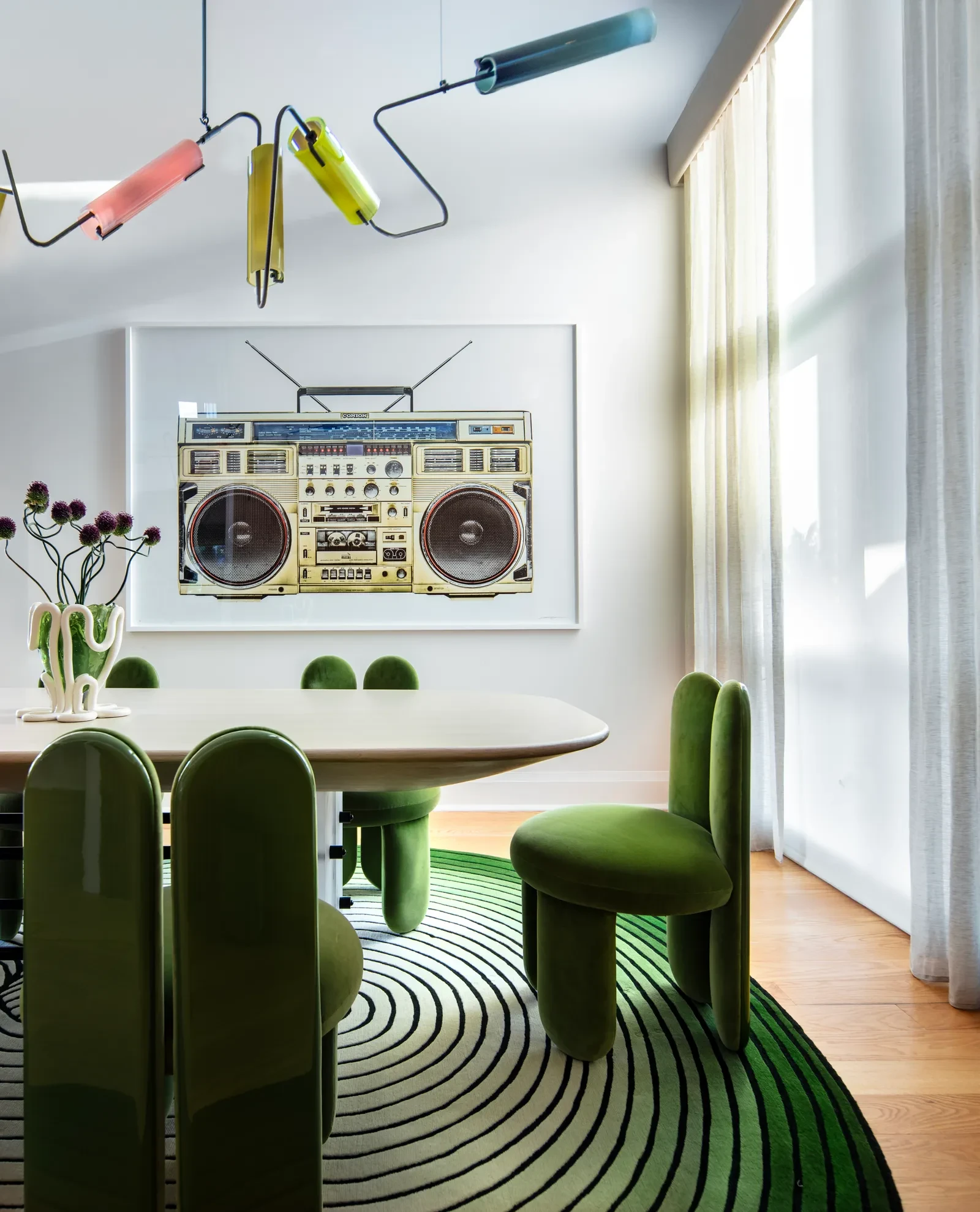 Στην άμεση συνέχεια του σαλονιού βρίσκεται η τραπεζαρία όπου παρουσιάζεται μια πιο σκοτεινή, πράσινη παλέτα. Ένας χώρος όπου η ρετρό αισθητική αναμειγνύεται με τη σύγχρονη τέχνη. Στο δάπεδο δεσπόζει ένα χαλί τύπου 'Op-Art' από την Art + Loom, το οποίο δημιουργεί οπτική κίνηση και βάθος. Το τραπέζι είναι φτιαγμένο από δρυ και ακρυλικό, ενώ οι οι καρέκλες 'Glazy' από Royal Stranger δίνουν μια παιχνιδιάρικη αλλά άνετη αίσθηση, συνδυάζοντας διαφορετικά υλικά σε ένα ενιαίο σύνολο. Στους τοίχους, έργα όπως το 'Boombox' του Lyle Owerko δημιουργούν άμεσες αναφορές στις πολιτιστικές ρίζες της οικογένειας, τιμώντας την αγάπη τους για τη μουσική.