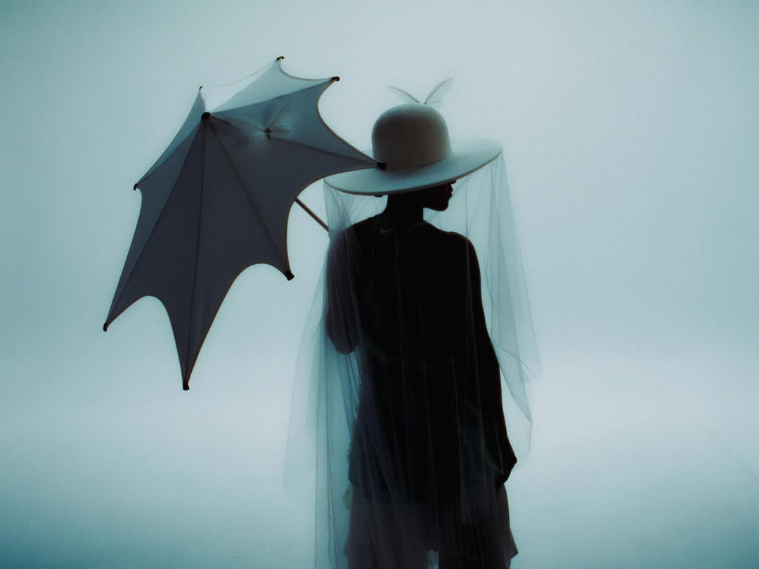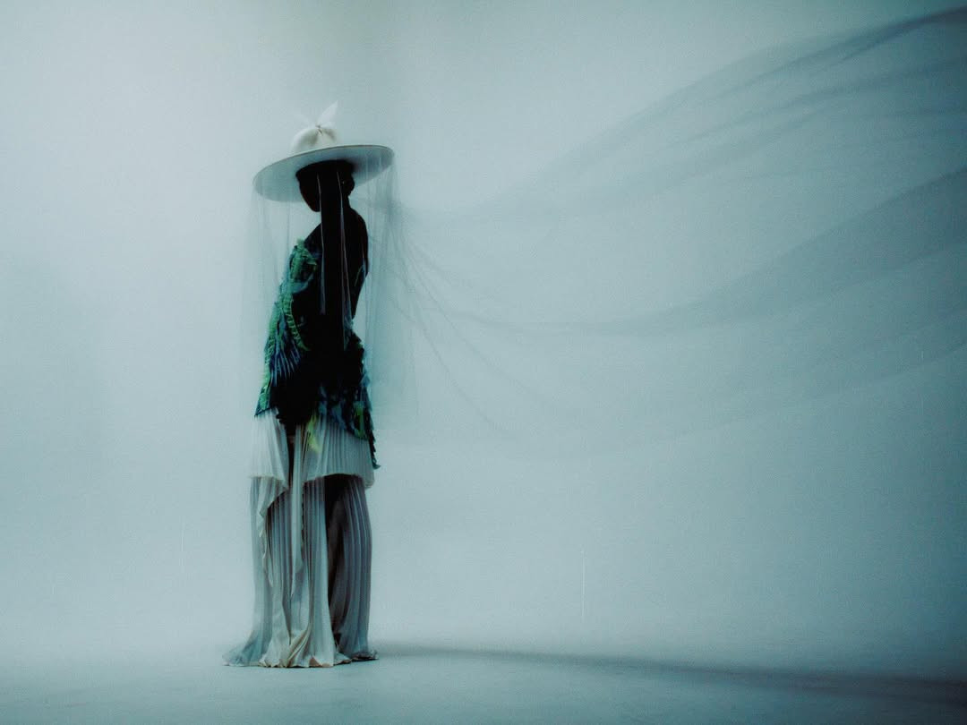 Η πλισέ μίνι φούστα φορεμένη πάνω από φαρδιά παντελόνα, το δραματικό καπέλο με φαρδύ γείσο και διάφανο λευκό πέπλο, αλλά και οι πεταλούδες που κοσμούσαν το καπέλο και την ομπρέλα, ολοκλήρωναν μια εικόνα σχεδόν ποιητική. Couture λεπτομέρειες, τοποθετημένες σε έναν χώρο που σπάνια φιλοξενεί τέτοια ένταση μόδας.